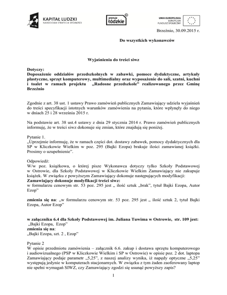 1 Brzeźnio, 30.09.2015 r. Do wszystkich wykonawców Wyjaśnienia