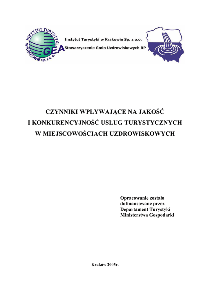 CZYNNIKI WPŁYWAJĄCE NA JAKOŚĆ I KONKURENCYJNOŚĆ USŁUG TURYSTYCZNYCH W MIEJSCOWOŚCIACH UZDROWISKOWYCH Opracowanie zostało dofinansowane przez Departament Turystyki Ministerstwa Gospodarki Kraków 2005r. Opracowano przez: Instytut Turystyki w Krakowie Sp. z o.o. Stowarzyszenie Gmin Uzdrowiskowych RP Zespół autorski: Dr Tadeusz Burzyński – kierownik projektu Dr Diana Dryglas Mgr Jan Golba Mgr Andrzej Bartosik Współpraca: Dr Michał Slawik Mgr Katarzyna Gmyrek-Gołąb Mgr Katarzyna Rymarczyk Wojciech Burzyński Łukasz Mróz 1 SPIS TREŚCI WSTĘP……………………………………………………………………………………...s. 4 ROZDZIAŁ I SPECYFIKA USŁUG TURYSTYCZNYCH I TOWARZYSZĄCYCH W GMINACH UZDROWISKOWYCH ………………………….………………………….s. 7 1. Usługa jako produkt……………………………………………………………………….s.7 1.1. Definiowanie produktu turystycznego…………………………….………………….s.7 1.2. Pojęcie produktu turystycznego uzdrowisk……………………..……………...........s.11 1.3. Cechy produktu turystycznego obszaru……………………………………………...s.16 2. Charakterystyka uzdrowisk w Polsce………………………………………………….…s.22 2.1. Podstawowe pojęcia, definicje i klasyfikacje dotyczące uzdrowisk………………..s.22 2.1.1. W literaturze zagranicznej…………………………………………………….s.22 2.1.2. W literaturze i ustawodawstwie polskim……………………………………...s.27 2.2. Przestrzenne rozmieszczenie uzdrowisk na terenie Polski………………………….s.34 3. Rodzaje usług w gminach uzdrowiskowych i ich specyfikacja …………………………s.40 3.1. Rodzaje świadczonych usług …….……………………………………………….…s.40 3.2. Podstawowe funkcje uzdrowisk w Polsce ……………………………………….….s.49 ROZDZIAŁ II PROBLEMATYKA JAKOŚCI I KONKURENCYJNOŚCI USŁUG TURYSTYCZNO-UZDROWISKOWYCH W TEORII I PRAKTYCE ….……….….s.58 1. Pojęcie jakości usług turystyczno-uzdrowiskowych………………….……………….…s.58 2. Sposoby pomiaru poziomu jakości usług…………………………………………….…..s.66 3. Analiza konkurencyjności usług turystyczno-uzdrowiskowych ……………….………..s.73 3.1. Benchmarking……………………………………………………………………..….s.73 3.2. Łańcuch wartości klienta…………………………………………………………..…s.75 4. Łańcuch wartości produktu turystycznego…………………………………………..…...s.84 ROZDZIAŁ III KRYTERIA WYODRĘBNIENIA PROFILI KLIENTA W MIEJSCOWOŚCIACH UZDROWISKOWYCH…...…………………….…………….s.90 1. Wielkość ruchu turystycznego w gminach uzdrowiskowych w Polsce……………….…s.92 1.1. Profil kuracjuszy i turystów korzystających z turystycznej i leczniczej bazy noclegowej …………………………………………………………………….……s.92 1.2. Stopień wykorzystania miejsc noclegowych w turystycznej i leczniczej bazie noclegowej………………………………………………………………………….s.101 1.3. Liczba udzielonych noclegów w turystycznej i leczniczej bazie noclegowej……...s.104 2 2. Baza noclegowa w gminach uzdrowiskowych w Polsce……………………………….s.108 2.1. Liczba obiektów turystycznej i leczniczej bazy noclegowej…………….…………s.108 2.2. Liczba miejsc noclegowych w turystycznej i leczniczej bazie noclegowej………..s.112 ROZDZIAŁ IV METODOLOGIA PRZEPROWADZONYCH BADAŃ RYNKU ...s.118 ROZDZIAŁ V PROFILE KURACJUSZY I TURYSTÓW ODWIEDZAJĄCYCH GMINY UZDROWISKOWE……………………………………………………………s.123 1. Segmentacja odbiorców usług turystyczno-uzdrowiskowych w gminach uzdrowiskowych ..............................................................................................................................................s.123 2. Identyfikacja cech odbiorców produktu turystycznego uzdrowisk…………………….S.133 ROZDZIAŁ VI CZYNNIKI WPŁYWAJĄCE NA KONKURENCYJNOŚĆ I JAKOŚĆ USŁUG TURYSTYCZNYCH W GMINACH UZDROWISKOWYCH …………….s.152 1. Produkt turystyczny uzdrowisk oparty na wiedzy………………………………………s.152 1.1. Orientacja marketingowa samorządów lokalnych oraz gospodarczych podmiotów turystycznych i uzdrowiskowych…………………………………………………..s.155 1.2. Zarządzanie jakością usług…………………………………………………………s.158 1.3. Kształcenie i szkolenie kadry w uzdrowiskach…………………………………….s.159 1.4. Zaawansowane technologie informatyczne i telekomunikacyjne………………….s.160 1.5. Współpraca podmiotów uczestniczących w kształtowaniu produktu turystycznego uzdrowisk…………………………………………………………………………..s.169 ROZDZIAŁ VII WNIOSKI I ZALECENIA DLA ADMINISTRACJI PUBLICZNEJ, BRANŻY TURYSTYCZNO-UZDROWISKOWEJ I OTOCZENIA TURYSTYKI..s.178 ZAKOŃCZENIE…………………………………………………………………………s.192 BIBLIOGRAFIA ………………………………………………………………………...s.198 SPIS TABEL………………………………………………………….…………………..s.203 SPIS RYSUNKÓW…………………………………………………………………….…s.204 SPIS WYKRESÓW……..……………………………………………………………..…s.205 ZAŁĄCZNIKI……………………………………………………………………………s.208 3 WSTĘP Trwałymi motywami podróżowania ludzi w róż
