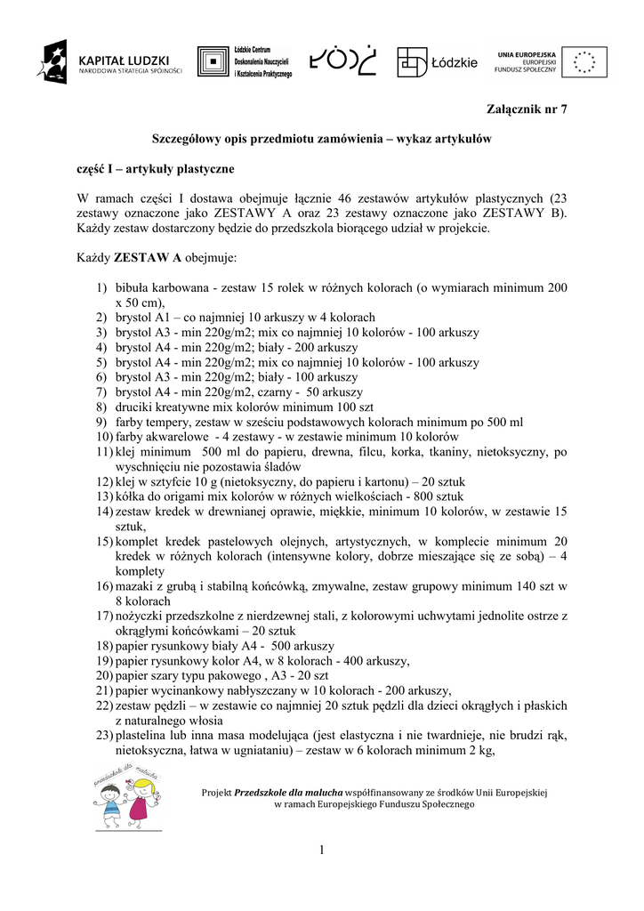 Załącznik nr 7 Szczegółowy opis przedmiotu zamówienia – wykaz artykułów część I – artykuły plastyczne W ramach części I dostawa obejmuje łącznie 46 zestawów artykułów plastycznych (23 zestawy oznaczone jako ZESTAWY A oraz 23 zestawy oznaczone jako ZESTAWY B). KaŜdy zestaw dostarczony będzie do przedszkola biorącego udział w projekcie. KaŜdy ZESTAW A obejmuje: 1) bibuła karbowana - zestaw 15 rolek w róŜnych kolorach (o wymiarach minimum 200 x 50 cm), 2) brystol A1 – co najmniej 10 arkuszy w 4 kolorach 3) brystol A3 - min 220g/m2; mix co najmniej 10 kolorów - 100 arkuszy 4) brystol A4 - min 220g/m2; biały - 200 arkuszy 5) brystol A4 - min 220g/m2; mix co najmniej 10 kolorów - 100 arkuszy 6) brystol A3 - min 220g/m2; biały - 100 arkuszy 7) brystol A4 - min 220g/m2, czarny - 50 arkuszy 8) druciki kreatywne mix kolorów minimum 100 szt 9) farby tempery, zestaw w sześciu podstawowych kolorach minimum po 500 ml 10) farby akwarelowe - 4 zestawy - w zestawie minimum 10 kolorów 11) klej minimum 500 ml do papieru, drewna, filcu, korka, tkaniny, nietoksyczny, po wyschnięciu nie pozostawia śladów 12) klej w sztyfcie 10 g (nietoksyczny, do papieru i kartonu) – 20 sztuk 13) kółka do origami mix kolorów w róŜnych wielkościach - 800 sztuk 14) zestaw kredek w drewnianej oprawie, miękkie, minimum 10 kolorów, w zestawie 15 sztuk, 15) komplet kredek pastelowych olejnych, artystycznych, w komplecie minimum 20 kredek w róŜnych kolorach (intensywne kolory, dobrze mieszające się ze sobą) – 4 komplety 16) mazaki z grubą i stabilną końcówką, zmywalne, zestaw grupowy minimum 140 szt w 8 kolorach 17) noŜyczki przedszkolne z nierdzewnej stali, z kolorowymi uchwytami jednolite ostrze z okrągłymi końcówkami – 20 sztuk 18) papier rysunkowy biały A4 - 500 arkuszy 19) papier rysunkowy kolor A4, w 8 kolorach - 400 arkuszy, 20) papier szary typu pakowego , A3 - 20 szt 21) papier wycinankowy nabłyszczany w 10 kolorach - 200 arkuszy, 22) zestaw pędzli – w zestawie co najmniej 20 sztuk pędzli dla dzieci okrągłych i płaskich z naturalnego włosia 23) plastelina lub inna masa modelująca (jest elastyczna i nie twardnieje, nie brudzi rąk, nietoksyczna, łatwa w ugniataniu) – zestaw w 6 kolorach minimum 2 kg, Projekt Przedszkole dla malucha współfinansowany ze środków Unii Europejskiej w ramach Europejskiego Funduszu Społecznego 1 24) zestaw kreatywny do wykonywania kartek, zaproszeń, lampionów składający się minimum ze 100 elementów takich jak arkusze róŜnych kolorów, faktur, kształtów i motywów – kartonów, papierów, folii, pianek wraz z drobnymi akcesoriami np. druciki, słomki, patyczki do wykorzystania w tworzeniu prac związanych z róŜnymi okresami w roku, KaŜdy ZESTAW B obejmuje: 1) kształtki papieru nadające się na laurkę, przywieszkę lub zaproszenie komplet 20 szt w jednakowym kształcie – 2 komplety, 2) segregator kartonowy lub teczka A4 - do przechowywania prac dzieci – 25 sztuk 3) blok papierów dekoracyjnych w tym transparentne 4) fizelina – co najmniej 10 arkuszy A4 w róŜnych kolorach , 5) filc kolorowy – co najmniej10 arkuszy A4 w róŜnych kolorach , 6) folie piankowe – co najmniej 10 arkuszy A4 w róŜnych kolorach , 7) beŜowa tektura falista - 100 arkuszy B4 8) kwadraty do origami (4cm), mix kolorów – 500 sztuk 9) kwadraty do origami z wzorami (8cm), mix kolorów – 200 sztuk 10) duŜe kwadraty do origami z wzorami (20 x 20 cm), - 100 sztuk 11) zestaw minimum 10 stempli z motywami figur geometrycznych – uchwyt plastikowy, motyw odbijany wykonany z twardej pianki nadający się do odbijania tuszem lub farbami – 3 komplety 12) poduszka do stempli – 3 sztuki 13) zestaw rafii naturalnej - zestaw 4 kolorów minimum po 50 g kaŜdy 14) kolekcja oczek - naklejek - 2000 sztuk 15) oczy ruchome do naklejania w róŜnych kształtach i rozmiarach - 100 szt 16) piórka ok. 80 g (minimum 700 sztuk) w róŜnych kolorach i rozmiarach od minimum 8 do maksimum 16 cm 17) kształtki piankowe do dekorowania (np. kwiatki, serca, motylki) - zestaw 500 szt w róŜnych kolorach i wielkościach 18) dwa zestawy elementów potrzebnych do zrobienia 24 sztuk wiatraczków (patyczek, łącznik, śmigiełka) 19) drewniane bączki do samodzielnego dekorowania przez dzieci - 24 sztuki 20) kształtki - papierowe twarze - 50 sztuk w 8 odcieniach 21) glina biała samoutwardzalna 500g – 10 sztuk 22) masa papierowa 420g – 10 sztuk 23) wstąŜeczki komplet minimum 10 szpul po 120 m, minimum w 8 kolorach i róŜnych rozmiarach od 3 do 8 mm szerokości 24) miniaturowe dzwoneczki, zestaw 100 szt w róŜnych rozmiarach do ozdabiania 25) brystol min 220g/m2; A4, biały - 200 arkuszy 26) brystol min 220g/m2; A3, biały - 100 arkuszy 27) brystol min 220g/m2; A3, co najmniej 10 kolorów - 100 arkuszy 28) zestaw kredy kolorowa do tablicy szkolnej (min 6 kolorów) Projekt Przedszkole dla malucha współfinansowany ze środków Unii Europejskiej w ramach Europejskiego Funduszu Społecznego 2 część II – artykuły biurowe. 1) tablice korkowe z drewnianą ramą do wywieszania ogłoszeń, wymiary 90 x 150 cm – 50 sztuk 2) wysokiej jakości kostka kartek samoprzylepnych o wymiarze 76x76 mm. W bloczku znajduje się co najmniej 400 kartek w 5 kolorach – 50 sztuk 3) ryza 250 arkuszy - Papier kolorowy do drukarki MIX minimum 4 kolorów - A4 - 160g – 50 sztuk, 4) ryza 250 arkuszy - Papier kolorowy do drukarki MIX minimum 4 kolorów - A4 - 80g - 25 sztuk, 5) blok do flipczartu gładki 20 arkuszy – 50 sztuk 6) tablica lub stojak ze sklejki lub aluminium do prezentacji plakatów w formacie max A2 min A3 z min dwoma kieszeniami na ulotki z pleksi przeźroczystej, które pozwalają zamieszczać informacje i ulotki – 25 sztuk 7) papier do drukarek biały A4 80g 2500 arkuszy – 25 sztuk 8) papier do drukarek biały A4 220g 250 arkuszy – 25 sztuk 9) zestaw etykiet samoprzylepnych, białych formatu A6, w arkuszach formatu A4, do st