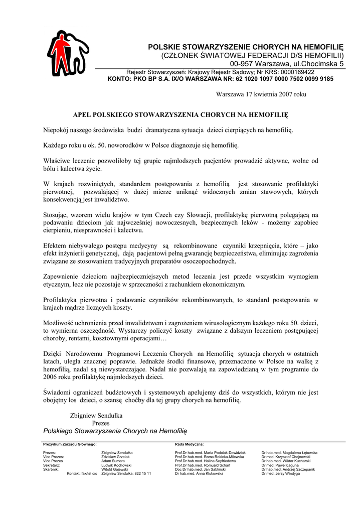 APEL Polskiego Stowarzyszenia Chorych na Hemofilię
