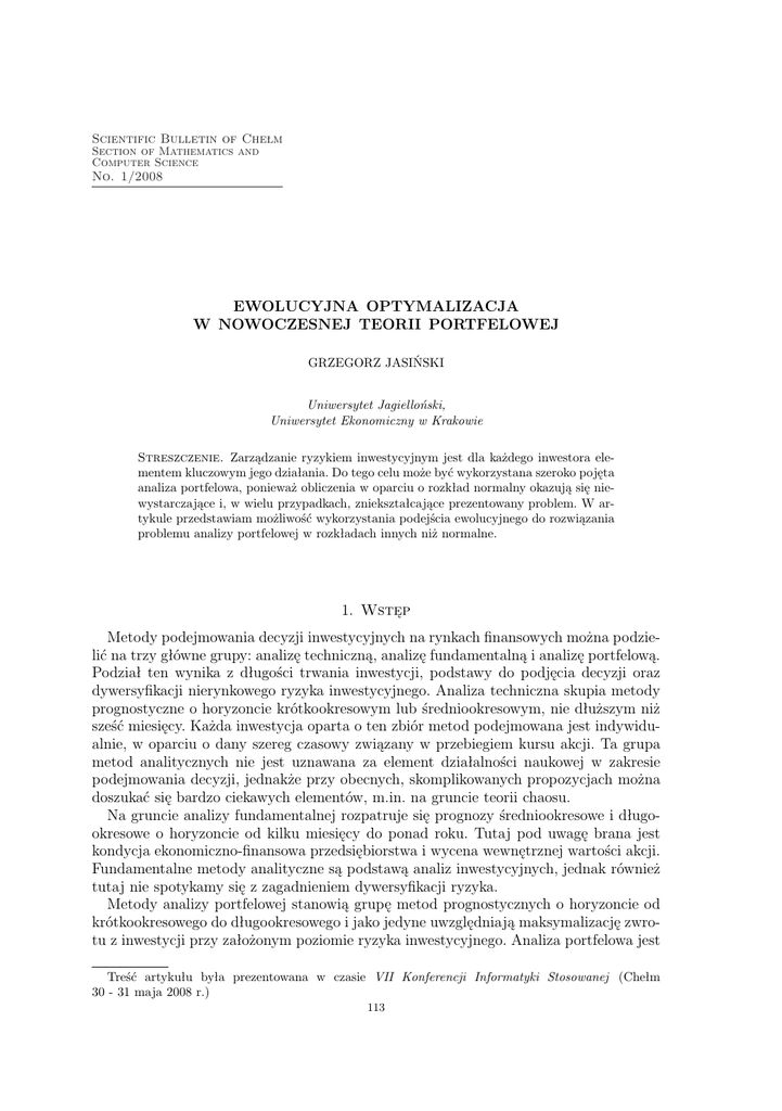 EWOLUCYJNA OPTYMALIZACJA W NOWOCZESNEJ TEORII PORTFELOWEJ
