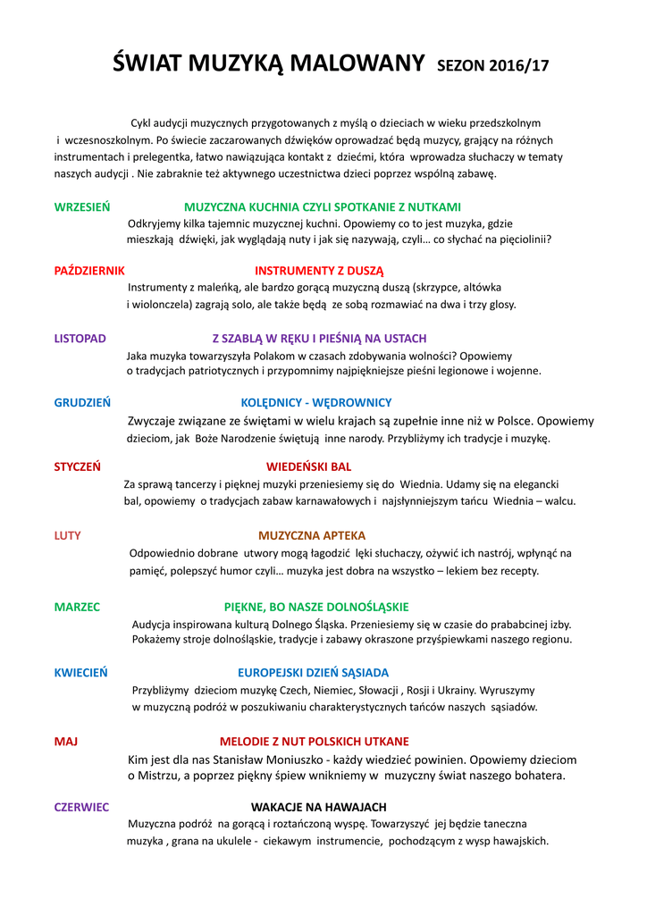 ŚWIAT MUZYKĄ MALOWANY SEZON 2016/17 Cykl audycji muzycznych przygotowanych z myślą o dzieciach w wieku przedszkolnym i wczesnoszkolnym. Po świecie zaczarowanych dźwięków oprowadzać będą muzycy, grający na różnych instrumentach i prelegentka, łatwo nawiązująca kontakt z dziećmi, która wprowadza słuchaczy w tematy naszych audycji . Nie zabraknie też aktywnego uczestnictwa dzieci poprzez wspólną zabawę. WRZESIEŃ MUZYCZNA KUCHNIA CZYLI SPOTKANIE Z NUTKAMI Odkryjemy kilka tajemnic muzycznej kuchni. Opowiemy co to jest muzyka, gdzie mieszkają dźwięki, jak wyglądają nuty i jak się nazywają, czyli… co słychać na pięciolinii? PAŹDZIERNIK INSTRUMENTY Z DUSZĄ Instrumenty z maleńką, ale bardzo gorącą muzyczną duszą (skrzypce, altówka i wiolonczela) zagrają solo, ale także będą ze sobą rozmawiać na dwa i trzy glosy. LISTOPAD Z SZABLĄ W RĘKU I PIEŚNIĄ NA USTACH Jaka muzyka towarzyszyła Polakom w czasach zdobywania wolności? Opowiemy o tradycjach patriotycznych i przypomnimy najpiękniejsze pieśni legionowe i wojenne. GRUDZIEŃ KOLĘDNICY - WĘDROWNICY Zwyczaje związane ze świętami w wielu krajach są zupełnie inne niż w Polsce. Opowiemy dzieciom, jak Boże Narodzenie świętują inne narody. Przybliżymy ich tradycje i muzykę. STYCZEŃ WIEDEŃSKI BAL Za sprawą tancerzy i pięknej muzyki przeniesiemy się do Wiednia. Udamy się na elegancki bal, opowiemy o tradycjach zabaw karnawałowych i najsłynniejszym tańcu Wiednia – walcu. LUTY MUZYCZNA APTEKA Odpowiednio dobrane utwory mogą łagodzić lęki słuchaczy, ożywić ich nastrój, wpłynąć na pamięć, polepszyć humor czyli… muzyka jest dobra na wszystko – lekiem bez recepty. MARZEC PIĘKNE, BO NASZE DOLNOŚLĄSKIE Audycja inspirowana kulturą Dolnego Śląska. Przeniesiemy się w czasie do prababcinej izby. Pokażemy stroje dolnośląskie, tradycje i zabawy okraszone przyśpiewkami naszego regionu. KWIECIEŃ EUROPEJSKI DZIEŃ SĄSIADA Przybliżymy dzieciom muzykę Czech, Niemiec, Słowacji , Rosji i Ukrainy. Wyruszymy w muzyczną podróż w poszukiwaniu charakterystycznych tańców naszych sąsiadów. MAJ CZERWIEC MELODIE Z NUT POLSKICH UTKANE Kim jest dla nas Stanisław Moniuszko - każdy wiedzieć powinien. Opowiemy dzieciom o Mistrzu, a poprzez piękny śpiew wnikniemy w muzyczny świat naszego bohatera. WAKACJE NA HAWAJACH Muzyczna podróż na gorącą i roztańczoną wyspę. Towarzyszyć jej będzie taneczna muzyka , grana na ukulele - ciekawym instrumencie, pochodzącym z wysp hawajskich.