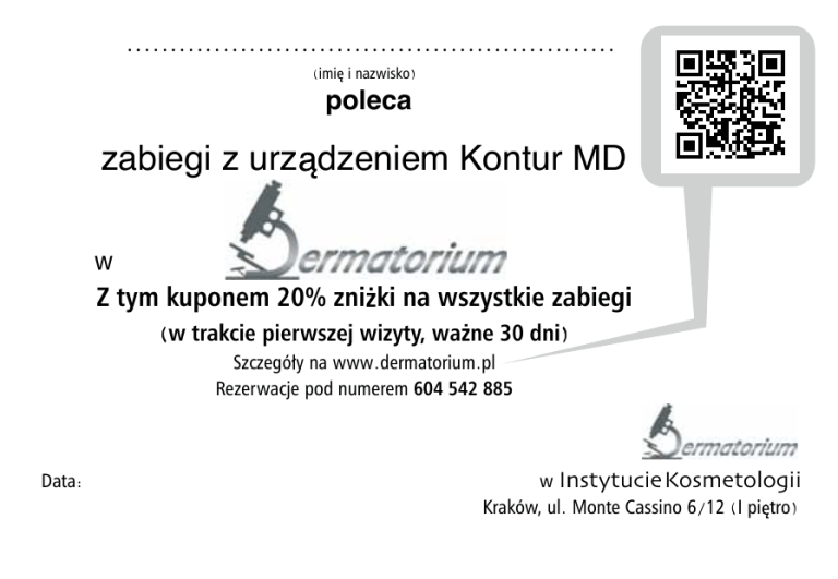 ........................................................ (imi i nazwisko) poleca zabiegi z urz dzeniem Kontur MD w Z tym kuponem 20% zni ki na wszystkie zabiegi (w trakcie pierwszej wizyty, wa ne 30 dni) Szczegó y na www.dermatorium.pl Rezerwacje pod numerem 604 542 885 Data: w InstytucieKosmetologii Kraków, ul. Monte Cassino 6/12 (I pi tro)