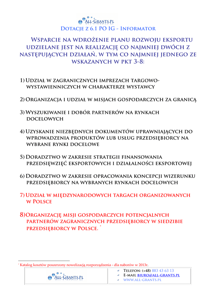 Dotacje z 6.1 PO IG - Informator Wsparcie na wdrożenie planu rozwoju eksportu udzielane jest na realizację co najmniej dwóch z następujących działań, w tym co najmniej jednego ze wskazanych w pkt 3-8: 1) Udział w zagranicznych imprezach targowowystawienniczych w charakterze wystawcy 2) Organizacja i udział w misjach gospodarczych za granicą 3) Wyszukiwanie i dobór partnerów na rynkach docelowych 4) Uzyskanie niezbędnych dokumentów uprawniających do wprowadzenia produktów lub usług przedsiębiorcy na wybrane rynki docelowe 5) Doradztwo w zakresie strategii finansowania przedsięwzięć eksportowych i działalności eksportowej 6) Doradztwo w zakresie opracowania koncepcji wizerunku przedsiębiorcy na wybranych rynkach docelowych 7) Udział w międzynarodowych targach organizowanych w Polsce 8) Organizację misji gospodarczych potencjalnych partnerów zagranicznych przedsiębiorcy w siedzibie przedsiębiorcy w Polsce. * * Katalog kosztów poszerzony nowelizacją rozporządzenia - dla naborów w 2013r. Telefon: (+48) 883 43 63 13 E-mail [email protected] www.all-grants.pl Dotacje z 6.1 PO IG - Informator Wydatkami kwalifikującymi się do objęcia wsparciem na wdrożenie planu rozwoju eksportu są wydatki poniesione po dniu złożenia wniosku o udzielenie wsparcia do dnia określonego w umowie o udzielenie wsparcia. Okres realizacji projektu, polegającego na wdrożeniu planu rozwoju eksportu, nie może przekroczyć 24 miesięcy. Do wydatków kwalifikujących się do objęcia wsparciem na wdrożenie planu rozwoju eksportu zalicza się wydatki: 1) Udział w zagranicznych imprezach targowo-wystawienniczych w charakterze wystawcy,: a) wynajęcie i zabudowę powierzchni wystawienniczej, b) zakup usług w zakresie obsługi technicznej stoiska, c) zakup usług w zakresie transportu eksponatów oraz elementów zabudowy wraz z ubezpieczeniem, odprawą celną i kosztami spedycji, d) podróże służbowe trzech osób uczestniczących w realizacji projektu, w okresie nie dłuższym niż dwa dni przed rozpoczęciem i jeden dzień po zakończeniu imprezy targowowystawienniczej, według stawek określonych w przepisach o wysokości oraz warunkach ustalania należności przysługujących pracownikowi zatrudnionemu w państwowej lub samorządowej jednostce sfery budżetowej z tytułu podróży służbowej poza granicami kraju, e) opłaty związane z uzyskaniem niezbędnych wiz oraz ubezpieczeniem dla osób uczestniczących w realizacji projektu, f) wpis do katalogu targowego, opłatę rejestracyjną oraz reklamę w mediach targowych, g) zakup usług w zakresie organizacji spotkań z potencjalnymi partnerami handlowymi, h) zakup usług doradczych w zakresie promocji podczas zagranicznych targów i wystaw, określenia potencjalnych partnerów handlowych, przygotowania ofert współpracy oraz negocjacji handlowych; 2) Organizacja i udział w misjach gospodarczych za granicą: a) zakup usługi polegającej na zorganizowaniu misji, b) zakup usługi polegającej na organizacji spotkań z potencjalnymi partnerami handlowymi, c) zakup usług doradczych w zakresie określenia potencjalnych partnerów handlowych, przygotowania ofert współpracy oraz negocjacji handlowych, d) podróże służbowe trzech osób uczestniczących w realizacji projektu, w okresie nie dłuższym niż jeden dzień przed rozpoczęciem i jeden dzień po dniu zakończenia misji, według stawek określonych w przepisach o wysokości oraz warunkach ustalania należności przysługujących pracownikowi zatrudnionemu w państwowej lub samorządowej jednostce sfery budżetowej z tytułu podróży służbowej poza granicami kraju, e) opłaty związane z uzyskaniem niezbędnych wiz oraz ubezpieczeniem dla osób uczestniczących w realizacji projektu, f) zakup biletów wstępu w celu zwiedzenia targów związanych z daną misją gospodarczą; Telefon: (+48) 883 43 63 13 E-mail [email protected] www.all-grants.pl Dotacje z 6.1 PO IG - Informator 3) Wyszukiwanie i dobór partnerów na rynkach docelowych a) zakup baz danych, b) zakup badań marketingowych, c) zakup usług prawnych związanych z wyszukiwaniem i doborem partnerów na rynkach docelowych, d) zakup usług doradczych w zakresie określenia, wyselekcjonowania, sprawdzenia wiarygodności grupy docelowej potencjalnych partnerów handlowych, przygotowania ofert współpracy oraz negocjacji handlowych, e) zakup usług w zakresie organizacji spotkań z wyselekcjonowanymi potencjalnymi partnerami handlowymi, f) podróże służbowe trzech osób uczestniczących w realizacji projektu, w okresie nie dłuższym niż jeden dzień przed rozpoczęciem i jeden dzień po planowanym spotkaniu z potencjalnymi partnerami handlowymi, według stawek określonych w przepisach o wysokości oraz warunkach ustalania należności przysługujących pracownikowi zatrudnionemu w państwowej lub samorządowej jednostce sfery budżetowej z tytułu podróży służbowej poza granicami kraju, g) opłaty związane z uzyskaniem niezbędnych wiz oraz ubezpieczeniem dla osób uczestniczących w realizacji projektu; 4) Uzyskanie niezbędnych dokumentów uprawniających do wprowadzenia produktów lub usług przedsiębiorcy na wybrane rynki docelowe a) zakup usług doradczych związanych z uzyskaniem certyfikatu, świadectwa lub atestu, b) zakup usług prawnych związanych z wprowadzeniem towarów lub usług na wybrane rynki docelowe, c) przygotowanie dokumentacji technicznej, d) transport i ubezpieczenie próbek wyrobu i dokumentacji technicznej wysyłanych do badań certyfikacyjnych, e) przeprowadzenie badań certyfikacyjnych, f) wystawienie i wydanie certyfikatu; 5) Doradztwo w zakresie działalności eksportowej: strategii finansowania przedsięwzięć eksportowych i a) opracowanie optymalnej strategii finansowania, b) wskazanie potencjalnych źródeł finansowania i identyfikacja dostępnych źródeł, c) rekomendację źródeł finansowania; 6) Doradztwo w zakresie opracowania koncepcji wizerunku przedsiębi