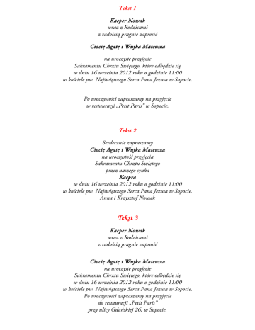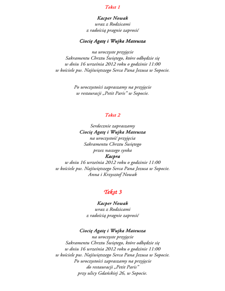 Tekst 1 Kacper Nowak wraz z Rodzicami z radością pragnie zaprosić Ciocię Agatę i Wujka Mateusza na uroczyste przyjęcie Sakramentu Chrztu Świętego, które odbędzie się w dniu 16 września 2012 roku o godzinie 11:00 w kościele pw. Najświętszego Serca Pana Jezusa w Sopocie. Po uroczystości zapraszamy na przyjęcie w restauracji „Petit Paris” w Sopocie. Tekst 2 Serdecznie zapraszamy Ciocię Agatę i Wujka Mateusza na uroczystość przyjęcia Sakramentu Chrztu Świętego przez naszego synka Kacpra w dniu 16 września 2012 roku o godzinie 11:00 w kościele pw. Najświętszego Serca Pana Jezusa w Sopocie. Anna i Krzysztof Nowak Tekst 3 Kacper Nowak wraz z Rodzicami z radością pragnie zaprosić Ciocię Agatę i Wujka Mateusza na uroczyste przyjęcie Sakramentu Chrztu Świętego, które odbędzie się w dniu 16 września 2012 roku o godzinie 11:00 w kościele pw. Najświętszego Serca Pana Jezusa w Sopocie. Po uroczystości zapraszamy na przyjęcie do restauracji „Petit Paris” przy ulicy Gdańskiej 26, w Sopocie. Tekst 4 Niniejszym mamy przyjemność zaprosić Babcię Babcię Amelię i Dziadka Janusza na uroczystość przyjęcia Sakramentu Chrztu Świętego przez naszego synka Kacpra w dniu 16 września 2012 roku o godzinie 11:00 w kościele pw. Najświętszego Serca Pana Jezusa w Sopocie. Agata i Krzysztof Nowak Honorem wielkim będzie nam gościć W. P. na przyjęciu z tej okazji, które odbędzie się w restauracji „Petit Paris” przy ulicy Gdańskiej 26, w Sopocie. Tekst 5 Pragnąc wspólnie przeżyć uroczystość przyjęcia Sakramentu Chrztu Świętego Kamilek Nowak wraz z rodzicami serdecznie zaprasza Ciocię Gosię i Wujka Damiana do udziału w mszy świętej, która odbędzie się dnia 16 września 2012 roku o godzinie 11:00 w kościele pw. Najświętszego Serca Pana Jezusa w Sopocie. Tekst 6 Niniejszym mamy przyjemność zaprosić Babcię Basię i Dziadka Mariana na uroczystość przyjęcia Sakramentu Chrztu Świętego przez naszą córkę Oliwię w dniu 16 września 2012 roku o godzinie 11:00 w kościele pw. Najświętszego Serca Pana Jezusa w Sopocie. Ewa i Marek Nowiccy Honorem wielkim będzie nam gościć W. P. na przyjęciu z tej okazji, które odbędzie się w naszym domu przy ulicy jasnej 36 w Sopocie. Tekst 7 Dnia 16 września 2012 roku o godzinie 11:00 moi rodzice zaniosą mnie do kościółka abym przyjął swój pierwszy sakrament Sakrament Chrztu Świętego Pragnę więc zaprosić Sz.P .................................................... aby towarzyszyli mi podczas tej uroczystości w kościele pw. Najświętszego Serca Pana Jezusa w Sopocie. Po mszy świętej serdecznie zapraszam na uroczysty obiad do Restauracji „Petit Paris” przy ulicy Gdańskiej 26, w Sopocie. Dominik Nowak z Rodzicami Tekst 8 Niniejszym mamy przyjemność zawiadomić że dnia 10 stycznia 2012 roku o godzinie 4.30 nad ranem przybyła na Świat Nasza córeczka Karolinka Dziecię ważyło 3,6 kg. mierzyło 50 cm. Jest bardzo podobne do mamusi i tatusia. Z tej oto okazji serdecznie zapraszamy Ciocię Agatę i Wujka Michała na uroczystość przyjęcia Sakramentu Chrztu Świętego w dniu 16 września 2012 roku o godzinie 11:00 przez naszą córeczkę Weronika i Jakub Kowalscy