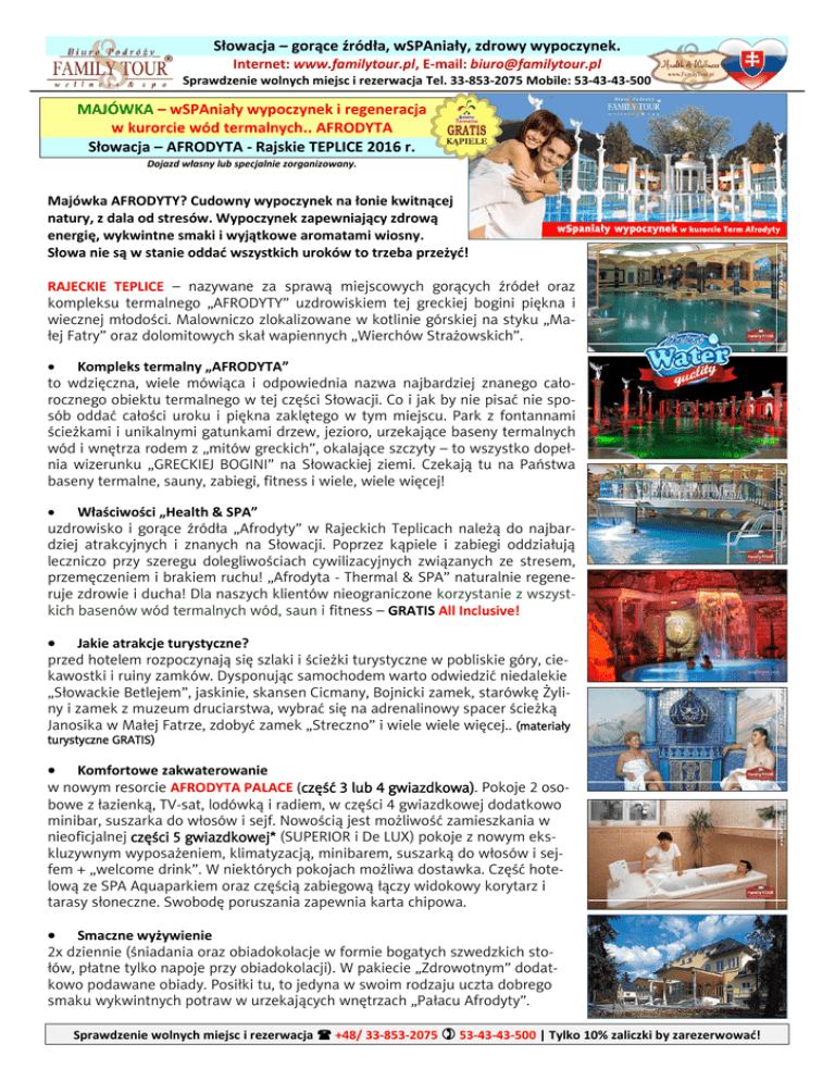 Słowacja – gorące źródła, wSPAniały, zdrowy wypoczynek. Internet: www.familytour.pl, E-mail: [email protected] Sprawdzenie wolnych miejsc i rezerwacja Tel. 33-853-2075 Mobile: 53-43-43-500 MAJÓWKA – wSPAniały wypoczynek i regeneracja w kurorcie wód termalnych.. AFRODYTA Słowacja – AFRODYTA - Rajskie TEPLICE 2016 r. Dojazd własny lub specjalnie zorganizowany. Majówka AFRODYTY? Cudowny wypoczynek na łonie kwitnącej natury, z dala od stresów. Wypoczynek zapewniający zdrową energię, wykwintne smaki i wyjątkowe aromatami wiosny. Słowa nie są w stanie oddać wszystkich uroków to trzeba przeżyć! RAJECKIE TEPLICE – nazywane za sprawą miejscowych gorących źródeł oraz kompleksu termalnego „AFRODYTY” uzdrowiskiem tej greckiej bogini piękna i wiecznej młodości. Malowniczo zlokalizowane w kotlinie górskiej na styku „Małej Fatry” oraz dolomitowych skał wapiennych „Wierchów Strażowskich”. Kompleks termalny „AFRODYTA” to wdzięczna, wiele mówiąca i odpowiednia nazwa najbardziej znanego całorocznego obiektu termalnego w tej części Słowacji. Co i jak by nie pisać nie sposób oddać całości uroku i piękna zaklętego w tym miejscu. Park z fontannami ścieżkami i unikalnymi gatunkami drzew, jezioro, urzekające baseny termalnych wód i wnętrza rodem z „mitów greckich”, okalające szczyty – to wszystko dopełnia wizerunku „GRECKIEJ BOGINI” na Słowackiej ziemi. Czekają tu na Państwa baseny termalne, sauny, zabiegi, fitness i wiele, wiele więcej! Właściwości „Health & SPA” uzdrowisko i gorące źródła „Afrodyty” w Rajeckich Teplicach należą do najbardziej atrakcyjnych i znanych na Słowacji. Poprzez kąpiele i zabiegi oddziałują leczniczo przy szeregu dolegliwościach cywilizacyjnych związanych ze stresem, przemęczeniem i brakiem ruchu! „Afrodyta - Thermal & SPA” naturalnie regeneruje zdrowie i ducha! Dla naszych klientów nieograniczone korzystanie z wszystkich basenów wód termalnych wód, saun i fitness – GRATIS All Inclusive! Jakie atrakcje turystyczne? przed hotelem rozpoczynają się szlaki i ścieżki turystyczne w pobliskie góry, ciekawostki i ruiny zamków. Dysponując samochodem warto odwiedzić niedalekie „Słowackie Betlejem”, jaskinie, skansen Cicmany, Bojnicki zamek, starówkę Żyliny i zamek z muzeum druciarstwa, wybrać się na adrenalinowy spacer ścieżką Janosika w Małej Fatrze, zdobyć zamek „Streczno” i wiele wiele więcej.. (materiały turystyczne GRATIS) Komfortowe zakwaterowanie w nowym resorcie AFRODYTA PALACE (część 3 lub 4 gwiazdkowa). Pokoje 2 osobowe z łazienką, TV-sat, lodówką i radiem, w części 4 gwiazdkowej dodatkowo minibar, suszarka do włosów i sejf. Nowością jest możliwość zamieszkania w nieoficjalnej części 5 gwiazdkowej* (SUPERIOR i De LUX) pokoje z nowym ekskluzywnym wyposażeniem, klimatyzacją, minibarem, suszarką do włosów i sejfem + „welcome drink”. W niektórych pokojach możliwa dostawka. Część hotelową ze SPA Aquaparkiem oraz częścią zabiegową łączy widokowy korytarz i tarasy słoneczne. Swobodę poruszania zapewnia karta chipowa. Smaczne wyżywienie 2x dziennie (śniadania oraz obiadokolacje w formie bogatych szwedzkich stołów, płatne tylko napoje przy obiadokolacji). W pakiecie „Zdrowotnym” dodatkowo podawane obiady. Posiłki tu, to jedyna w swoim rodzaju uczta dobrego smaku wykwintnych potraw w urzekających wnętrzach „Pałacu Afrodyty”. Sprawdzenie wolnych miejsc i rezerwacja +48/ 33-853-2075 53-43-43-500 | Tylko 10% zaliczki by zarezerwować! 2|Strona MAJÓWKA – wSPAniały, zdrowy wypoczynek w kurorcie wód termalnych.. AFRODYTA 2016 r. MAJÓWKA – pakiet: AFRODYTA PALACE część 3 gwiazdkowa: część 4 gwiazdkowa: część 5 gwiazdkowa*: Zdrowotny Regeneracja & Relaks 8 dni (7 nocy) 4 dni (3 noce) 5 dni (4 noce) 6 dni (5 nocy) 7 dni (6 nocy) 8 dni (7 nocy) 3295 zł/os. 3795 zł/os. 4195 zł/os. 1345 zł/os. 1595 zł/os. 1795 zł/os. 1695 zł/os. 1995 zł/os. 2245 zł/os. 2045 zł/os. 2375 zł/os. 2695 zł/os. 2295 zł/os. 2695 zł/os. 2995 zł/os. 2345 zł/os. 2745 zł/os. 3095 zł/os. Cena zawiera: • 3 / 4 / 5 / 6 lub 7 nocy w komfortowym AFRODYTA PALAC (3,4 lub 5 gwiazdek) • smaczne wyżywienie: śniadania i obiadokolacje - szwedzkie stoły • korzystanie z basenów wód termalnych (kryte i odkryte) – GRATIS All Inclusive • korzystanie z saun (fińska, parowa, solna.. co dzień rytuały) – GRATIS All Inclusive • bogatej infrastruktury (leżaki, stanowiska masaży, strefa SPA) – GRATIS All Inclusive • codziennie wieczorny festiwal światła i dźwięku przy basenach – GRATIS All Inclusive ZABIEGI w cenie pakietu „Regeneracja & Relaks” • 4 dni (3 noce): 1x masaż zdrowotny/tradycyjny, 2x zabiegi wodne, 1x masaż mechaniczny. • 5 dni (4 noce): 1x masaż zdrowotny/tradycyjny, 3x zabiegi wodne, 1x masaż mechaniczny. • od 6 dni (od 5 nocy): konsultacja lekarza specjalisty (dobór zabiegów) 2x zabiegi/dzień (bez niedzieli i świąt). Pakiet „Zdrowotny”: • od 8 dni (od 7nocy): konsultacja lekarza specjalisty (dobór zabiegów), 3x zabiegi/dzień (oprócz niedzieli i świąt + codziennie obiady /szwedzki stół/) • możliwość udziału w animacjach oraz programach kulturalnych • szlafrok, ręczniki, kosmetyki hotelowe, Internet WI-FI w pokoju i lobby barze • faktura VAT (polski rachunek) pozwalający skorzystać z funduszu socjalnego i odliczeń. • pakiet ubezpieczeń KL + NNW Signal Iduna z KL i NNW chorób przewlekłych do 10 000 € • parkowanie samochodu na terenie dozorowanym • przed wypoczynkiem, pomocne Informatory turystyczne • z Voucherem także mapa dojazdu i atrakcji turystycznych Cena nie zawiera: opłaty klimatycznej 0,9 €/dzień, pokój jednoosobowy +30%. Przejazd z Katowic +290 zł/os. Zniżki: dziecko do lat 3 - GRATIS, do lat 12 na dostawce -50%. Dorosły na dostawce – 25%, karta „Family Tour®”– 50 zł, wczesna re