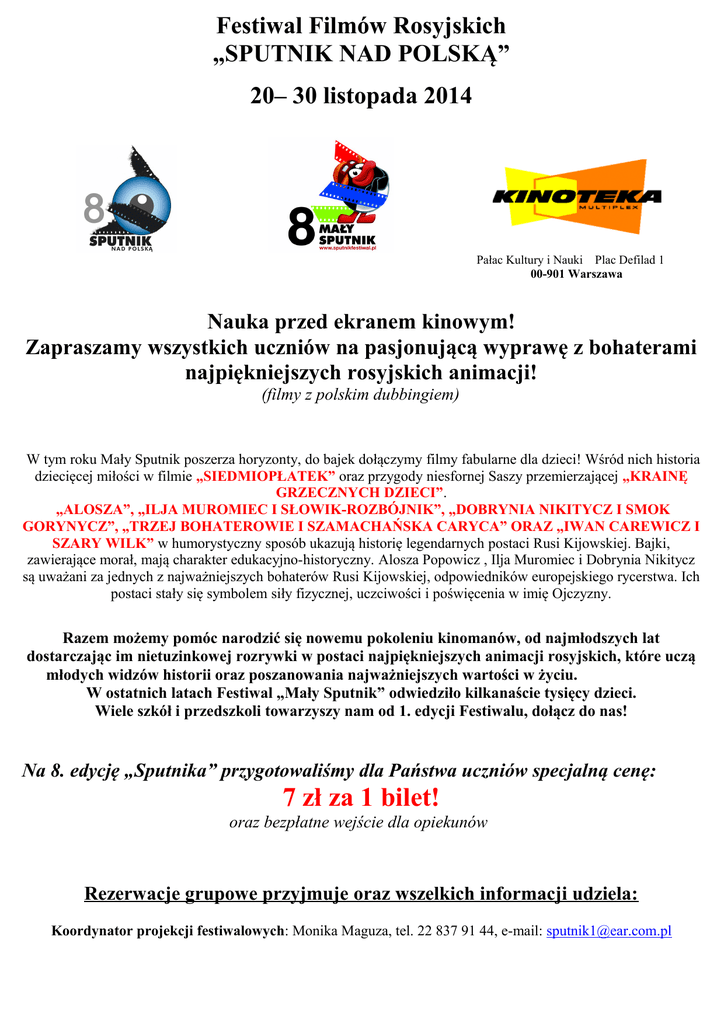 Festiwal Filmów Rosyjskich „SPUTNIK NAD POLSKĄ” 20– 30 listopada 2014 Pałac Kultury i Nauki Plac Defilad 1 00-901 Warszawa Nauka przed ekranem kinowym! Zapraszamy wszystkich uczniów na pasjonującą wyprawę z bohaterami najpiękniejszych rosyjskich animacji! (filmy z polskim dubbingiem) W tym roku Mały Sputnik poszerza horyzonty, do bajek dołączymy filmy fabularne dla dzieci! Wśród nich historia dziecięcej miłości w filmie „SIEDMIOPŁATEK” oraz przygody niesfornej Saszy przemierzającej „KRAINĘ GRZECZNYCH DZIECI”. „ALOSZA”, „ILJA MUROMIEC I SŁOWIK-ROZBÓJNIK”, „DOBRYNIA NIKITYCZ I SMOK GORYNYCZ”, „TRZEJ BOHATEROWIE I SZAMACHAŃSKA CARYCA” ORAZ „IWAN CAREWICZ I SZARY WILK” w humorystyczny sposób ukazują historię legendarnych postaci Rusi Kijowskiej. Bajki, zawierające morał, mają charakter edukacyjno-historyczny. Alosza Popowicz , Ilja Muromiec i Dobrynia Nikitycz są uważani za jednych z najważniejszych bohaterów Rusi Kijowskiej, odpowiedników europejskiego rycerstwa. Ich postaci stały się symbolem siły fizycznej, uczciwości i poświęcenia w imię Ojczyzny. Razem możemy pomóc narodzić się nowemu pokoleniu kinomanów, od najmłodszych lat dostarczając im nietuzinkowej rozrywki w postaci najpiękniejszych animacji rosyjskich, które uczą młodych widzów historii oraz poszanowania najważniejszych wartości w życiu. W ostatnich latach Festiwal „Mały Sputnik” odwiedziło kilkanaście tysięcy dzieci. Wiele szkół i przedszkoli towarzyszy nam od 1. edycji Festiwalu, dołącz do nas! Na 8. edycję „Sputnika” przygotowaliśmy dla Państwa uczniów specjalną cenę: 7 zł za 1 bilet! oraz bezpłatne wejście dla opiekunów Rezerwacje grupowe przyjmuje oraz wszelkich informacji udziela: Koordynator projekcji festiwalowych: Monika Maguza, tel. 22 837 91 44, e-mail: [email protected]
