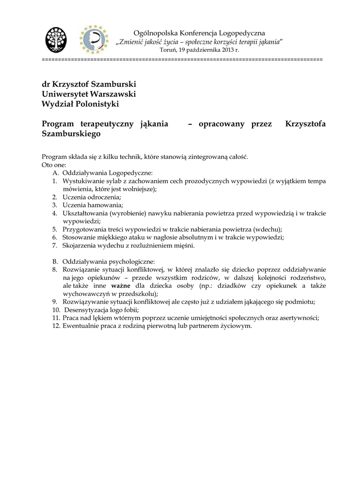 Ogólnopolska Konferencja Logopedyczna „Zmienić jakość życia – społeczne korzyści terapii jąkania” Toruń, 19 października 2013 r. ======================================================================================= dr Krzysztof Szamburski Uniwersytet Warszawski Wydział Polonistyki Program terapeutyczny jąkania Szamburskiego – opracowany przez Krzysztofa Program składa się z kilku technik, które stanowią zintegrowaną całość. Oto one: A. Oddziaływania Logopedyczne: 1. Wystukiwanie sylab z zachowaniem cech prozodycznych wypowiedzi (z wyjątkiem tempa mówienia, które jest wolniejsze); 2. Uczenia odroczenia; 3. Uczenia hamowania; 4. Ukształtowania (wyrobienie) nawyku nabierania powietrza przed wypowiedzią i w trakcie wypowiedzi; 5. Przygotowania treści wypowiedzi w trakcie nabierania powietrza (wdechu); 6. Stosowanie miękkiego ataku w nagłosie absolutnym i w trakcie wypowiedzi; 7. Skojarzenia wydechu z rozluźnieniem mięśni. B. Oddziaływania psychologiczne: 8. Rozwiązanie sytuacji konfliktowej, w której znalazło się dziecko poprzez oddziaływanie na jego opiekunów – przede wszystkim rodziców, w dalszej kolejności rodzeństwo, ale także inne ważne dla dziecka osoby (np.: dziadków czy opiekunek a także wychowawczyń w przedszkolu); 9. Rozwiązywanie sytuacji konfliktowej ale często już z udziałem jąkającego się podmiotu; 10. Desensytyzacja logo fobii; 11. Praca nad lękiem wtórnym poprzez uczenie umiejętności społecznych oraz asertywności; 12. Ewentualnie praca z rodziną pierwotną lub partnerem życiowym. Objawy jąkania Strach przed mówieniem Unikanie sytuacji społecznyc Nieprzystosowanie społeczne Schemat nr 1. Schemat przedstawiający skutki unikania przez dziecko sytuacji powodujących jąkanie Źródło: opracowanie na podstawie: K. Szamburski: w/pr. zb. Terapia w nerwicy jąkania się. Diagnoza i terapia osób jąkających się: Warsztaty Logopedyczne, Augustów, czerwiec 1997 Sprzeczne emocje, wymagania, normy Objawy jąkania Konflikt Redukcja lęku Lęk Predyspozycje do jąkania oraz zadziałanie czynnika wyzwalającego jąkanie Utrwalanie się objawów jąkania Schemat nr 2. Schemat przedstawiający objawy jąkania spowodowane nerwicą Źródło: opracowanie na podstawie: K. Szamburski: w/pr. zb. Terapia w nerwicy jąkania się. Diagnoza i terapia osób jąkających się: Warsztaty Logopedyczne, Augustów, czerwiec 1997 Dr Krzysztof Szamburski pracuje na stanowisku starszego wykładowcy w Pomagisterskim Studium Logopedycznym, przy Wydziale Polonistyki Uniwersytetu Warszawskiego oraz w charakterze logopedy w Specjalistycznej Poradni Psychologiczno-Pedagogicznej „TOP” w Warszawie. Od września 2011 roku jest jednocześnie dyrektorem tej poradni. Jest psychologiem i logopedą. Interesuje się psychologicznymi uwarunkowaniami zaburzeń mowy. Jego praca ma charakter zarówno teoretyczny, ponieważ zajmuje się działalnością naukową, jak i praktyczny − jest dydaktykiem w wyższej uczelni oraz pracuje jako logopeda w poradni psychologiczno − pedagogicznej. Jego głównym przedmiotem zainteresowań jest problem jąkania. Interesuje się też opóźnionym rozwojem mowy zarówno głośnej jak i pisanej. Jest terapeutą integracji sensorycznej. „Moim głównym przedmiotem zainteresowań jest problem jąkania. Uważam, i staram się to udowodnić, że jąkanie jest zaburzeniem emocjonalnym i zostaje wyuczone, ponieważ pierwotnie chroni podmiot przed lękiem, który jest konsekwencją przeżywanego konfliktu emocjonalnego. Taki pogląd, niezbyt popularny w Polsce, a chyba również na świecie, wiąże się ze specyficznym podejściem do terapii jąkania, która ma głównie charakter psychologiczny i zmierza do zrozumienia przez podmiot różnych mechanizmów determinujących jego aktualne funkcjonowanie a także wcześniejsze uwarunkowania tego, co dzieje się w teraźniejszości. Oddziaływania logopedyczne mają w tej terapii charakter pomocniczy, choć w pewnych jej etapach są bardzo ważne a czasami stają się jedyną dostępną formą niesienia pomocy. Miarą osiągniętego w terapii sukcesu jest pomyślne funkcjonowanie społeczne. Objawy jąkania mogą się utrzymywać jeszcze przez jakiś czas, ale ich występowanie przestaje być dla jednostki problemem albo ma marginalne znaczenie. W swojej terapeutycznej pracy zajmuję się dziećmi, młodzieżą, a także pacjentami dorosłymi. Prowadzę terapię indywidualną i grupową, a także rodzinną. Coraz więcej uwagi poświęcam mózgowym mechanizmom powstawania jąkania. Opracowałem neuropsychologiczną koncepcję tłumaczącą narodziny jąkania. Jej weryfikacja jest jednak bardzo trudna i wymaga badań aparaturowych, na przykład przy pomocy urządzenia wytwarzającego i obrazującego funkcjonalny rezonans magnetyczny (fMRI). Od kilkunastu lat moje zainteresowania terapeutyczne poszerzyły się i objęły dzieci z innymi niż jąkanie zaburzeniami rozwojowymi. Po uzyskaniu odpowiednich kwalifikacji staram się im pomagać zgodnie z zasadami teorii integracji sensorycznej (SI).”