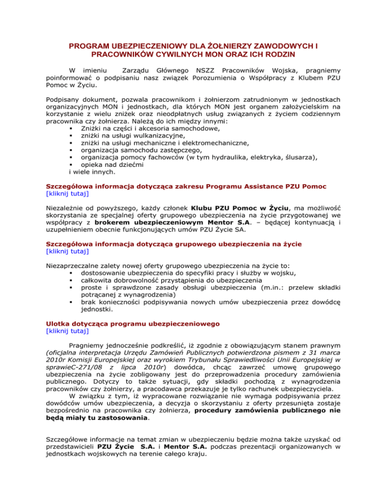 PROGRAM UBEZPIECZENIOWY DLA ŻOŁNIERZY ZAWODOWYCH I PRACOWNIKÓW CYWILNYCH MON ORAZ ICH RODZIN W imieniu Zarządu Głównego NSZZ Pracowników Wojska, pragniemy poinformować o podpisaniu nasz związek Porozumienia o Współpracy z Klubem PZU Pomoc w Życiu. Podpisany dokument, pozwala pracownikom i żołnierzom zatrudnionym w jednostkach organizacyjnych MON i jednostkach, dla których MON jest organem założycielskim na korzystanie z wielu zniżek oraz nieodpłatnych usług związanych z życiem codziennym pracownika czy żołnierza. Należą do ich między innymi: Zniżki na części i akcesoria samochodowe, zniżki na usługi wulkanizacyjne, zniżki na usługi mechaniczne i elektromechaniczne, organizacja samochodu zastępczego, organizacja pomocy fachowców (w tym hydraulika, elektryka, ślusarza), opieka nad dziećmi i wiele innych. Szczegółowa informacja dotycząca zakresu Programu Assistance PZU Pomoc [kliknij tutaj] Niezależnie od powyższego, każdy członek Klubu PZU Pomoc w Życiu, ma możliwość skorzystania ze specjalnej oferty grupowego ubezpieczenia na życie przygotowanej we współpracy z brokerem ubezpieczeniowym Mentor S.A. – będącej kontynuacją i uzupełnieniem obecnie funkcjonujących umów PZU Życie SA. Szczegółowa informacja dotycząca grupowego ubezpieczenia na życie [kliknij tutaj] Niezaprzeczalne zalety nowej oferty grupowego ubezpieczenia na życie to: dostosowanie ubezpieczenia do specyfiki pracy i służby w wojsku, całkowita dobrowolność przystąpienia do ubezpieczenia proste i sprawdzone zasady obsługi ubezpieczenia (m.in.: przelew składki potrącanej z wynagrodzenia) brak konieczności podpisywania nowych umów ubezpieczenia przez dowódcę jednostki. Ulotka dotycząca programu ubezpieczeniowego [kliknij tutaj] Pragniemy jednocześnie podkreślić, iż zgodnie z obowiązującym stanem prawnym (oficjalna interpretacja Urzędu Zamówień Publicznych potwierdzona pismem z 31 marca 2010r Komisji Europejskiej oraz wyrokiem Trybunału Sprawiedliwości Unii Europejskiej w sprawieC-271/08 z lipca 2010r) dowódca, chcąc zawrzeć umowę grupowego ubezpieczenia na życie zobligowany jest do przeprowadzenia procedury zamówienia publicznego. Dotyczy to także sytuacji, gdy składki pochodzą z wynagrodzenia pracowników czy żołnierzy, a pracodawca przekazuje je tylko rachunek ubezpieczyciela. W związku z tym, iż wypracowane rozwiązanie nie wymaga podpisywania przez dowódców umów ubezpieczenia, a decyzja o skorzystaniu z oferty przesunięta zostaje bezpośrednio na pracownika czy żołnierza, procedury zamówienia publicznego nie będą miały tu zastosowania. Szczegółowe informacje na temat zmian w ubezpieczeniu będzie można także uzyskać od przedstawicieli PZU Życie S.A. i Mentor S.A. podczas prezentacji organizowanych w jednostkach wojskowych na terenie całego kraju. Wszelkie pytania dotyczące programu oraz sposobu wdrażania należy kierować do Mentor SA: Michał Perl – Dyrektor Biura Ubezpieczeń na Życie tel. 056 669 33 93 Łukasz Hafka Z-ca Dyrektora Biura Ubezpieczeń na Życie tel. 056 669 32 31 Radosław Mielczarek – Kierownik Działu Ubezpieczeń Zdrowotnych tel 056 669 32 21 Katarzyna Dorosz-Kulwicka - Koordynator programu tel. 056 669 33 91 kom. 609 061 244 Przemysław Groszewski - Koordynator programu tel. 056 669 33 20 kom. 601 619 240