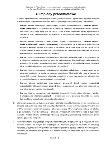 Załącznik nr 18 do Zasad i trybu postępowania rekrutacyjnego na I rok studiów w Warszawskim Uniwersytecie Medycznym na rok akademicki 2011 / 2012 Olimpiady przedmiotowe 1. W pierwszej kolejności na studia przyjmowani są laureaci i finaliści wymienionych poniżej olimpiad przedmiotowych. Są oni umieszczani na najwyższym miejscu listy rankingowej kandydatów. 1) laureaci stopnia centralnego (najwyższego) olimpiad przedmiotowych z: biologii, chemii, fizyki, matematyki – przyjmowani są w pierwszej kolejności na wszystkie kierunki studiów. Możliwość taką mają wyłącznie te osoby, które zostały laureatami wyżej wymienionych olimpiad w roku kalendarzowym rekrutacji lub w roku kalendarzowym poprzedzającym rok rekrutacji; 2) finaliści stopnia centralnego (najwyższego) olimpiad przedmiotowych z: biologii, chemii, fizyki, matematyki i wiedzy ekologicznej – przyjmowani są w pierwszej kolejności na wszystkie kierunki studiów licencjackich. Możliwość taką mają wyłącznie te osoby, które zostały finalistami wyżej wymienionych olimpiad w roku kalendarzowym rekrutacji lub w roku kalendarzowym poprzedzającym rok rekrutacji; 3) laureaci stopnia centralnego (najwyższego) olimpiady pielęgniarskiej – przyjmowani są w pierwszej kolejności na studia na kierunku pielęgniarstwo. Możliwość taką mają wyłącznie te osoby, które zostały laureatami olimpiady pielęgniarskiej w roku kalendarzowym rekrutacji lub w roku kalendarzowym poprzedzającym rok rekrutacji; 4) laureaci stopnia centralnego (najwyższego) olimpiady położniczej – przyjmowani są w pierwszej kolejności na studia na kierunku położnictwo. Możliwość taką mają wyłącznie te osoby, które zostały laureatami olimpiady położniczej w roku kalendarzowym rekrutacji lub w roku kalendarzowym poprzedzającym rok rekrutacji; 5) laureaci stopnia centralnego (najwyższego) pierwszych trzech miejsc regionalnej mazowieckiej olimpiady wiedzy przyrodniczej – przyjmowani są w pierwszej kolejności na wszystkie kierunki studiów licencjackich; 6) laureaci stopnia centralnego (najwyższego) pierwszych trzech miejsc olimpiady wiedzy i umiejętności stomatologicznych – przyjmowani są w pierwszej kolejności na studia licencjackie na specjalności higiena stomatologiczna. 2. Warunkiem przyjęcia na studia w pierwszej kolejności laureatów/finalistów wyżej wymienionych olimpiad jest spełnienie przez nich warunków formalnych, a więc terminowe zarejestrowanie się w IRK, wniesienie opłaty rekrutacyjnej i złożenie, poprzez IRK, kompletnej aplikacji na studia, a po ogłoszeniu wyników rekrutacji – złożenie wymaganych dokumentów wraz z dyplomem laureata / finalisty stopnia centralnego właściwej olimpiady przedmiotowej, wystawionym przez komitet główny tej olimpiady. 3. Finalistom stopnia najwyższego olimpiad przedmiotowych, ubiegającym się o przyjęcie na takie kierunki studiów, na których nie przysługuje im możliwość przyjęcia na studia w pierwszej kolejności, przyznaje się 100 punktów za określony przedmiot będący kryterium kwalifikacyjnym. Podstawą do naliczenia tych punktów jest dyplom finalisty lub odpowiedni wpis na świadectwie maturalnym. Strona 1 z 2 Załącznik nr 18 do Zasad i trybu postępowania rekrutacyjnego na I rok studiów w Warszawskim Uniwersytecie Medycznym na rok akademicki 2011 / 2012 Przykład. Kandydat, będący finalistą etapu centralnego olimpiady z biologii, ubiega się o przyjęcie na studia jednolite na kierunku lekarskim. Ponieważ osoba ta nie jest laureatem danej olimpiady, nie może być przyjęta na studia w pierwszej kolejności. W postępowaniu kwalifikacyjnym otrzymuje jednak maksymalną liczbę 100 punktów z biologii. Warunkiem jest spełnienie wszystkich kryteriów formalnych oraz złożenie w uczelni dyplomu finalisty olimpiady lub świadectwa maturalnego zawierającego odpowiedni wpis potwierdzający fakt bycia finalistą olimpiady z biologii. Laureatom i finalistom etapu centralnego olimpiad z języków obcych, którzy zostali zwolnieni z egzaminu maturalnego z danego języka na podstawie dyplomu laureata lub finalisty olimpiady, przyznaje się w ramach kwalifikacji konkursowej 100 punktów za ten język obcy. Zasada ta dotyczy wyłącznie tych kierunków i specjalności, w przypadku których jednym z kryteriów kwalifikacyjnych jest wynik z egzaminu maturalnego z języka obcego. Podstawą do naliczenia tych punktów jest dyplom laureata/finalisty olimpiady i/lub odpowiedni wpis na świadectwie maturalnym. Przykład. Kandydat, będący laureatem olimpiady z języka angielskiego, ubiega się o przyjęcie na studia licencjackie na kierunku pielęgniarstwo. Jednym z kryteriów kwalifikacji kandydatów na ten kierunek jest wynik egzaminu maturalnego z języka obcego nowożytnego. Zatem w postępowaniu kwalifikacyjnym dany kandydat uzyskuje maksymalną liczbę 100 punktów z języka obcego, którym w tym przypadku jest język angielski. Warunkiem jest spełnienie wszystkich kryteriów formalnych oraz złożenie w uczelni dyplomu laureata olimpiady i/lub świadectwa maturalnego zawierającego odpowiedni wpis potwierdzający fakt bycia laureatem olimpiady z języka angielskiego. Strona 2 z 2