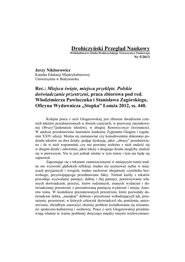 Drohiczyński Przegląd Naukowy Wielokulturowe Studia Drohiczyńskiego Towarzystwa Naukowego Nr 5/2013 Jerzy Nikitorowicz Katedra Edukacji Międzykulturowej Uniwersytetu w Białymstoku Rec.: Miejsca święte, miejsca przeklęte. Polskie doświadczanie przestrzeni, praca zbiorowa pod red. Włodzimierza Pawluczuka i Stanisława Zagórskiego, Oficyna Wydawnicza „Stopka” Łomża 2012, ss. 440. Kolejna praca z serii Glogerowskiej jest zbiorem dwudziestu czterech tekstów przedstawionych w dwóch częściach; w pierwszej zatytułowanej Obrazy”(jedenaście tekstów), w drugiej Reminiscencje (trzynaście). W aneksie przedstawiono laureatów konkursu Zygmunta Glogera i regulamin XXIV edycji. Można się zastanawiać czy konsekwentnie dokonano podziału tekstów na dwa działy; podjąć dyskusję, jakie „obrazy” przedstawiano i ile w nich wspomnień, czy nie powinny niektóre z nich znaleźć się w drugim dziale i odwrotnie, jakie teksty z drugiego działu mogłyby znaleźć się w pierwszym. Nie to jest jednak istotne w tym tomie i tym nie będę się zajmował. Zapoznając się z tekstami zamieszczonymi w niniejszym tomie trudno nie wyzwolić głębokich refleksji, trudno nie usytuować siebie w miejscach przyjaznych i wrogich, trudno zachować obojętność czytelnika bezwolnego, przyswajającego przedstawiane fakty. Niemal każdy z tekstów powoduje wyzwalanie pamięci, dobrej i złej pamięci, porównywanie własnych doświadczeń, przeżyć, losów rodzinnych, znanych wydarzeń i doświadczanej przestrzeni z prezentowaną pamięcią wydarzeń i miejsc Autorów tomu. W kontekście prezentowanych przestrzeni, które pozwalały doświadczać dobra, „nasiąkać” dobrem i przestrzeni wzbudzających lęk, przerażenie, przestrzeni, w których człowiek doświadczył zła, poniżenia, unicestwienia, chciałbym zauważyć złożony problem kształtowania się tożsamości społeczno-kulturowej i osobowej. Prace z serii Glogerowskiej przedstawiają właśnie te ważne problemy dotyczące między innymi wielowymiaro- 290 Jerzy Nikitorowicz wego życia człowieka i jego usytuowania w świecie. Informują, wartościują, dokonują refleksji i motywują do niej czytelnika. Dokonują wartościowania i oceny, jak też pytają i próbują odpowiadać na formułowane pytania: jak przedstawia się życie codzienne, co z kulturą ludową, jaka jest moralność Polaków, co z autorytetami, kulturą polityczną, centrami i peryferiami, wolnością i bezwolnością mediów, prawdą i fałszem itp. Zachęcają ustawicznie czytelnika do dyskusji z sobą i z innymi, do dialogu wewnętrznego i zewnętrznego, do dokonywania samooceny, analizy stereotypów, uprzedzeń, naszych lęków, stanów wzniosłych i radosnych. Dotychczas ukazało się już szesnaście prac z tej serii wydawanych przez Oficynę Wydawniczą „Stopka” w Łomży. Już same tytuły wydają się być interesujące i ważne społecznie. Są to między innymi: Czy zmierzch kultury ludowej, Centra i peryferie, Moralność Polaków, Życie codzienne Polaków, Polacy o sobie, Polska i jej sąsiedzi, W co wierzymy, Czego się boimy, Co kochamy. W tym ostatnio wydanym tomie wydaje się dominować nurt tożsamościowy i w nim właśnie postrzegam jej wartość, jak też w podtytule – Polskie doświadczenie przestrzeni. Nam Polakom ciągle trudno się pogodzić z przedstawianymi faktami, że na przykład w czasie II wojny światowej były wydarzenia i postacie (Polacy), które przyniosły nam wstyd i hańbę. Nasza historia to przecież tragiczne losy wielu pokoleń i tam gdzie jest możliwość oddajemy cześć i honor naszym rodakom w kraju i za granicą. Jesteśmy dumni z powstania warszawskiego, kampanii wrześniowej, ruchu oporu i pomocy Żydom, z generałów Władysława Sikorskiego, Władysława Andersa, ale także z Ireny Sendlerowej, Maksymiliana Kolbe, z wielu zwykłych ludzi, którzy swoimi czynami wzbudzają naszą aprobatę i szacunek. Mamy wielu znanych i cenionych patronów instytucji edukacyjnych, na przykład generał Ludwik Michał Pac, bohater narodowy i reformator gospodarczy, który żył w latach 1778-1835. Jako właściciel dóbr Dowspudy sprowadził tam osadników niemieckich, szkockich i angielskich aby wprowadzali nowoczesne metody gospodarowania. Za udział w powstaniu listopadowym jego dobra skonfiskowano a on udał się na emigrację do Francji. We wstępie Janusz Tazbir zwraca uwagę, że trudno przejść obojętnie wobec wielu miejsc świętych, tak samo jak i wobec miejsc przeklętych. Zajmując się między innymi przemianami świadomości historycznej wskazuje na potrzebę kolejnej pracy pod tytułem Od nostalgii do przyswojenia. Zauważa, że w historii pewne miejsca dla wiernych święte, dla rządu były miejscami przeklętymi. Podobnie, w zależności od wyznania czy narodowości, niektóre z miejsc przeklętych uznawane są jako miejsca święte. Rec.: „Miejsca święte, miejsca przeklęte. Polskie doświadczanie przestrzeni…” 291 Współredaktor tomu, Włodzimierz Pawluczuk pisze, że w pierwotnym zamyśle niniejszy tom miał mieć tytuł Miejsca święte i przeklęte. Zostając redaktorem tej edycji, uznałem, iż jest on nieadekwatny do zamysłu publikacji, rzecz bowiem ma być o miejscach świętych i miejscach przeklętych jako obiektach przestrzeni naznaczonych stygmatem świętości lub przeciwnie – syndromem zła (s. 415). Potraktowanie tych miejsc rozłącznie z pewnością przyczyniło się – spowodowało, że Autorzy podjęli próbę przedstawienia miejsc otaczanych szacunkiem, uświęconych tradycją, i uświadomili sobie miejsca związane z tragicznymi przeżyciami, wzbudzające lęk, pogardę, przerażenie, miejsca w których tkwiło zło. *** Każdy z Autorów wypowiadający się w niniejszej pracy, bez względu na to, czy została jego wypowiedź umieszczona w dziale Obrazy czy Reminiscencje, w mniejszym lub większym stopniu, oddał hołd regionalnym tradycjom, przedstawił 