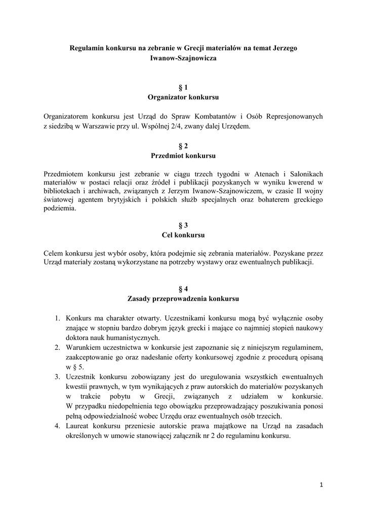 Regulamin konkursu na zebranie w Grecji materiałów na temat Jerzego Iwanow-Szajnowicza §1 Organizator konkursu Organizatorem konkursu jest Urząd do Spraw Kombatantów i Osób Represjonowanych z siedzibą w Warszawie przy ul. Wspólnej 2/4, zwany dalej Urzędem. §2 Przedmiot konkursu Przedmiotem konkursu jest zebranie w ciągu trzech tygodni w Atenach i Salonikach materiałów w postaci relacji oraz źródeł i publikacji pozyskanych w wyniku kwerend w bibliotekach i archiwach, związanych z Jerzym Iwanow-Szajnowiczem, w czasie II wojny światowej agentem brytyjskich i polskich służb specjalnych oraz bohaterem greckiego podziemia. §3 Cel konkursu Celem konkursu jest wybór osoby, która podejmie się zebrania materiałów. Pozyskane przez Urząd materiały zostaną wykorzystane na potrzeby wystawy oraz ewentualnych publikacji. §4 Zasady przeprowadzenia konkursu 1. Konkurs ma charakter otwarty. Uczestnikami konkursu mogą być wyłącznie osoby znające w stopniu bardzo dobrym język grecki i mające co najmniej stopień naukowy doktora nauk humanistycznych. 2. Warunkiem uczestnictwa w konkursie jest zapoznanie się z niniejszym regulaminem, zaakceptowanie go oraz nadesłanie oferty konkursowej zgodnie z procedurą opisaną w § 5. 3. Uczestnik konkursu zobowiązany jest do uregulowania wszystkich ewentualnych kwestii prawnych, w tym wynikających z praw autorskich do materiałów pozyskanych w trakcie pobytu w Grecji, związanych z udziałem w konkursie. W przypadku niedopełnienia tego obowiązku przeprowadzający poszukiwania ponosi pełną odpowiedzialność wobec Urzędu oraz ewentualnych osób trzecich. 4. Laureat konkursu przeniesie autorskie prawa majątkowe na Urząd na zasadach określonych w umowie stanowiącej załącznik nr 2 do regulaminu konkursu. 1 §5 Wymagania dotyczące nadsyłania ofert 1. Zgłaszaną na konkurs ofertę stanowi wypełniony wniosek, będący załącznikiem nr 1 do niniejszego regulaminu. 2. W załączeniu do wniosku, o którym mowa w pkt. 1, uczestnik konkursu przedstawia dokumenty potwierdzające znajomość języka greckiego i stopień naukowy oraz swój dotychczasowy dorobek naukowy, a także plan pracy (działań). 3. Wniosek wraz z załącznikami opisanymi powyżej, powinien być umieszczony w zaklejonej kopercie, oznaczonej czytelnym napisem: „Oferta na konkurs: Materiały na temat Jerzego Iwanow-Szajnowicza. Nie otwierać przed 17 listopada 2014 r. godz. 16.00”. 4. Oferta powinna zostać przesłana lub dostarczona osobiście na adres: Urząd do Spraw Kombatantów i Osób Represjonowanych, ul. Wspólna 2/4, 00-926 Warszawa, w nieprzekraczalnym terminie do dnia 17 listopada 2014 r. godz. 16.00 (decyduje data wpływu do Urzędu). 5. Organizator nie dopuszcza przesyłania ofert drogą elektroniczną. 6. Oferty złożone po terminie lub nie spełniające wymagań określonych w niniejszym regulaminie nie będą podlegały ocenie Jury. 7. Wszelkie koszty związane z udziałem w konkursie ponosi uczestnik konkursu. §6 Sposób rozstrzygania konkursu i informacja o wynikach 1. 2. 3. 4. 5. 6. 7. 8. Oceny ofert i wyboru laureata dokona Jury powołane przez Szefa Urzędu do Spraw Kombatantów i Osób Represjonowanych. Jury dokona oceny ofert spełniających wymagania niniejszego regulaminu i wskaże zwycięską ofertę. Osoba, która zostanie laureatem konkursu, zostanie ujawniona po wyborze oferty, w trakcie ogłaszania oficjalnych wyników konkursu. Z posiedzenia Jury zostanie sporządzony protokół podpisany przez wszystkich jego członków. Wyniki konkursu są jawne i zostaną opublikowane na stronie internetowej Urzędu oraz w Biuletynie Informacji Publicznej. Ogłoszenie wyników konkursu nastąpi w terminie 14 dni od dnia 17 listopada 2014 r. Laureat konkursu zostanie powiadomiony o wyborze listem poleconym. Jury konkursu zastrzega sobie prawo do nie rozstrzygnięcia konkursu, jeśli żadna ze złożonych ofert nie będzie zadowalająca pod względem wartości merytorycznej. Decyzja Jury jest ostateczna i nie przysługuje od niej odwołanie. Zwycięzca konkursu zobowiązuje się podpisać z Urzędem umowę, której treść stanowi załącznik nr 2 do regulaminu konkursu. 2 §7 Wynagrodzenie laureata 1. W ramach zawartej umowy Urząd zobowiąże się do wypłaty laureatowi wynagrodzenia pieniężnego za wykonane dzieło w wysokości 4 000 zł brutto oraz do pokrycia na terenie kraju i zagranicy uzgodnionych z Urzędem kosztów niezbędnych do wykonania umowy: przejazdów, zakwaterowania i wyżywienia oraz powielania materiałów związanych z Jerzym Iwanow-Szajnowiczem. §8 Postanowienia końcowe 1. Niniejszy Regulamin będzie opublikowany na stronie internetowej Urzędu oraz na stronach Biuletynu Informacji Publicznej. 2. Organizator przewiduje możliwość zmiany regulaminu, przerwania lub odwołania konkursu w uzasadnionych przypadkach. Wszelkie informacje o zmianach wymagają podania do wiadomości publicznej według zasad opisanych w punkcie powyżej. 3. Organizator zastrzega sobie prawo do gromadzenia i przetwarzania danych osobowych uczestników dla potrzeb konkursu, a złożenie oferty oznaczać będzie zgodę na to uczestnika konkursu. 4. Zgłoszenie oferty na konkurs jest równoznaczne z zaakceptowaniem regulaminu konkursu. 5. Pytania dotyczące Konkursu należy kierować wyłącznie w formie pisemnej na adres podany w § 5 pkt. 4 z dopiskiem „Konkurs na zebranie materiałów na temat Jerzego Iwanow-Szajnowicza”. 3 Załącznik nr 1 do regulaminu konkursu Wniosek o dopuszczenie do udziału w konkursie Dane Wnioskodawcy: Imię nazwisko ………………………………………………………………………………. Adres: ……………………………………………………………………………………….. Ja niżej podpisany, w związku z ogłoszonym przez Urząd do Spraw Kombatantów i Osób Represjonowanych konkursem na zebranie w Grecji w Atenach i Salonikach materiałów na temat Jerzego Iwanow-