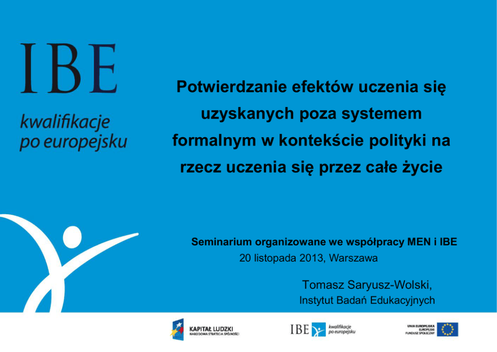 Potwierdzanie efektów uczenia się uzyskanych poza systemem formalnym w kontekście polityki na rzecz uczenia się przez całe życie Seminarium organizowane we współpracy MEN i IBE 20 listopada 2013, Warszawa Tomasz Saryusz-Wolski, Instytut Badań Edukacyjnych Warunek sine qua non wdrażania „uczenia się przez całe życie” U podstaw „uczenia się przez całe życie” leży system kwalifikacji oparty na efektach uczenia się Efekty uczenia się są „tak samo ważne” niezależnie od tego jak i gdzie zostały uzyskane Proces walidacji (w tym weryfikacji/oceny) efektów uczenia się jest kluczowy dla prawidłowego funkcjonowania „uczenia się przez całe życie” „Kwalifikacja”- definicja* „Qualification” means a formal outcome of an assessment Kwalifikacja widziana jestajako wynik and validation process which is obtained when competent procesu weryfikacji (względem body determines that an individual has achieved learning określonego standardu) i walidacji outcomesefektów to givenkształcenia standards; a nie koniecznie jako wynik procesu nauczania „kwalifikacja” oznacza formalny wynik procesu oceny i walidacji uzyskany w sytuacji, w której właściwy organ stwierdza, że dana osoba osiągnęła efekty uczenia się zgodne z określonymi standardami *THE EUROPEAN QUALIFICATIONS FRAMEWORK FOR LIFELONG LEARNING (EQF) Dwa znaczenia terminu „Kwalifikacja” Kwalifikacja „zdefiniowana” – zgodnie z obowiązującymi zasadami i zgodnie z wymaganiami Polskiej Ramy Kwalifikacji oraz Zintegrowanego Rejestru Kwalifikacji Kwalifikacja nadana uczącemu się – potwierdzenie, że absolwent osiągnął wszystkie efekty kształcenia zapisane dla „kwalifikacji zdefiniowanej” Jakość kwalifikacji (nadanej osobie) A. Jakość kwalifikacji zdefiniowanej - kwalifikacja „dobrze pomyślana”: adekwatna do potrzeb, aktualna, realna - kwalifikacja dobrze opisana B. Jakość walidacji (z uwzględnieniem różnych ścieżek dojścia do kwalifikacji) - adekwatność procesu walidacji (do charakteru danej kwalifikacji) - kompletność procesu walidacji - skuteczność zapewniania jakości na każdym etapie procesu (ludzie, miejsca, sposoby działania, metody, narzędzia) Jakość nauczania i uczenia się 5 Walidacja słowo „klucz” „walidacja” oznacza proces potwierdzania przez upoważniony organ, że dana osoba uzyskała efekty uczenia się mierzone zgodnie z odpowiednimi standardami ZALECENIE RADY w sprawie walidacji uczenia się pozaformalnego i nieformalnego Wieloetapowy proces sprawdzania, czy - niezależnie od sposobu uczenia się - kompetencje wymagane dla danej kwalifikacji zostały osiągnięte. Walidacja prowadzi do certyfikacji. Raport Referencyjny Polskiej Ramy Kwalifikacji Słownik podstawowych terminów dotyczących krajowego systemu kwalifikacji Różnorodność celów walidacji niepotwierdzonych efektów uczenia się W celu (dalszego uczenia się dla) nadania kwalifikacji pełnej – decydującej o wykształceniu – podniesienia poziomu wykształcenia W celu (dalszego uczenia się dla) nadania kwalifikacji cząstkowej W celu uzyskania uprawnień zawodowych W celu przekwalifikowania, zmiany wykonywanych zadań zawodowych, uzyskania zatrudnienia W celach istotnych z punktu widzenia życia prywatnego A może również w celu Zwiększenia świadomości posiadanych kompetencji i łatwiejszego ich wykorzystania Różnorodność kwalifikacji Kwalifikacje różnią się znacząco pod względem: Możliwości uzyskiwania efektów uczenia poza systemem formalnym Stopień generyczności efektów Charakteru efektów – np. zdolność do wykonywania zadań zawodowych Znaczenia efektów uczenia się dla uzyskania, utrzymania zatrudnienia (szeroko rozumianego) Kompetencje „kierunkowe” – wiedza i umiejętności niezbędne do wykonywania zadań zawodowych Kompetencje społeczne Proces walidacji będzie przebiegał różnie w zależności od charakteru efektów uczenia się i celu prowadzonej walidacji Przebieg procesu walidacji - etapy Wg ZALECENIE RADY z dnia 20 grudnia 2012 г. w sprawie walidacji uczenia się pozaformalnego i nieformalnego 1. Identyfikacja 2. Dokumentacja 3. Ocena (weryfikacja) 4. Poświadczenie (potwierdzenie) „IDENTYFIKACJA efektów uczenia się uzyskanych przez osobę indywidualną w drodze uczenia się pozaformalnego i nieformalnego” •W jakim celu ma być prowadzona walidacja ? •Jakich efektów uczenia się poszukujemy?, •Czy efekty których poszukujemy pochodzą z • edukacji pozaformalnej, • uczenia się nieformalnego, • a może z edukacji formalnej (tak, to nie pomyłka) •W obszarze jakiego poziomu Ram Kwalifikacji się poruszamy „DOKUMENTACJA efektów uczenia się uzyskanych przez osobę indywidualną w drodze uczenia się pozaformalnego i nieformalnego” Odpowiednie „udokumentowanie” uzyskanych efektów uczenia się jest podstawą do zaplanowania a następnie przeprowadzenia weryfikacji (oceny) efektów uczenia się Często jest elementem uczenia się, pozyskiwania kompetencji ogólnych oraz podnoszenia świadomości posiadanych efektów uczenia się Rola doradcy osoby uczącej się W procesie identyfikacji i dokumentowania efektów uczenia się istotną rolę odgrywa „doradca” wspomagający uczącego się na tych etapach procesu walidacji Rola doradcy, stopień jego zaangażowania zależy od Kontekstu w jakim efekty zostały uzyskane Poziomu wykształcenia (poziomu PRK kwalifikacji pełnej) jaką posiada uczący się „OCENA efektów uczenia się uzyskanych przez osobę indywidualną w drodze uczenia się pozaformalnego i nieformalnego” Proces oceny – weryfikacji efektów uczenia się powinien odpowiedzieć na pytanie czy uczący się osiągnął efekty które mają zostać potwierdzone ocena czy weryfikacja? (co rozumiemy przez ocenę?) Przebieg procesu wynika z Dokumentacji efektów uczenia się Musi być dostosowany do – ich charakteru – kontekstu w jakim zostały uzyskane Walidacja w edu