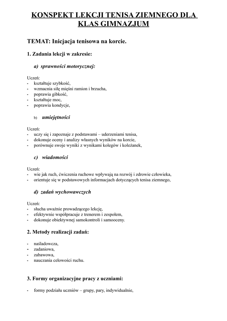 KONSPEKT LEKCJI TENISA ZIEMNEGO DLA KLAS GIMNAZJUM TEMAT: Inicjacja tenisowa na korcie. 1. Zadania lekcji w zakresie: a) sprawności motorycznej: Uczeń: - kształtuje szybkość, - wzmacnia siłę mięśni ramion i brzucha, - poprawia gibkość, - kształtuje moc, - poprawia kondycje, b) umiejętności Uczeń: - uczy się i zapoznaje z podstawami – uderzeniami tenisa, - dokonuje oceny i analizy własnych wyników na korcie, - porównuje swoje wyniki z wynikami kolegów i koleżanek, c) wiadomości Uczeń: - wie jak ruch, ćwiczenia ruchowe wpływają na rozwój i zdrowie człowieka, - orientuje się w podstawowych informacjach dotyczących tenisa ziemnego, d) zadań wychowawczych Uczeń: - słucha uważnie prowadzącego lekcję, - efektywnie współpracuje z trenerem i zespołem, - dokonuje obiektywnej samokontroli i samooceny. 2. Metody realizacji zadań: - - naśladowcza, zadaniowa, zabawowa, nauczania celowości ruchu. 3. Formy organizacyjne pracy z uczniami: - formy podziału uczniów – grupy, pary, indywidualnie, - formy prowadzenia zajęć – pokazowa, frontalna, stacyjna. 4. Metody zdobywania i przekazywania wiadomości: - pokaz i objaśnienie, wskazanie na najważniejsze aspekty inicjacji, tablice informacyjne, ilustracje. Miejsce zajęć: kort tenisowy, sala gimnastyczna Czas trwania lekcji: 45 minut Pomoce dydaktyczne: piłki tenisowe, rakiety, puszki od piłek, pachołki, kartki i długopisy, stopery, książka z ilustracjami. 5. Tok lekcji: a) Część wprowadzająca: 1. 2. 3. 4. 5. 6. Zbiórka, powitanie, sprawdzenie listy obecności oraz gotowości do zajęć. Podanie zakresu i tematu lekcji. Ćwiczenia wprowadzające, rozgrzewka. Uczniowie, jedno za drugim, biegną dookoła kortu, truchtem, twarzą do siatki (przodem, bokiem- krokiem dostawnym, tyłem, dwa okrążenia). Przekładanie piłki z jednej dłoni do drugiej. Stojąc w lekkim rozkroku przekładanie piłki przed sobą z lewej do prawej dłoni i za sobą z prawej do lewej, przy tym ramiona luźno opuszczone. Marsz w miejscu i przekładanie piłki pod wysoko unoszonym kolanem, raz jedną raz pod drugą nogą. Toczenie piłki ręką po ziemi. W skłonie w przód i swobodnym rozkroku, toczenie piłki wokół stóp, raz wokół prawej raz lewej, później ósemka. Chwyty piłki opuszczonej lub podrzucanej, chwyty jednorącz i oburącz po koźle. Podrzucanie piłki oburącz na różne wysokości, łapanie raz po koźle na wysokości tułowia, raz prawą raz lewą ręką. To samo z podrzucaniem jednorącz. Kozłowanie piłeczki. Rytmiczne kozłowanie piłki tenisowej raz lewa raz prawa ręką. b) Część realizacyjna 1. Ćwiczenia zręczności z piłeczkami. Kozłowanie piłki w miejscu, następnie w biegu, podrzucanie piłeczki raz jedną raz drugą ręka w biegu (łapanie piłki po koźle). 2. Podania piłki - rzuty łukiem z dołu z wyprostowanym ramieniem, najpierw na wprost, później w ustawieniu bocznym. Ustawienie uczniów w dwójkach, podanie i chwyty jednorącz łukiem z dołu do kolegi stojącego w odległości około 5 metrów, chwyt oburącz po koźle. 3. Podania w ustawieniu bocznym. W parach, ustawienie bokiem w odległości 4 metrów, rzut z dołu prawą ręką, chwyt po koźle – wprowadzenie do forhendu. 4. Ćwiczenia z rakietkami. - chwyt rakiety jednorącz, zapoznanie się z ciężkością i długością rakiety, przekładanie rakiety z prawej do lewej ręki, - kładziemy rakietę na podłożu (główką w stronę siatki) i staramy się przeskoczyć przez nią na prawą i lewą stronę – obiema nogami, - zabawa w grupie, wszyscy uczniowie ustawiają się wokół kortu – podanie rakiety koledze z prawej potem z lewej strony, jednorącz. 5. Ćwiczenia z rakietą i piłką. - jak najdłuższe utrzymanie piłeczki na rakiecie, tak żeby nie spadła na ziemie, to samo ćwiczenie o większym stopniu trudności - w marszu, a później w biegu dookoła kortu, - toczenie piłki rakietą po korcie na wprost, nie odrywając rakiety od piłki, - toczenie piłki rakietą po korcie wokół własnej osi, nie odrywając rakiety od piłki, - ćwiczenie w parach, uczniowie stają naprzeciwko siebie, podają toczoną piłeczkę uderzoną rakietą do kolegi i na przemian, - próby podbijania piłeczki rakietą do góry, raz jedną raz drugą stroną rakiety, - ćwiczenie w parach, uczniowie stoją po obydwu stronach siatki na przeciw siebie w parach, próby przebicia piłeczki z prawej strony (forhend) przez siatkę. c) Część końcowa – podsumowanie 1. 2. 3. 4. 5. 6. Ćwiczenie sprawnościowe. Każdy uczeń na czas wykonuje test, polegający na zbieraniu pojedynczo piłeczek i układaniu ich na rakietę leżącą w miejscu startu, wygrywa ten, który uzyska najlepszy czas. Dla rozluźnienia sprzątanie kortu- siatkowanie. Wyłonienie najszybszego ucznia, z najlepszym wynikiem testu sprawnościowego. Omówienie lekcji, pytanie i odpowiedzi. Określenie tematyki kolejnej lekcji. Pożegnanie. 6. Bibliografia: 1. Adam Królak –„ Tenis dla dzieci, nauczycieli i rodziców”- wyd. szkolne i pedagogiczne, Warszawa 1999r. 2. Doświadczenie własne.