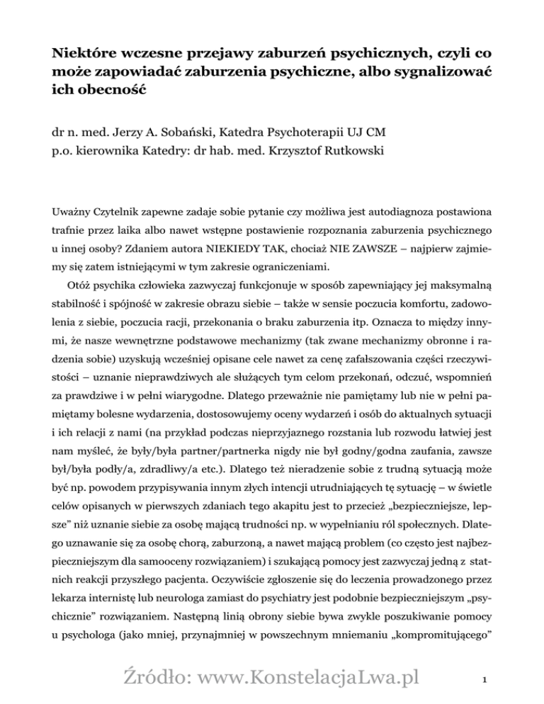 Niektóre wczesne przejawy zaburzeń psychicznych, czyli co może zapowiadać zaburzenia psychiczne, albo sygnalizować ich obecność dr n. med. Jerzy A. Sobański, Katedra Psychoterapii UJ CM p.o. kierownika Katedry: dr hab. med. Krzysztof Rutkowski Uważny Czytelnik zapewne zadaje sobie pytanie czy możliwa jest autodiagnoza postawiona trafnie przez laika albo nawet wstępne postawienie rozpoznania zaburzenia psychicznego u innej osoby? Zdaniem autora NIEKIEDY TAK, chociaż NIE ZAWSZE – najpierw zajmiemy się zatem istniejącymi w tym zakresie ograniczeniami. Otóż psychika człowieka zazwyczaj funkcjonuje w sposób zapewniający jej maksymalną stabilność i spójność w zakresie obrazu siebie – także w sensie poczucia komfortu, zadowolenia z siebie, poczucia racji, przekonania o braku zaburzenia itp. Oznacza to między innymi, że nasze wewnętrzne podstawowe mechanizmy (tak zwane mechanizmy obronne i radzenia sobie) uzyskują wcześniej opisane cele nawet za cenę zafałszowania części rzeczywistości – uznanie nieprawdziwych ale służących tym celom przekonań, odczuć, wspomnień za prawdziwe i w pełni wiarygodne. Dlatego przeważnie nie pamiętamy lub nie w pełni pamiętamy bolesne wydarzenia, dostosowujemy oceny wydarzeń i osób do aktualnych sytuacji i ich relacji z nami (na przykład podczas nieprzyjaznego rozstania lub rozwodu łatwiej jest nam myśleć, że były/była partner/partnerka nigdy nie był godny/godna zaufania, zawsze był/była podły/a, zdradliwy/a etc.). Dlatego też nieradzenie sobie z trudną sytuacją może być np. powodem przypisywania innym złych intencji utrudniających tę sytuację – w świetle celów opisanych w pierwszych zdaniach tego akapitu jest to przecież „bezpieczniejsze, lepsze” niż uznanie siebie za osobę mającą trudności np. w wypełnianiu ról społecznych. Dlatego uznawanie się za osobę chorą, zaburzoną, a nawet mającą problem (co często jest najbezpieczniejszym dla samooceny rozwiązaniem) i szukającą pomocy jest zazwyczaj jedną z statnich reakcji przyszłego pacjenta. Oczywiście zgłoszenie się do leczenia prowadzonego przez lekarza internistę lub neurologa zamiast do psychiatry jest podobnie bezpieczniejszym „psychicznie” rozwiązaniem. Następną linią obrony siebie bywa zwykle poszukiwanie pomocy u psychologa (jako mniej, przynajmniej w powszechnym mniemaniu „kompromitującego” Źródło: www.KonstelacjaLwa.pl 1 niż psychiatra), u coacha lub doradcy, a znacznie mniej chętnie u psychoterapeuty czy psychiatry. Podjęcie terapii lekami bywa często odrzucane bardziej niż psychoterapii, zgoda na hospitalizację jest trudniejsza do udzielenia niż na leczenie otwarte np. ambulatoryjne lub w oddziale dziennym. Z tego powodu pacjent, który czuje dolegliwości psychiczne często próbuje je odsunąć, przypisać zewnętrznym powodom: stresowi (wydarzeniom stresującym), pogodzie (meteopatia bądź „meteoropatia” – ta ostatnia nazwa jest oczywiście nieprawidłowa, sugeruje bowiem szkodliwość meteorów czy meteorytów...), innym osobom jako „toksycznym rodzicom” lub przyjaciołom, „wampirom energetycznym” i podobnym czynnikom – wszystkim znajdującym się poza pacjentem (zewnątrzpsychicznym). Tymczasem sygnały o wewnątrzpsychicznym źródle dolegliwości są przeważnie wygaszane, pomijane, wiązane raczej z krzywdami, chorobami somatycznymi, niż z błędnymi przekonaniami, wypaczonymi ciągami uczuć, zakłóconymi układami rodzinnymi. Nie bez powodu poznanie samego siebie już starożytni filozofowie uznawali za jedno z największych odkryć i osiągnięć. Nie wszystkie zaburzenia rozpoczynają się, ujawniają i przebiegają w podobny sposób, szczególnie w zakresie poczucia choroby, rodzaju podstawowych objawów. Oczywiście szczegółowe zapoznanie się z podstawami psychopatologii wchodzi w zakres specjalistycznego, wieloletniego wykształcenia psychiatry oraz do pewnego stopnia psychologa oraz psychoterapeuty. Dlatego kolejnym ważnym zagadnieniem będzie przyjęty dla potrzeb tego eseju następujący uproszczony podział zaburzeń psychicznych (z pewnym przybliżeniem zarazem ujmujących ich ciężkość): • nerwice, zaburzenia osobowości oraz inne zaburzenia np. zaburzenia odżywiania się, zaburzenia snu, zaburzenia seksualne, • zaburzenia afektywne (depresja i mania lub jedynie depresja), • zaburzenia z kręgu schizofrenii, oraz • stanowiące nieco odrębną, czwartą grupę zaburzenia psychiczne związane z innymi schorzeniami np. z uszkodzeniami i chorobami mózgu (tzw. psychoorganiczne), ogólnym stanem zdrowia, zażywanymi lekami (zaburzenia nastroju po sterydach i innych lekach hormonalnych, stany podobne do depresji lub otępień w niedoczynności tarczycy), zaburzenia podobne do nerwic w nadczynności tarczycy i wiele innych... Teraz powyżej opisany podział umożliwi nam opisanie wariantów zapowiedzi zaburzeń lub ich pierwszych objawów. Nerwice, inaczej zaburzenia nerwicowe, zapowiadają swoje pojawienie się w rozmaity sposób – w praktyce klinicznej można spotkać licznych pacjentów, 2 Źródło: www.KonstelacjaLwa.pl którzy przed momentem wyraźnego zachorowania bądź (to przecież nie to samo) do chwili postawienia im diagnozy, wyróżniali się aktywnością, mobilizacją, odpornością na stres (w jakimś stopniu pozorną?), założyli własne firmy, podróżowali, współzawodniczyli, natomiast pojawienie się objawów często niweczyło te umiejętności np. powodowało zamknięcie się w domu z powodu agorafobii czy unikanie ludzi z powodu fobii społecznej. Niekiedy pacjentów ograniczać zaczynało unikanie jakiegokolwiek ryzyka zdrowotnego (i nie tylko takiego ryzyka) z powodu hipochondrii i podobnych przeżyć z obszarów lęku o swoje bezpieczeństwo, wycofanie z działań społecznych i zawodowych (np. z powodu wspomnianych objawów fobii społecznej, podobnych do nasilonej niepewności siebie, nieśmiałości