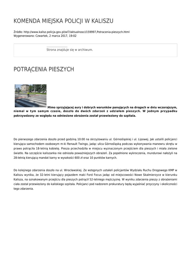 KOMENDA MIEJSKA POLICJI W KALISZU Źródło: http://www.kalisz.policja.gov.pl/wl7/aktualnosci/159997,Potracenia-pieszych.html Wygenerowano: Czwartek, 2 marca 2017, 19:02 Strona znajduje się w archiwum. POTRĄCENIA PIESZYCH Mimo sprzyjającej aury i dobrych warunków panujących na drogach w dniu wczorajszym, niemal w tym samym czasie, doszło do dwóch zdarzeń z udziałem pieszych. W jednym przypadku pokrzywdzony ze względu na odniesione obrażenia został przewieziony do szpitala. Do pierwszego zdarzenia doszło przed godziną 10:00 na skrzyżowaniu ul. Górnośląskiej i ul. Lipowej. Jak ustalili policjanci kierująca samochodem osobowym m-ki Renault Twingo, jadąc ulica Górnośląską podczas wykonywania manewru skrętu w prawo potrąciła 18-letnią kobietę. Piesza przechodziła w miejscu wyznaczonym przejściem dla pieszych i miała zielone światło. Na szczęście kaliszanka nie odniosła poważniejszych obrażeń. Za popełnione wykroczenia, mundurowi nałożyli na 28-letnią kierującą mandat karny w wysokości 600 zł oraz 10 punktów karnych. Do kolejnego zdarzenia doszło na ul. Wrocławskiej. Ze wstępnych ustaleń policjantów Wydziału Ruchu Drogowego KMP w Kaliszu wynika, że 32-letni kierujący pojazdem maki Ford Focus jadąc od miejscowości Nowe Skalmierzyce w kierunku Kalisza, na oznakowanym przejściu dla pieszych potrącił 52-letniego mężczyznę. W wyniku zdarzenia pieszy z obrażeniami ciała został przewieziony do kaliskiego szpitala. Policjanci pod nadzorem prokuratury będą wyjaśniać przyczyny i okoliczności tego zdarzenia. Te dwa zdarzenia powinny być przestrogą dla kierujących. Nawet bardzo dobre warunki panujące na drogach nie powinny uśpić naszej czujności za kierownicą. Wsiadając do samochodu powinniśmy być wypoczęci i skupieni. Obserwujmy również bacznie drogę oraz jej okolicę i nie ufajmy innym. Dzięki takiemu zachowaniu bezpiecznie dotrzemy na miejsce, a przede wszystkim zadbamy o życie i zdrowie, które przecież są najważniejsze. Ocena: 0/5 (0) Tweetnij