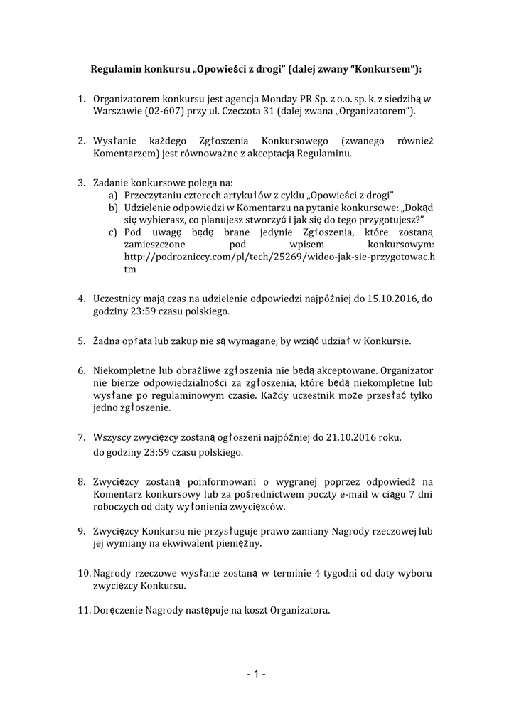 Regulamin konkursu „Opowieści z drogi” (dalej zwany “Konkursem”): 1. Organizatorem konkursu jest agencja Monday PR Sp. z o.o. sp. k. z siedzibą w Warszawie (02-607) przy ul. Czeczota 31 (dalej zwana „Organizatorem”). 2. Wysłanie każdego Zgłoszenia Konkursowego (zwanego Komentarzem) jest równoważne z akceptacją Regulaminu. również 3. Zadanie konkursowe polega na: a) Przeczytaniu czterech artykułów z cyklu „Opowieści z drogi” b) Udzielenie odpowiedzi w Komentarzu na pytanie konkursowe: „Dokąd się wybierasz, co planujesz stworzyć i jak się do tego przygotujesz?” c) Pod uwagę będę brane jedynie Zgłoszenia, które zostaną zamieszczone pod wpisem konkursowym: http://podrozniccy.com/pl/tech/25269/wideo-jak-sie-przygotowac.h tm 4. Uczestnicy mają czas na udzielenie odpowiedzi najpóźniej do 15.10.2016, do godziny 23:59 czasu polskiego. 5. Żadna opłata lub zakup nie są wymagane, by wziąć udział w Konkursie. 6. Niekompletne lub obraźliwe zgłoszenia nie będą akceptowane. Organizator nie bierze odpowiedzialności za zgłoszenia, które będą niekompletne lub wysłane po regulaminowym czasie. Każdy uczestnik może przesłać tylko jedno zgłoszenie. 7. Wszyscy zwycięzcy zostaną ogłoszeni najpóźniej do 21.10.2016 roku, do godziny 23:59 czasu polskiego. 8. Zwycięzcy zostaną poinformowani o wygranej poprzez odpowiedź na Komentarz konkursowy lub za pośrednictwem poczty e-mail w ciągu 7 dni roboczych od daty wyłonienia zwycięzców. 9. Zwycięzcy Konkursu nie przysługuje prawo zamiany Nagrody rzeczowej lub jej wymiany na ekwiwalent pieniężny. 10. Nagrody rzeczowe wysłane zostaną w terminie 4 tygodni od daty wyboru zwycięzcy Konkursu. 11. Doręczenie Nagrody następuje na koszt Organizatora. -1- 12. W przypadku niezgłoszenia się zwycięzcy po wygraną (poprzez przesłanie Organizatorowi adresu do wysyłki) w ciągu 7 dni roboczych od czasu poinformowania o wygranej, nagroda przepadnie na rzecz Organizatora. 13. Organizator zastrzega sobie prawo do weryfikacji tożsamości uczestnika, w przypadku, gdy wystąpią podejrzenia, iż uczestnik łamie regulamin, przesyłając więcej niż jedno Zgłoszenie Konkursowe. 14. Nagrodami w konkursie są: ● Główna nagroda za I miejsce: laptop Dell Inspiron 7559 o przybliżonej wartości 2870 PLN brutto. Organizator zobowiązuje się do uiszczenia podatku dochodowego w stosownej kwocie regulowanej ustawą ● Nagroda za II miejsce: głośnik JBL Flip 2, torba Aquarius GoPack 10 litrów o łącznej wartości 397 PLN brutto. Organizator zobowiązuje się do uiszczenia podatku dochodowego w stosownej kwocie regulowanej ustawą ● Nagroda za III miejsce: zestaw Joby Action Base Kit i torba Aquarius GoPack 20 litrów o łącznej wartości 412 PLN brutto. Organizator zobowiązuje się do uiszczenia podatku dochodowego w stosownej kwocie regulowanej ustawą. 15. Konkurs odbywa się w ramach obowiązującego polskiego prawa. Organizator zastrzega sobie prawo do przerwania konkursu, jeśli użytkownicy nie przestrzegają reguł lub łamią zasady Regulaminu. 16. Organizator pokrywa podatek dochodowy od osób fizycznych na podstawie art. 21 ust. 1 pkt 68a ustawy z dnia 26 lipca 1991 r. o podatku dochodowym od osób fizycznych (t.j. Dz. U. z 2010 r., Nr 51, poz. 307). 13. Niniejszy Regulamin Konkursu podlega pod każdym względem pod ustawodawstwo i prawo Polski. Użytkownicy podlegają i poddają się wyłącznej jurysdykcji polskich sądów w odniesieniu do jakichkolwiek umownych lub pozaumownych roszczeń i sporów dotyczących Konkursu. -2-