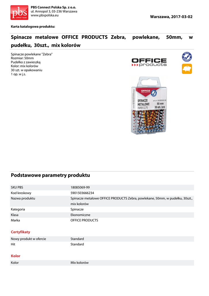 PBS Connect Polska Sp. z o.o. ul. Annopol 3, 03-236 Warszawa www.pbspolska.eu Warszawa, 2017-03-02 Karta katalogowa produktu: Spinacze metalowe OFFICE PRODUCTS Zebra, powlekane, 50mm, w pudełku, 30szt., mix kolorów Spinacze powlekane "Zebra" Rozmiar: 50mm Pudełko z zawieszką Kolor: mix kolorów 30 szt. w opakowaniu 1 op. w j.s. Podstawowe parametry produktu SKU PBS 18085069-99 Kod kreskowy 5901503666234 Nazwa produktu Spinacze metalowe OFFICE PRODUCTS Zebra, powlekane, 50mm, w pudełku, 30szt., mix kolorów Kategoria Spinacze Klasa Ekonomiczne Marka OFFICE PRODUCTS Certyfikaty Nowy produkt w ofercie Standard Hit Standard Kolor Kolor Mix kolorów PBS Connect Polska Sp. z o.o. ul. Annopol 3, 03-236 Warszawa www.pbspolska.eu Warszawa, 2017-03-02 Karta katalogowa produktu cd. Spinacze metalowe OFFICE PRODUCTS Zebra, pudełku, 30szt., mix kolorów Podstawowe parametry produktu Cecha Produkt Spinacze Typ Powlekane Rodzaj W pudełku Materiał Metalowe W ofercie od 2015-03 Wymiary Rozmiar 50mm Wspólny słownik zamówień CPV 30197220-4 Spinacze do papieru Jednostki logistyczne Opakowanie 1 10 op Opakowanie 2 180 op powlekane, 50mm, w