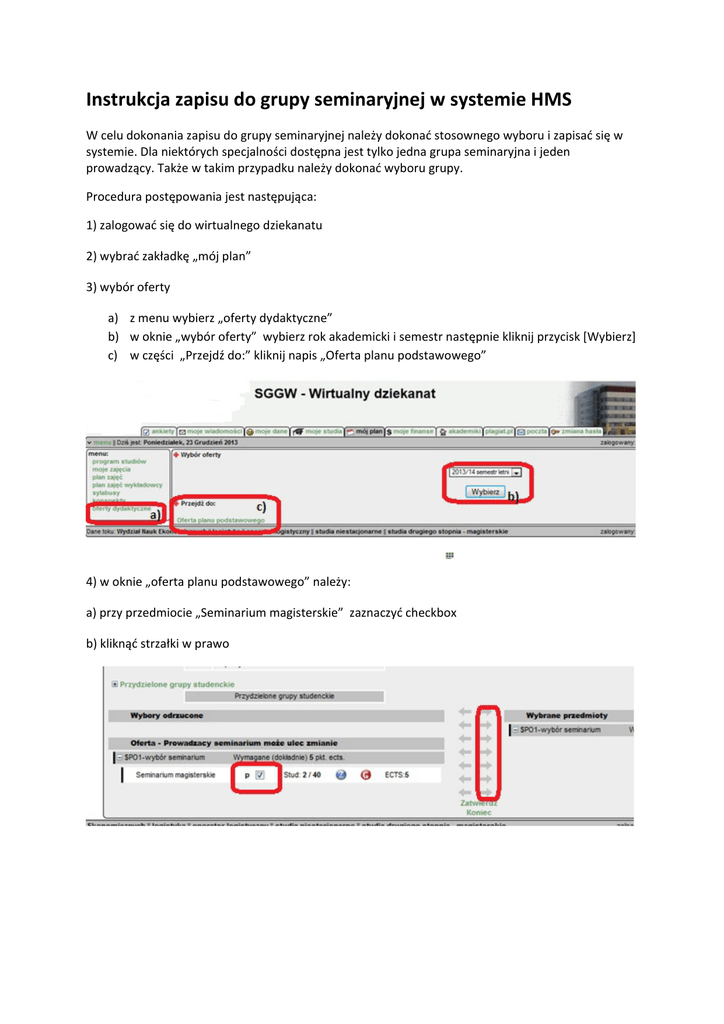 Instrukcja zapisu do grupy seminaryjnej w systemie HMS W celu dokonania zapisu do grupy seminaryjnej należy dokonać stosownego wyboru i zapisać się w systemie. Dla niektórych specjalności dostępna jest tylko jedna grupa seminaryjna i jeden prowadzący. Także w takim przypadku należy dokonać wyboru grupy. Procedura postępowania jest następująca: 1) zalogować się do wirtualnego dziekanatu 2) wybrać zakładkę „mój plan” 3) wybór oferty a) z menu wybierz „oferty dydaktyczne” b) w oknie „wybór oferty” wybierz rok akademicki i semestr następnie kliknij przycisk [Wybierz] c) w części „Przejdź do:” kliknij napis „Oferta planu podstawowego” 4) w oknie „oferta planu podstawowego” należy: a) przy przedmiocie „Seminarium magisterskie” zaznaczyć checkbox b) kliknąć strzałki w prawo 5) w części „Wybrane przedmioty” kliknąć ikonkę „G” w kolorze czerwonym 6) w wyświetlonym oknie „Grupy zajęciowe: Seminarium magisterskie”: a) z rozwijalnej listy wybrać dwukrotnie prowadzącego seminarium ‐ tego samego dla ćwiczeń i oceny końcowej b) kliknąć przycisk [Zapisz] – po zapisaniu ikonka „G” zmieni kolor na zielony 7) kliknąć przyciski [Zapisz] – wyświetli się komunikat: „Zapisano zmiany” potwierdzający dokonanie wyboru prowadzącego seminarium