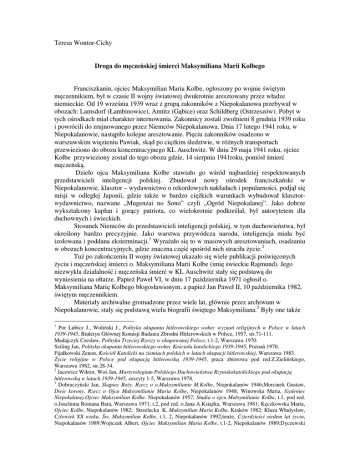 Teresa Wontor-Cichy Droga do męczeńskiej śmierci Maksymiliana Marii Kolbego Franciszkanin, ojciec Maksymilian Maria Kolbe, ogłoszony po wojnie świętym męczennikiem, był w czasie II wojny światowej dwukrotnie aresztowany przez władze niemieckie. Od 19 września 1939 wraz z grupą zakonników z Niepokalanowa przebywał w obozach: Lamsdorf (Łambinowice), Amtitz (Gąbice) oraz Schildberg (Ostrzeszów). Pobyt w tych ośrodkach miał charakter internowania. Zakonnicy zostali zwolnieni 8 grudnia 1939 roku i powrócili do zrujnowanego przez Niemców Niepokalanowa. Dnia 17 lutego 1941 roku, w Niepokalanowie, nastąpiło kolejne aresztowanie. Pięciu zakonników osadzono w warszawskim więzieniu Pawiak, skąd po ciężkim śledztwie, w różnych transportach przewieziono do obozu koncentracyjnego KL Auschwitz. W dniu 29 maja 1941 roku, ojciec Kolbe przywieziony został do tego obozu gdzie, 14 sierpnia 1941roku, poniósł śmierć męczeńską. Dzieło ojca Maksymiliana Kolbe stawiało go wśród najbardziej respektowanych przedstawicieli inteligencji polskiej. Zbudował nowy ośrodek franciszkański w Niepokalanowie, klasztor – wydawnictwo o rekordowych nakładach i popularności, podjął się misji w odległej Japonii, gdzie także w bardzo ciężkich warunkach wybudował klasztorwydawnictwo, nazwane „Mugenzai no Sono” czyli „Ogród Niepokalanej”. Jako dobrze wykształcony kapłan i gorący patriota, co wielokrotnie podkreślał, był autorytetem dla duchownych i świeckich. Stosunek Niemców do przedstawicieli inteligencji polskiej, w tym duchowieństwa, był określony bardzo precyzyjnie. Jako warstwa przywódcza narodu, inteligencja miała być izolowana i poddana eksterminacji.1 Wyrażało się to w masowych aresztowaniach, osadzaniu w obozach koncentracyjnych, gdzie znaczna część spośród nich straciła życie.2 Tuż po zakończeniu II wojny światowej ukazało się wiele publikacji poświęconych życiu i męczeńskiej śmierci o. Maksymiliana Marii Kolbe (imię świeckie Rajmund). Jego niezwykła działalność i męczeńska śmierć w KL Auschwitz stały się podstawą do wyniesienia na ołtarze. Papież Paweł VI, w dniu 17 października 1971 ogłosił o. Maksymiliana Marię Kolbego błogosławionym, a papież Jan Paweł II, 10 października 1982, świętym męczennikiem. Materiały archiwalne gromadzone przez wiele lat, głównie przez archiwum w Niepokalanowie, stały się podstawą wielu biografii świętego Maksymiliana.3 Były one także 1 Por Lubicz J., Woliński J., Polityka okupanta hitlerowskiego wobec wyznań religijnych w Polsce w latach 1939-1945, Biuletyn Głównej Komisji Badania Zbrodni Hitlerowskich w Polsce, 1957, str.71-111. Madajczyk Czesław, Polityka Trzeciej Rzeszy w okupowanej Polsce, t.1-2, Warszawa 1970. Sziling Jan, Polityka okupanta hitlerowskiego wobec Kościoła katolickiego 1939-1945, Poznań 1970. Fijałkowski Zenon, Kościół Katolicki na ziemiach polskich w latach okupacji hitlerowskiej, Warszawa 1983. Życie religijne w Polsce pod okupacją hitlerowską 1939-1945, praca zbiorowa pod red.Z.Zielińskiego, Warszawa 1982, str.28-34. 2 Jacewicz Wiktor, Woś Jan, Martyrologium Polskiego Duchowieństwa Rzymskokatolickiego pod okupacją hitlerowską w latach 1939-1945, zeszyty 1-5, Warszawa 1978. 3 Dobraczyński Jan, Skąpiec Boży. Rzecz o o.Maksymilianie M.Kolbe, Niepokalanów 1946;Morcinek Gustaw, Dwie korony. Rzecz o Ojcu Maksymilianie Maria Kolbe, Niepokalanów 1948; Winowska Maria, Szaleniec Niepokalanej.Ojciec Maksymilian Kolbe. Niepokalanów 1957; Studia o ojcu Malsymilianie Kolbe, t.1, pod red. o.Joachima Romana Bara, Warszawa 1971, t.2, pod red. o.Jana A.Książka, Warszawa 1981; Kęczkowska Maria, Ojciec Kolbe, Niepokalanów 1982; Strzelecka K, Maksymilian Maria Kolbe, Kraków 1982; Kluza Władysław, Człowiek XX wieku. Św. Maksymilian Kolbe, t.1, 2, Niepokalanów 1992;tenże, Czterdzieści siedem lat życia, Niepokalanów 1989;Wojtczak Albert, Ojciec Maksymilian Maria Kolbe, t.1-2, Niepokalanów 1989;Dyczewski podstawą niniejszego opracowania, wzbogaconego o dokumenty przechowywane w Archiwum Państwowego Muzeum Auschwitz-Birkenau w Oświęcimiu oraz Centralnym Muzeum Jeńców Wojennych w Łambinowicach-Opolu. Dla właściwego zrozumienia powodów aresztowania i więzienia św. Maksymiliana należy przyjrzeć się jego wielkiemu dziełu jakim był Niepokalanów polski i japoński, oraz drodze, która wiodła do tego celu. Rajmund Kolbe urodził się 8 stycznia 1894 r. w Zduńskiej Woli. Jego rodzice Juliusz Kolbe i Marianna z Dąbrowskich Kolbe byli zgodnym małżeństwem. Pochodzili z rodzin zajmujących się od wielu pokoleń tkactwem. Ich pierwszy syn przyszedł na świat w 1892 r. Z racji wielkiego kultu św. Franciszka z Asyżu, dano mu na imię Franciszek. Marianna Kolbe cieszyła się sympatią wielu sąsiadów, była znaną i cenioną akuszerką, potrafiła leczyć wiele chorób. Juliusz był bardzo dobrym rzemieślnikiem, co ułatwiło mu znalezienie kolejnej pracy. Zajmował się także drukowaniem i kolportowaniem prasy patriotycznej, angażował się w życie religijne parafii. Obydwoje od pierwszego roku po ślubie należeli do Trzeciego Zakonu św. Franciszka i starali się zachowywać reguły zakonne. Poza tym Marianna należała do Żywego Różańca, Juliusz co roku pielgrzymował pieszo do Częstochowy. W mieszkaniu, w widocznym miejscu stał ołtarzyk Matki Boskiej Częstochowskiej, przed którym we środy, soboty, niedziele i wszystkie święta maryjne paliła się lampka oliwna. Rodzina bardzo często gromadziła się na wspólnej modlitwie. Wspólnie uczestniczyli także we mszy świętej i nabożeństwach. Synowie Franciszek, Rajmund i Józef wyrastali w prawdziwie religijnej atmosferze. Kolbowie dostrzegali potrzebę kształcenia siebie i swoich dzieci. Ich trzej synowie chodzili do szkoły, pewne kwoty ze swoich skromnych dochodów przeznaczali na zakup książek i czasopism. Nie było to powszec