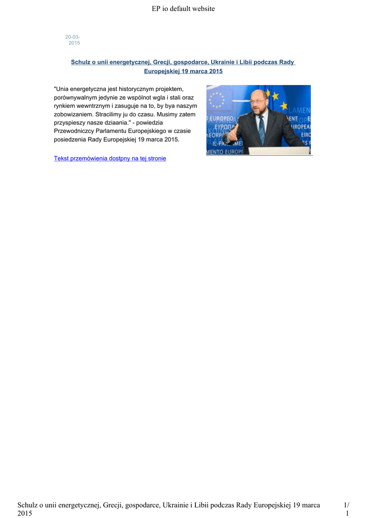 EP io default website 20-032015 Schulz o unii energetycznej, Grecji, gospodarce, Ukrainie i Libii podczas Rady Europejskiej 19 marca 2015 "Unia energetyczna jest historycznym projektem, porównywalnym jedynie ze wspólnot wgla i stali oraz rynkiem wewntrznym i zasuguje na to, by bya naszym zobowizaniem. Stracilimy ju do czasu. Musimy zatem przyspieszy nasze dziaania." - powiedzia Przewodniczcy Parlamentu Europejskiego w czasie posiedzenia Rady Europejskiej 19 marca 2015. Tekst przemówienia dostpny na tej stronie Schulz o unii energetycznej, Grecji, gospodarce, Ukrainie i Libii podczas Rady Europejskiej 19 marca 2015 1/ 1