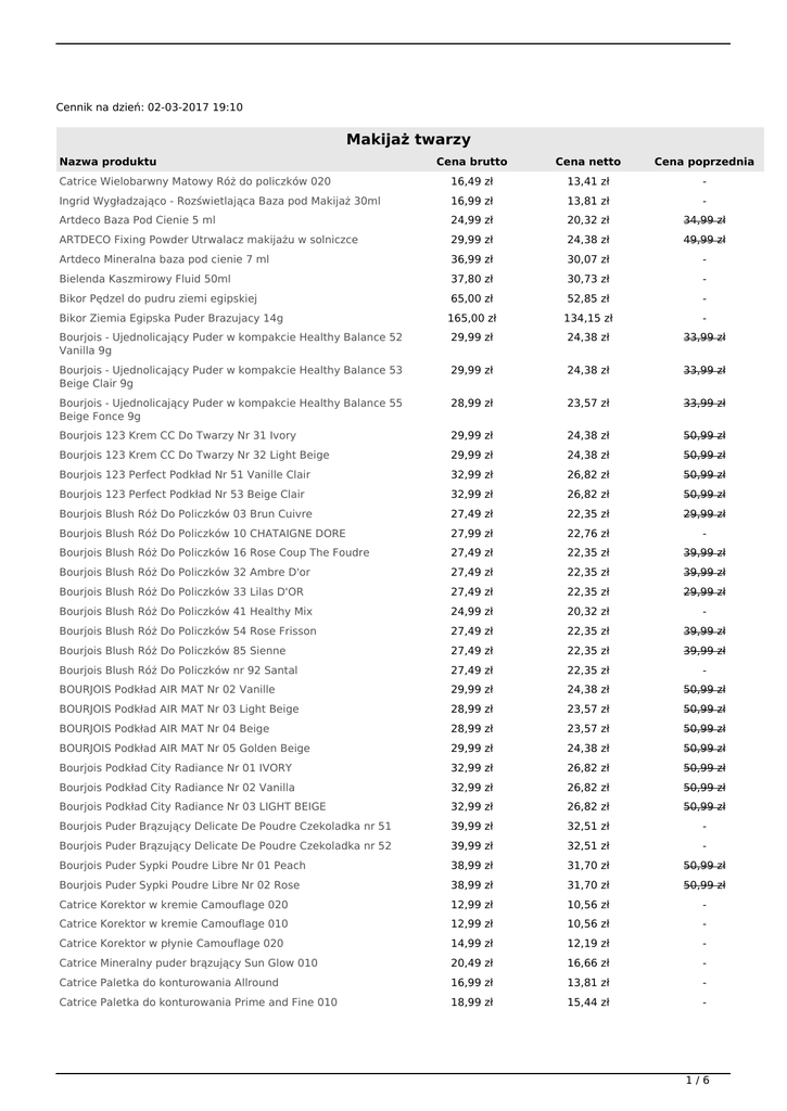 Cennik na dzień: 02-03-2017 19:10 Makijaż twarzy Nazwa produktu Cena brutto Cena netto Cena poprzednia Catrice Wielobarwny Matowy Róż do policzków 020 16,49 zł 13,41 zł - Ingrid Wygładzająco - Rozświetlająca Baza pod Makijaż 30ml 16,99 zł 13,81 zł - Artdeco Baza Pod Cienie 5 ml 24,99 zł 20,32 zł 34,99 zł ARTDECO Fixing Powder Utrwalacz makijażu w solniczce 29,99 zł 24,38 zł 49,99 zł Artdeco Mineralna baza pod cienie 7 ml 36,99 zł 30,07 zł - Bielenda Kaszmirowy Fluid 50ml 37,80 zł 30,73 zł - Bikor Pędzel do pudru ziemi egipskiej 65,00 zł 52,85 zł - 165,00 zł 134,15 zł - Bourjois - Ujednolicający Puder w kompakcie Healthy Balance 52 Vanilla 9g 29,99 zł 24,38 zł 33,99 zł Bourjois - Ujednolicający Puder w kompakcie Healthy Balance 53 Beige Clair 9g 29,99 zł 24,38 zł 33,99 zł Bourjois - Ujednolicający Puder w kompakcie Healthy Balance 55 Beige Fonce 9g 28,99 zł 23,57 zł 33,99 zł Bourjois 123 Krem CC Do Twarzy Nr 31 Ivory 29,99 zł 24,38 zł 50,99 zł Bourjois 123 Krem CC Do Twarzy Nr 32 Light Beige 29,99 zł 24,38 zł 50,99 zł Bourjois 123 Perfect Podkład Nr 51 Vanille Clair 32,99 zł 26,82 zł 50,99 zł Bourjois 123 Perfect Podkład Nr 53 Beige Clair 32,99 zł 26,82 zł 50,99 zł Bourjois Blush Róż Do Policzków 03 Brun Cuivre 27,49 zł 22,35 zł 29,99 zł Bourjois Blush Róż Do Policzków 10 CHATAIGNE DORE 27,99 zł 22,76 zł - Bourjois Blush Róż Do Policzków 16 Rose Coup The Foudre 27,49 zł 22,35 zł 39,99 zł Bourjois Blush Róż Do Policzków 32 Ambre D'or 27,49 zł 22,35 zł 39,99 zł Bourjois Blush Róż Do Policzków 33 Lilas D'OR 27,49 zł 22,35 zł 29,99 zł Bourjois Blush Róż Do Policzków 41 Healthy Mix 24,99 zł 20,32 zł - Bourjois Blush Róż Do Policzków 54 Rose Frisson 27,49 zł 22,35 zł 39,99 zł Bourjois Blush Róż Do Policzków 85 Sienne 27,49 zł 22,35 zł 39,99 zł Bourjois Blush Róż Do Policzków nr 92 Santal 27,49 zł 22,35 zł - BOURJOIS Podkład AIR MAT Nr 02 Vanille 29,99 zł 24,38 zł 50,99 zł BOURJOIS Podkład AIR MAT Nr 03 Light Beige 28,99 zł 23,57 zł 50,99 zł BOURJOIS Podkład AIR MAT Nr 04 Beige 28,99 zł 23,57 zł 50,99 zł BOURJOIS Podkład AIR MAT Nr 05 Golden Beige 29,99 zł 24,38 zł 50,99 zł Bourjois Podkład City Radiance Nr 01 IVORY 32,99 zł 26,82 zł 50,99 zł Bourjois Podkład City Radiance Nr 02 Vanilla 32,99 zł 26,82 zł 50,99 zł Bourjois Podkład City Radiance Nr 03 LIGHT BEIGE 32,99 zł 26,82 zł 50,99 zł Bourjois Puder Brązujący Delicate De Poudre Czekoladka nr 51 39,99 zł 32,51 zł - Bourjois Puder Brązujący Delicate De Poudre Czekoladka nr 52 39,99 zł 32,51 zł - Bourjois Puder Sypki Poudre Libre Nr 01 Peach 38,99 zł 31,70 zł 50,99 zł Bourjois Puder Sypki Poudre Libre Nr 02 Rose 38,99 zł 31,70 zł 50,99 zł Catrice Korektor w kremie Camouflage 020 12,99 zł 10,56 zł - Catrice Korektor w kremie Camouflage 010 12,99 zł 10,56 zł - Catrice Korektor w płynie Camouflage 020 14,99 zł 12,19 zł - Catrice Mineralny puder brązujący Sun Glow 010 20,49 zł 16,66 zł - Catrice Paletka do konturowania Allround 16,99 zł 13,81 zł - Catrice Paletka do konturowania Prime and Fine 010 18,99 zł 15,44 zł - Bikor Ziemia Egipska Puder Brazujacy 14g 1/6 Catrice Puder brązujący Sun Glow Matt 020 16,49 zł 13,41 zł - Catrice Puder brązujący Sun Glow Matt 030 16,49 zł 13,41 zł - Catrice Płynny podkład HD Liquid Coverage 010 32,99 zł 26,82 zł - Catrice Płynny podkład HD Liquid Coverage 020 32,99 zł 26,82 zł - Catrice Płynny podkład HD Liquid Coverage 030 32,99 zł 26,82 zł - Catrice Płynny podkład HD Liquid Coverage 040 32,90 zł 26,75 zł - Catrice Rozświetlacz Deluxe Glow 010 18,99 zł 15,44 zł - Catrice Rozświetlający korektor - Re-Touch Light-Reflecting 005 16,99 zł 13,81 zł - Catrice Rozświetlający korektor - Re-Touch Light-Reflecting 020 16,49 zł 13,41 zł - Delia Baza pod makijaż ZIELONA na niedoskonałości 35ml 14,99 zł 12,19 zł - Delia BIAŁA baza pod makijaż matująca 35 ml 12,99 zł 10,56 zł - Delia korektor kryjąco rozświetlajacy pod oczy nr 03 ivory kość słoniowa 9,99 zł 8,12 zł - Delia Korektor Zielony Korygujący 10ml 9,99 zł 8,12 zł - Delia RÓŻOWA baza pod makijaż ROZŚWIETLAJĄCA 35ml 12,99 zł 10,56 zł - DENI CARTE PUDER RYŻOWY 15 G 19,50 zł 15,85 zł - Dermacol Wygładzająca baza pod makijaż z ekstraktem z pereł 15 ml 28,49 zł 23,16 zł - Ecocera Puder Bambusowy 8g 18,90 zł 15,37 zł 19,99 zł Ecocera Puder Ryżowy Fixer 15g 18,90 zł 15,37 zł 19,99 zł Efekt Syrenki Mix 3,49 zł 2,84 zł - Efekt Syrenki Seledynowy 3,49 zł 2,84 zł - Golden Rose baza pod makijaż matujaca 30 ml 24,99 zł 20,32 zł - Golden Rose Gel look żelowy top coat 10,5 ml 7,99 zł 6,50 zł - Golden Rose puder brązujący terra powder nr 101 17,99 zł 14,63 zł - Golden Rose puder brązujący terra powder nr 104 17,99 zł 14,63 zł - Golden Rose puder brązujący terra powder nr 105 17,99 zł 14,63 zł - Golden Rose puder brązujący terracotta stardust nr 106 28,49 zł 23,16 zł - Golden Rose puder brązujący terracotta stardust nr 107 28,49 zł 23,16 zł - Golden Rose puder matujący Nr 04 9,99 zł 8,12 zł - Golden Rose puder matujący Nr 05 9,99 zł 8,12 zł - Golden Rose puder matujący Nr 06 9,99 zł 8,12 zł - Golden Rose puder matujący Nr 07 9,99 zł 8,12 zł - Golden Rose Quick Dry szybko schnący top coat 10,5 ml 7,99 zł 6,50 zł - Golden Rose róż do policzków powder blush nr 05 Shimmer Rose 18,49 zł 15,03 zł - Golden Rose róż do policzków powder blush nr 09 Soft Rose 18,49 zł 15,03 zł - Golden Rose róż do policzków powder blush nr 11 Nude Sheen 18,49 zł 15,03 zł - Golden Rose róż do policzków silky touch nr 204 11,49 zł 9,34 zł - Golden Rose róż do policzków silky touch nr 207 11,49 zł 9,34 zł - Golden Rose róż do policzków silky touch nr 208 11,49 zł 9,34 zł - Golden Rose róż do policzków silky touch nr 209 11,49 zł 9,34 zł - Golden Rose rozświetlacz w sztyfcie Nr 01 Bright Gold 18,49 zł