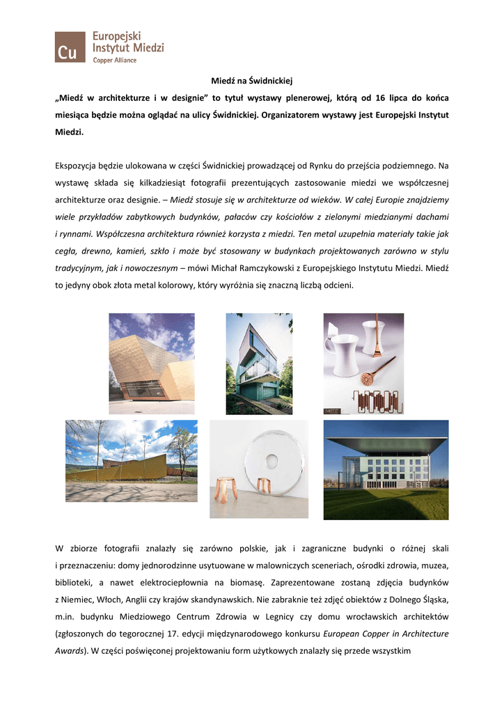 Miedź na Świdnickiej „Miedź w architekturze i w designie” to tytuł wystawy plenerowej, którą od 16 lipca do końca miesiąca będzie można oglądać na ulicy Świdnickiej. Organizatorem wystawy jest Europejski Instytut Miedzi. Ekspozycja będzie ulokowana w części Świdnickiej prowadzącej od Rynku do przejścia podziemnego. Na wystawę składa się kilkadziesiąt fotografii prezentujących zastosowanie miedzi we współczesnej architekturze oraz designie. – Miedź stosuje się w architekturze od wieków. W całej Europie znajdziemy wiele przykładów zabytkowych budynków, pałaców czy kościołów z zielonymi miedzianymi dachami i rynnami. Współczesna architektura również korzysta z miedzi. Ten metal uzupełnia materiały takie jak cegła, drewno, kamień, szkło i może być stosowany w budynkach projektowanych zarówno w stylu tradycyjnym, jak i nowoczesnym – mówi Michał Ramczykowski z Europejskiego Instytutu Miedzi. Miedź to jedyny obok złota metal kolorowy, który wyróżnia się znaczną liczbą odcieni. W zbiorze fotografii znalazły się zarówno polskie, jak i zagraniczne budynki o różnej skali i przeznaczeniu: domy jednorodzinne usytuowane w malowniczych sceneriach, ośrodki zdrowia, muzea, biblioteki, a nawet elektrociepłownia na biomasę. Zaprezentowane zostaną zdjęcia budynków z Niemiec, Włoch, Anglii czy krajów skandynawskich. Nie zabraknie też zdjęć obiektów z Dolnego Śląska, m.in. budynku Miedziowego Centrum Zdrowia w Legnicy czy domu wrocławskich architektów (zgłoszonych do tegorocznej 17. edycji międzynarodowego konkursu European Copper in Architecture Awards). W części poświęconej projektowaniu form użytkowych znalazły się przede wszystkim fotografie miedzianych elementów dekoracji wnętrz autorstwa zagranicznych designerów oraz kultowego taboretu i krzeseł wg projektu Oskara Zięty. Informacje dodatkowe: Europejski Instytut Miedzi (EIM) www.instytutmiedzi.pl działa w ramach światowej organizacji Copper Alliance, której celem jest tworzenie warunków na rynku dla zwiększenia zastosowań produktów z miedzi i jej stopów w wielu dziedzinach gospodarki takich jak energetyka, telekomunikacja, budownictwo, architektura, ochrona środowiska i ochrona zdrowia. Realizowane przez EIM projekty są koordynowane i współfinansowane przez International Copper Association (ICA) z siedzibą w Nowym Jorku. Działalność EIM oparta jest na przekonaniu, iż miedź posiada wyjątkowe właściwości i parametry techniczne, których wykorzystanie pozwala na tworzenie rozwiązań wpływających na poprawę jakości życia. Osoby kontaktowe: Michał Ramczykowski [email protected] Wiktor Balcer [email protected]