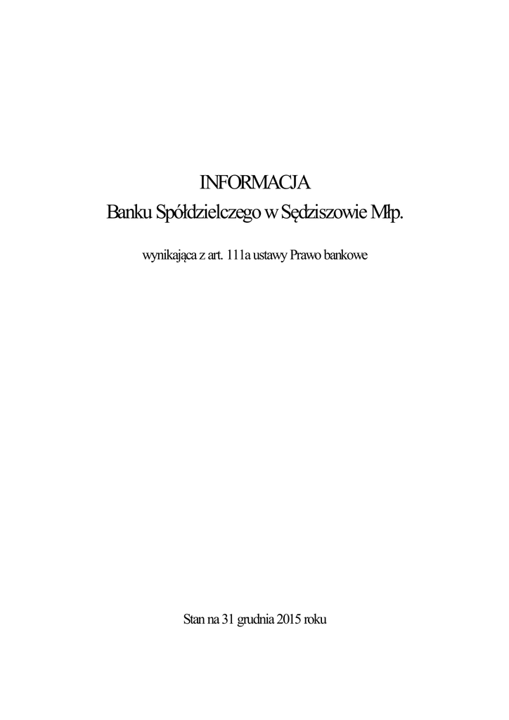 INFORMACJA Banku Spółdzielczego w Sędziszowie Młp. wynikająca z art. 111a ustawy Prawo bankowe Stan na 31 grudnia 2015 roku Spis treści 1. Informacja o działalności Banku Spółdzielczego w Sędziszowie Młp. poza terytorium Rzeczypospolitej Polskiej, w podziale na poszczególne państwa członkowskie i państwa trzecie, w których posiada podmioty zależne, na zasadzie skonsolidowanej w rozumieniu art. 4 ust. 1 pkt 48 Rozporządzenia Parlamentu Europejskiego i Rady (UE) nr 575/2013 z dnia 26 czerwca 2013 r. w sprawie wymogów ostrożnościowych dla instytucji kredytowych i firm inwestycyjnych, zmieniające rozporządzenie (UE) nr 648/2012 za dany rok obrotowy........... 3 3. Opis systemu zarządzania, w tym systemu zarządzania ryzykiem i systemu kontroli wewnętrznej................................................................................................................................ 3 4. Opis polityki wynagrodzeń................................................................................................. 5 5. Informacja o powołaniu komitetu do spraw wynagrodzeń................................................. 6 6. Informacja o spełnianiu przez członków Rady Nadzorczej i Zarządu Banku Spółdzielczego w Sędziszowie Młp. wymogów określonych w art. 22aa ustawy Prawo bankowe...................................................................................................................................... 6 2 1. Informacja o działalności Banku Spółdzielczego w Sędziszowie Młp. poza terytorium Rzeczypospolitej Polskiej, w podziale na poszczególne państwa członkowskie i państwa trzecie, w których posiada podmioty zależne, na zasadzie skonsolidowanej w rozumieniu art. 4 ust. 1 pkt 48 Rozporządzenia Parlamentu Europejskiego i Rady (UE) nr 575/2013 z dnia 26 czerwca 2013 r. w sprawie wymogów ostrożnościowych dla instytucji kredytowych i firm inwestycyjnych, zmieniające rozporządzenie (UE) nr 648/2012 za dany rok obrotowy. Bank Spółdzielczy w Sędziszowie Młp. nie prowadzi działalności poza terytorium Rzeczypospolitej Polskiej. 2. Opis systemu zarządzania, w tym systemu zarządzania ryzykiem i systemu kontroli wewnętrznej. System zarządzania. System zarządzania jest zbiorem zasad i mechanizmów regulujących całokształt działań , których zadaniem jest organizacja procesów decyzyjnych i ocena działalności bankowej. System zarządzania jest dostosowany do charakteru i skali działania Banku. Zadaniem systemu zarządzania jest zapewnienie legalności działania Banku , bezpieczeństwa zgromadzonych w Banku środków, przez ustalenie ryzyka powstającego w działalności. System zarządzania ryzykiem. Zasady i mechanizmy tworzące system zarządzania ryzykiem opracowywane są i uchwalane przez Zarząd w formie polityk/zasad. Rada Nadzorcza sprawuje nadzór nad wprowadzeniem systemu zarządzania oraz ocenia adekwatność i skuteczność tego systemu, w tym ocenia efektywność realizacji wdrożonych polityk/zasad. Bank w ramach systemu zarządzania ryzykiem stosuje: sformalizowane zasady służące określaniu wielkości podejmowanego ryzyka i zasady zarządzania ryzykiem, sformalizowane procedury mające na celu identyfikację, pomiar lub szacowanie oraz monitorowanie ryzyka występującego w działalności Banku, uwzględniające również przewidywany poziom ryzyka w przyszłości, sformalizowane limity ograniczające ryzyko i zasady postępowania w przypadku przekroczenia limitów, przyjęty system sprawozdawczości zarządczej umożliwiający monitorowanie poziomu ryzyka, oraz 3 posiada strukturę organizacyjną dostosowaną do wielkości i profilu ponoszonego przez Bank ryzyka. W strukturze organizacyjnej Banku funkcjonuje Stanowisko zarządzania ryzykami i analiz, które obejmowało swoim zakresem monitorowanie poszczególnych rodzajów ryzyk oraz adekwatności kapitałowej. Struktura zarządzania ryzykami: Rada Nadzorcza Banku Zarząd Banku Stanowisko Zarządzania Ryzykami i Analiz Pozostałe jednostki i komórki organizacyjne Banku Zadaniem systemu zarządzania ryzykiem jest: identyfikacja, pomiar lub szacowanie, monitorowanie ryzyka występującego w działalności Banku. Realizacji tych zadań służą działania podejmowane przez Bank, określone wyżej. Czynności te mają służyć zapewnieniu prawidłowości procesu wyznaczania i realizacji szczegółowych celów działalności prowadzonej przez Bank. System kontroli wewnętrznej. Podstawowym celem systemu kontroli wewnętrznej jest zapewnienie zgodności działania Banku z przepisami prawa, regulacjami wewnętrznymi i standardami rynkowymi. Bank posiada system kontroli wewnętrznej dostosowany do ogólnego profilu ryzyka, tj. obejmuje w szczególności obszary obarczone wysokim ryzykiem. 4 Kontrolę wewnętrzną wykonują: członkowie Zarządu, Główny Księgowy Audyt wewnętrzny Za zorganizowanie oraz prawidłowe funkcjonowanie skutecznego systemu kontroli wewnętrznej odpowiada Zarząd Banku. Rada Nadzorcza Banku sprawuje nadzór nad systemem kontroli wewnętrznej oraz ocenia jego adekwatność i skuteczność. 3. Opis polityki wynagrodzeń. Zgodnie z Uchwałą nr 258/2011 Komisji Nadzoru Finansowego w sprawie szczególnych zasad funkcjonowania systemu zarządzania ryzykiem i systemu kontroli wewnętrznej oraz szczegółowych warunków szacowania przez Banki kapitału wewnętrznego i dokonywania przeglądów procesu szacowania i utrzymywania kapitału wewnętrznego oraz zasad ustalania polityki zmiennych składników wynagrodzeń osób zajmujących stanowiska kierownicze w Banku , Bank wprowadził zasady ustalania zmiennych składników wynagrodzeń , które zostały określone w Polityce zmiennych składników wynagrodzeń osób zajmujących stanowiska kierownicze w Banku Spółdzielczym w Sędziszowie Młp. Podstawowe założenia Polityki zmiennych składników wynagrodzeń : Polityka wspiera prawidłowe i skuteczne zarządzanie ryzykiem, nie zachęcając do pod