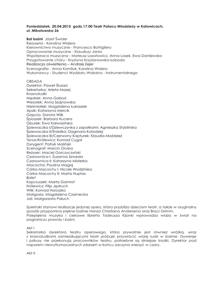 Poniedziałek, 20.04.2015 godz.17.00 Teatr Pałacu Młodzieży w Katowicach, ul. Mikołowska 26 Bal baśni Józef Świder Reżyseria - Karolina Widera Kierownictwo muzyczne - Francesco Bottigliero Opracowanie muzyczne - Klaudiusz Jania Współpraca muzyczna - Mateusz Lasatowicz, Anna Lasek, Ewa Danilewska Przygotowanie chóru - Krystyna Krzyżanowska-Łoboda Realizacja oświetlenia – Andrzej Zejer Scenografia - Anna Korniluk, Karolina Widera Wykonawcy - Studenci Wydziału Wokalno - Instrumentalnego OBSADA Dyrektor: Paweł Ślusarz Sekretarka: Arleta Mazej Krasnoludki Mędrek: Anna Gabryś Wesołek: Anna Szajnowska Nieśmiałek: Magdalena Łukaszek Apsik: Katarzyna Mercik Gapcio: Dorota Wilk Śpioszek: Barbara Kucera Gburek: Ewa Kalwasińska Śpiewaczka I/Dziewczynka z zapałkami: Agnieszka Styblińska Śpiewaczka II/Śnieżka: Dagmara Kołodziej Śpiewaczka III/Czerwony Kapturek: Klaudia Moździeż Tenor/Królewicz: Konrad Cygal Dyrygent: Patryk Moliński Scenograf: Marcin Gruba Reżyser: Maciej Gorczyczyński Czarownica I: Zuzanna Szweda Czarownica II: Katarzyna Misterka Macocha: Paulina Magaj Córka Macochy I: Nicole Wodzińska Córka Macochy II: Marta Huptas Balet Kopciuszek: Marta Gamrot Królewicz: Filip Jędruch Wilk: Konrad Horoszko Małgosia: Magdalena Czarnecka Jaś: Małgorzata Paluch Spektakl stanowi realizacje jedynej opery, która przybliża dzieciom teatr, a także w oryginalny sposób przypomina piękne baśnie Hansa Christiana Andersena oraz Braci Grimm. Przepiękna muzyka i ciekawe libretto Tadeusza Kijonki wprowadza widza w świat na pograniczu prawdy i baśni. Akt I Sekretarka dyrektora teatru operowego, która prywatnie jest również wróżką, wraz z krasnoludkami zamieszkującymi teatr próbuje przywrócić wiarę ludzi w baśnie. Dywersje i psikusy nie przekonują pracowników teatru, potrzebne są silniejsze środki. Dyrektor pod naporem niewytłumaczalnych zdarzeń w końcu zaczyna wierzyć w czary. Akt II Dyrektor wraz z Wróżką chce przekonać pracowników teatru by grali więcej spektakli dla dzieci. Pracownicy oburzeni pomysłem próbują się bronić, lecz w końcu przypominają sobie zapomniane baśnie i decydują się zagrać je dla dzieci. Akt III Wróżka zaprasza postaci z bajek na wielki bal podczas którego rozwiązanie znajdują baśnie: Dziewczynki z zapałkami, Czerwonego Kapturka, Królewny Śnieżki i Kopciuszka. Bal wieńczy jak w każdej bajce szczęśliwe zakończenie. Współpraca - Pałac Młodzieży w Katowicach oraz Orko Group Partner - Tauron Wytwarzanie S.A. www.balbasni.pl