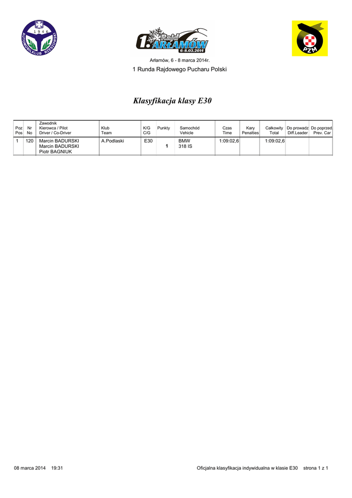 Arłamów, 6 - 8 marca 2014r. 1 Runda Rajdowego Pucharu Polski Klasyfikacja klasy E30 Poz Pos 1 Nr No 120 Zawodnik Kierowca / Pilot Driver / Co-Driver Marcin BADURSKI Marcin BADURSKI Piotr BAGNIUK 08 marca 2014 19:31 Klub Team K/G C/G A.Podlaski E30 Punkty 1 Samochód Vehicle BMW 318 IS Czas Time 1:09:02,6 Kary Penalties Całkowity Do prowadz Do poprzed. Total Diff.Leader Prev. Car 1:09:02,6 Oficjalna klasyfikacja indywidualna w klasie E30 strona 1 z 1