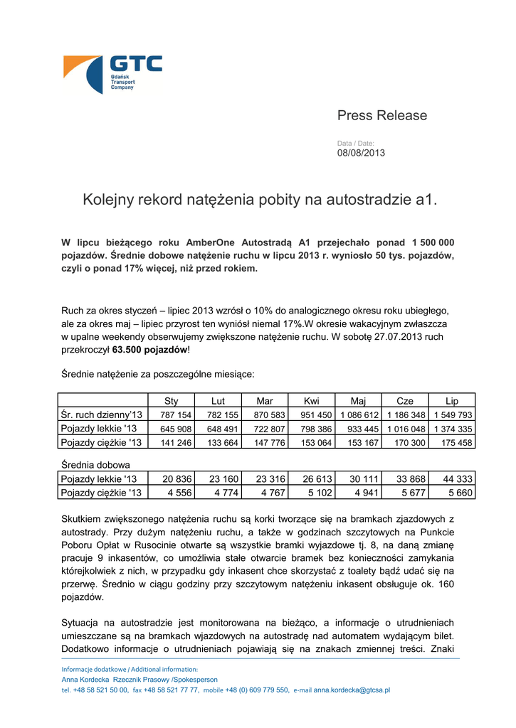 Press Release Data / Date: 08/08/2013 Kolejny rekord natężenia pobity na autostradzie a1. W lipcu bieżącego roku AmberOne Autostradą A1 przejechało ponad 1 500 000 pojazdów. Średnie dobowe natężenie ruchu w lipcu 2013 r. wyniosło 50 tys. pojazdów, czyli o ponad 17% więcej, niż przed rokiem. Ruch za okres styczeń – lipiec 2013 wzrósł o 10% do analogicznego okresu roku ubiegłego, ale za okres maj – lipiec przyrost ten wyniósł niemal 17%.W okresie wakacyjnym zwłaszcza w upalne weekendy obserwujemy zwiększone natężenie ruchu. W sobotę 27.07.2013 ruch przekroczył 63.500 pojazdów! Średnie natężenie za poszczególne miesiące: Sty Śr. ruch dzienny’13 Pojazdy lekkie '13 Pojazdy ciężkie '13 Średnia dobowa Pojazdy lekkie '13 Pojazdy ciężkie '13 Lut Mar Kwi Maj Cze Lip 787 154 782 155 870 583 951 450 1 086 612 1 186 348 1 549 793 645 908 648 491 722 807 798 386 933 445 1 016 048 1 374 335 141 246 133 664 147 776 153 064 153 167 170 300 175 458 20 836 4 556 23 160 4 774 23 316 4 767 26 613 5 102 30 111 4 941 33 868 5 677 44 333 5 660 Skutkiem zwiększonego natężenia ruchu są korki tworzące się na bramkach zjazdowych z autostrady. Przy dużym natężeniu ruchu, a także w godzinach szczytowych na Punkcie Poboru Opłat w Rusocinie otwarte są wszystkie bramki wyjazdowe tj. 8, na daną zmianę pracuje 9 inkasentów, co umożliwia stałe otwarcie bramek bez konieczności zamykania którejkolwiek z nich, w przypadku gdy inkasent chce skorzystać z toalety bądź udać się na przerwę. Średnio w ciągu godziny przy szczytowym natężeniu inkasent obsługuje ok. 160 pojazdów. Sytuacja na autostradzie jest monitorowana na bieżąco, a informacje o utrudnieniach umieszczane są na bramkach wjazdowych na autostradę nad automatem wydającym bilet. Dodatkowo informacje o utrudnieniach pojawiają się na znakach zmiennej treści. Znaki Informacje dodatkowe / Additional information: Anna Kordecka Rzecznik Prasowy /Spokesperson tel. +48 58 521 50 00, fax +48 58 521 77 77, mobile +48 (0) 609 779 550, e-mail [email protected] Strona / Page 2 ustawione są przed zjazdem z autostrady, umożliwiając kierowcy skorzystanie z wcześniejszego zjazdu z autostrady. Na AmberOne Autostradzie A1 istnieje kilka sposobów płatności za przejazd (gotówka, karty płatnicze, karty zbliżeniowe) prowadzimy także zaawansowane negocjacje mające na celu umożliwienie dokonywania płatności za przejazd kartami flotowymi. Dodatkowo prowadzone są rozmowy z Ministerstwem Transportu dotyczące możliwości wprowadzenia ogólnokrajowego elektronicznego poboru opłat, viatoll za przejazd autostradą. Wprowadzenie elektronicznego poboru opłat znacząco skróci czas obsługi kierowców podłączonych do systemu, kierowcy posiadający sprzęt do elektronicznego poboru opłat nie będą musieli zatrzymywać się na bramkach wystarczy, że jedynie zwolnią dojeżdżając na PPO. Kolejną propozycją na zmniejszenie korków w przyszłości, kiedy to do ruchu oddane zostaną kolejne odcinki autostrady, skierowaną przez Gdańsk Transport Company S.A. do Ministra Transportu jest interoperacyjność systemu poboru opłat na AmberOne oraz na odcinkach zarządzanych przez GDDKiA, tj. usunięcie placu poboru opłat w Nowej Wsi, co umożliwi nieprzerwaną podróż z Rusocina na południe kraju i na odwrót. Wprowadzenie interoperacyjności na autostradzie A1 przyniesie nie tylko korzyści ekonomiczne dla skarbu państwa. Nieocenione będą także korzyści społeczne, wprowadzenie interoperacyjności usprawni podróżowanie po autostradach. Takie rozwiązanie zminimalizuje liczbę miejsc, w których użytkownik będzie musiał zatrzymywać się, aby uiścić opłatę za przejazd. Jeśli natomiast interoperacyjność nie zostanie wprowadzona, wówczas kierowcy będą musieli zatrzymywać się i uiszczać opłaty przy każdej zmianie operatora/zarządcy autostrady. Brak interoperacyjności po otwarciu brakujących części autostrady A1 będzie narażać kierowców na jeszcze dłuższe i częstsze korki.