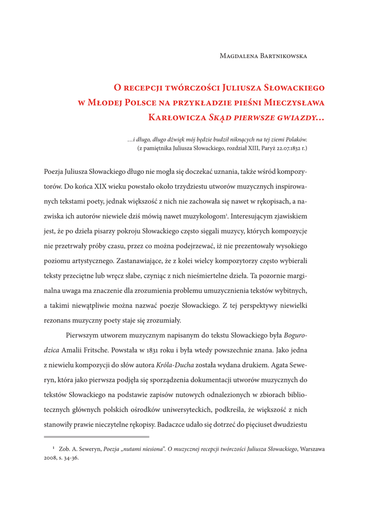 Magdalena Bartnikowska O recepcji twórczości Juliusza Słowackiego w Młodej Polsce na przykładzie pieśni Mieczysława Karłowicza Skąd pierwsze gwiazdy… …i długo, długo dźwięk mój będzie budził niknących na tej ziemi Polaków. (z pamiętnika Juliusza Słowackiego, rozdział XIII, Paryż 22.07.1832 r.) Poezja Juliusza Słowackiego długo nie mogła się doczekać uznania, także wśród kompozytorów. Do końca XIX wieku powstało około trzydziestu utworów muzycznych inspirowanych tekstami poety, jednak większość z nich nie zachowała się nawet w rękopisach, a nazwiska ich autorów niewiele dziś mówią nawet muzykologom1. Interesującym zjawiskiem jest, że po dzieła pisarzy pokroju Słowackiego często sięgali muzycy, których kompozycje nie przetrwały próby czasu, przez co można podejrzewać, iż nie prezentowały wysokiego poziomu artystycznego. Zastanawiające, że z kolei wielcy kompozytorzy często wybierali teksty przeciętne lub wręcz słabe, czyniąc z nich nieśmiertelne dzieła. Ta pozornie marginalna uwaga ma znaczenie dla zrozumienia problemu umuzycznienia tekstów wybitnych, a takimi niewątpliwie można nazwać poezje Słowackiego. Z tej perspektywy niewielki rezonans muzyczny poety staje się zrozumiały. Pierwszym utworem muzycznym napisanym do tekstu Słowackiego była Bogurodzica Amalii Fritsche. Powstała w 1831 roku i była wtedy powszechnie znana. Jako jedna z niewielu kompozycji do słów autora Króla-Ducha została wydana drukiem. Agata Seweryn, która jako pierwsza podjęła się sporządzenia dokumentacji utworów muzycznych do tekstów Słowackiego na podstawie zapisów nutowych odnalezionych w zbiorach bibliotecznych głównych polskich ośrodków uniwersyteckich, podkreśla, że większość z nich stanowiły prawie nieczytelne rękopisy. Badaczce udało się dotrzeć do pięciuset dwudziestu Zob. A. Seweryn, Poezja „nutami niesiona”. O muzycznej recepcji twórczości Juliusza Słowackiego, Warszawa 2008, s. 34-36. 1 O recepcji twórczości Juliusza Słowackiego w Młodej Polsce ośmiu pozycji, na które składają się przede wszystkim pieśni, ale także muzyka do sztuk teatralnych, kantaty, opery i utwory instrumentalne, w tym pisane „ku czci” Słowackiego. Zainteresowanie muzyków dziełami niedocenianego do tej pory poety znacznie nasiliło się przy okazji setnej rocznicy jego urodzin, w latach 1908-1910. Powstało wtedy około czterdziestu pięciu utworów inspirowanych jego tekstami. Komponowali do nich między innymi Henryk Jarecki, Władysław Rzepko, Apolinary Szeluto – współzałożyciel grupy Młoda Polska w muzyce, wreszcie sympatyzujący z tą grupą Mieczysław Karłowicz. Co ciekawe, związany z nią także Karol Szymanowski deklarował wyraźną niechęć do literatury romantyzmu2. Owa fala zainteresowania Słowackim w okresie rozkwitu polskiego modernizmu wydaje się naturalnym zjawiskiem wobec faktu, że Młoda Polska zobaczyła w nim znakomitego poetę, mającego patronować nowej sztuce. Muzyczne adaptacje wierszy Słowackiego to utwory dziś już raczej zapomniane. Jednym z niewielu, które funkcjonują jeszcze w powszechnym obiegu, jest pieśń Mieczysława Karłowicza Skąd pierwsze gwiazdy na niebie zaświecą, napisana do fragmentu poematu W Szwajcarii. Stanowi ona przedmiot tej krótkiej rozprawy. Jednak przed podjęciem szczegółowej analizy utworu warto zarysować problematykę historii interpretacji muzycznej tekstów Słowackiego. Przede wszystkim należy podjąć kwestię recepcji Słowackiego w epoce Młodej Polski. Żeby zrozumieć, jak wielkim fenomenem był Słowacki dla modernistów, warto przytoczyć zdanie Zygmunta Krasińskiego, które tak zaważyło na ówczesnym odbiorze poezji wieszcza, jak niegdyś słynna opinia Mickiewicza o „kościele bez Boga”: „Słowacki nie urodził się rzeźbiarzem, jak Mickiewicz, lecz muzykiem, w którego muzyce płyną farby Coreggia i Rafaela, niesione Beethovena tonami”3. W Słowackim widziano artystę, który w doskonały sposób posługuje się bogatą metaforyką, nawiązującą do różnych dzie- Tamże, s. 19. Muzyka i literatura w: Słownik literatury polskiej XIX wieku, red. J. Bachórz i A. Kowalczykowa, Wrocław, Warszawa, Kraków 1991 2 3 2 O recepcji twórczości Juliusza Słowackiego w Młodej Polsce dzin sztuki. Kolory, dźwięki odgrywają w jego poezji ogromną rolę, co można dostrzec chociażby w poemacie W Szwajcarii. Poeta był zatem wcieleniem ideału artysty, jaki wykształcił się wśród modernistów, broniących się przed konwencją i monotonią. Grono odbiorców sztuki powiększyło się bowiem w owym czasie o mieszczaństwo, które domagało się sztuki łatwej. Czynienie zadość obiegowym gustom prowadziło do wtórności i zaniku indywidualizmu artystycznego. Artyści szukali zatem nowych środków wypowiedzi, które odróżniłyby ich sztukę od szerzącego się kiczu. Poszukiwanie nowego wyrazu doprowadziło ich do chęci wyjścia poza jedną dziedzinę sztuki. Nie tylko dosłownie, przez uprawianie wszelkich rodzajów działalności artystycznej, ale i przez włączanie środków retorycznych jednej dziedziny sztuki do innej, w przypadku literatów poprzez metaforykę, walory dźwiękowe utworów i tym podobne. Żeby zilustrować sąd o synkretycznych dążeniach ówczesnych twórców, warto przytoczyć wiersz satyryczny, który ukazał się w 1902 roku w Die Insel der Blödsinnigen: Piszą wiersze farbami, malują zaś tonami, tworzą wciąż mieszaninę z wszystkich piękna rodzajów, grają nie na pianinie, tylko na swych paletach, pacykują tragedie albo też operetki i śpiewają budowle w rozszalałym chaosie 4. Nie dziwi zatem niesłychana popularność Słowackiego w tym czasie, zwłaszcza gdy się weźmie pod uwagę komentarz Krasińskiego o wszechstronności jego poezji. Tym, co najbardziej fascynowało w niej modernistów, był język – bogaty, wielobarwny, miejscami dosadny. Do przesad
