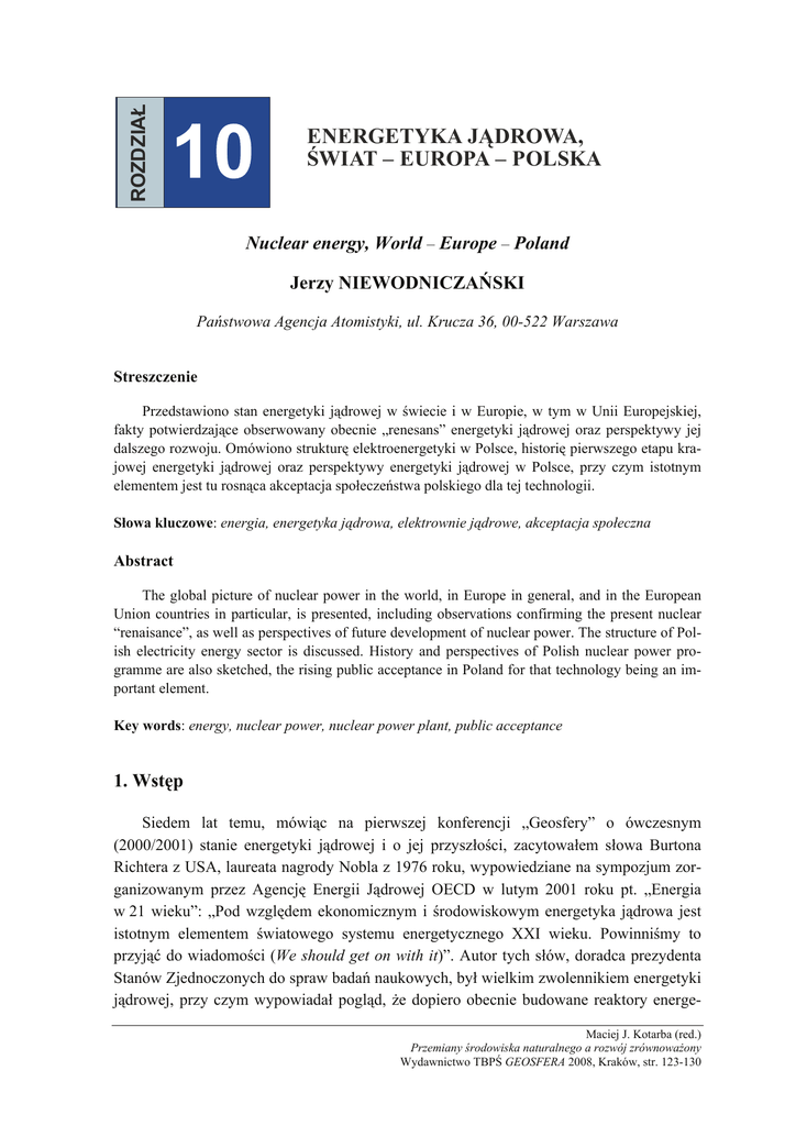 ROZDZIAŁ ENERGETYKA JĄDROWA, ŚWIAT – EUROPA – POLSKA Nuclear energy, World – Europe – Poland Jerzy NIEWODNICZAŃSKI Państwowa Agencja Atomistyki, ul. Krucza 36, 00-522 Warszawa Streszczenie Przedstawiono stan energetyki jądrowej w świecie i w Europie, w tym w Unii Europejskiej, fakty potwierdzające obserwowany obecnie „renesans” energetyki jądrowej oraz perspektywy jej dalszego rozwoju. Omówiono strukturę elektroenergetyki w Polsce, historię pierwszego etapu krajowej energetyki jądrowej oraz perspektywy energetyki jądrowej w Polsce, przy czym istotnym elementem jest tu rosnąca akceptacja społeczeństwa polskiego dla tej technologii. Słowa kluczowe: energia, energetyka jądrowa, elektrownie jądrowe, akceptacja społeczna Abstract The global picture of nuclear power in the world, in Europe in general, and in the European Union countries in particular, is presented, including observations confirming the present nuclear “renaisance”, as well as perspectives of future development of nuclear power. The structure of Polish electricity energy sector is discussed. History and perspectives of Polish nuclear power programme are also sketched, the rising public acceptance in Poland for that technology being an important element. Key words: energy, nuclear power, nuclear power plant, public acceptance 1. Wstęp Siedem lat temu, mówiąc na pierwszej konferencji „Geosfery” o ówczesnym (2000/2001) stanie energetyki jądrowej i o jej przyszłości, zacytowałem słowa Burtona Richtera z USA, laureata nagrody Nobla z 1976 roku, wypowiedziane na sympozjum zorganizowanym przez Agencję Energii Jądrowej OECD w lutym 2001 roku pt. „Energia w 21 wieku”: „Pod względem ekonomicznym i środowiskowym energetyka jądrowa jest istotnym elementem światowego systemu energetycznego XXI wieku. Powinniśmy to przyjąć do wiadomości (We should get on with it)”. Autor tych słów, doradca prezydenta Stanów Zjednoczonych do spraw badań naukowych, był wielkim zwolennikiem energetyki jądrowej, przy czym wypowiadał pogląd, że dopiero obecnie budowane reaktory energeMaciej J. Kotarba (red.) Przemiany środowiska naturalnego a rozwój zrównoważony Wydawnictwo TBPŚ GEOSFERA 2008, Kraków, str. 123-130 tyczne (tzw. trzeciej generacji) przedstawiają dojrzałą technologie, od początku zaprojektowane w celu produkcji energii elektrycznej, natomiast starsze rozwiązania były instalacjami zbudowanym dla produkcji materiału do bomb jądrowych, a energia elektryczna była ich produktem ubocznym. Przewidywany przez niego gwałtowny rozwój energetyki jądrowej w USA i w innych regionach, pod względem technologicznym i ilościowym, uważał Richter za nieunikniony etap w rozwoju cywilizacyjnym świata. Zastanówmy się, jak te prognozy spełniają się w skali globu, Europy i naszego kraju. 2. Renesans jądrowy W ostatnich latach we wszystkich rejonach świata obserwujemy wzrastające zainteresowanie energetyką jądrową. Przyczyn takiego stanu rzeczy jest wiele. Przede wszystkim wzrastająca częstotliwość występowania i rosnąca skala ekstremalnych zjawisk meteorologicznych sprawiły, że zaczynamy wierzyć w znaczenie wpływu gazów cieplarnianych na klimat Ziemi. Ponadto obserwujemy coraz większe znaczenie polityczne złóż surowców energetycznych, dostęp do tych złóż zaczyna decydować o polityce globalnej w stopniu porównywalnym z dawnymi konfliktami zbrojnymi, a bezpieczeństwo energetyczne, będące warunkiem swobodnego rozwoju gospodarczego państw i samodzielnego decydowania o poziomie życia mieszkańców wypiera ze świadomości społeczeństw dotychczasowe rozumienie niepodległości czy niezawisłości politycznej. Wreszcie – postęp w rozwoju technologii jądrowych stopniowo zyskuje uznanie w społeczeństwach i wypiera z pamięci wspomnienia awarii w elektrowniach Three Miles Island z 1979 czy w Czarnobylu w 1986 roku. Energetyka jądrowa oferuje dla elektrowni cieplnych technologię całkowicie pozbawioną emisji gazów cieplarnianych, a bezpieczeństwo dostaw energii zapewnione jest nie tylko poprzez łatwość gromadzenia na terenie elektrowni zapasów paliwa jądrowego na wiele lat eksploatacji (elektrownia jądrowa o mocy 1000 MWe zużywa rocznie około 40 ton paliwa jądrowego, co można przywieźć w jednym wagonie kolejowym, podczas gdy elektrownia węglowa o takiej samej mocy spala trzy pociągi węgla kamiennego dziennie!), ale również dzięki otwartości i wielokierunkowości rynku dostaw paliwa jądrowego. Współczesna energetyka jądrowa, przede wszystkim dzięki wydłużeniu czasu eksploatacji reaktorów, stała się najtańszym źródłem energii elektrycznej, przy czym ceny są tu przewidywalne i stabilne, cena surowca – uranu to jedynie około 5% ceny energii z siłowni jądrowej. Wspomniane wyżej rosnące zainteresowanie energetyką jądrową, zwane często „renesansem” energetyki jądrowej, objawia się w różny sposób. W krajach posiadających reaktory budowane w latach 1970-tych i 1980-tych wprowadza się rozwiązania pozwalające na wydłużenie czasu eksploatacji elektrowni do 50-60 lat. Dotyczy to na przykład Stanów Zjednoczonych, gdzie od lat 1980-tych nie budowano żadnej nowej elektrowni jądrowej, ale jednocześnie zwiększono moc eksploatowanych elektrowni o ponad 20 000 MWe, czyli niejako wzniesiono 20 nowych dużych bloków energetycznych. Zjawisko wydłużania czasu życia elektrowni (i jednocześnie zwiększania ich mocy ponad parametry projektowe) obserwujemy nawet w krajach, w których obowiązuje moratorium na budowę nowych blo124 ków; przykładem może tu być Szwecja. Szereg krajów, obok doskonalenia eksploatowanych elektrowni, wznosi też nowe bloki jądrowe. Obserwujemy to przede wszystkim tam, gdzie gwałtowny wzrost gospodarczy wymaga rosnących dostaw energii elektrycznej. Potwierdza to analiza rozkładu geograficznego nowych elektrowni jądrowych budowanych czy już włączanych do s