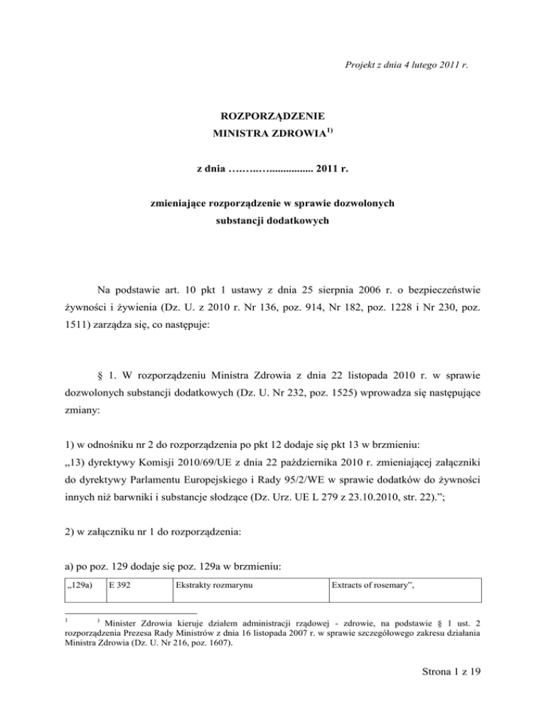 Projekt z dnia 4 lutego 2011 r. ROZPORZĄDZENIE MINISTRA ZDROWIA1) z dnia ….…..…................ 2011 r. zmieniające rozporządzenie w sprawie dozwolonych substancji dodatkowych Na podstawie art. 10 pkt 1 ustawy z dnia 25 sierpnia 2006 r. o bezpieczeństwie żywności i żywienia (Dz. U. z 2010 r. Nr 136, poz. 914, Nr 182, poz. 1228 i Nr 230, poz. 1511) zarządza się, co następuje: § 1. W rozporządzeniu Ministra Zdrowia z dnia 22 listopada 2010 r. w sprawie dozwolonych substancji dodatkowych (Dz. U. Nr 232, poz. 1525) wprowadza się następujące zmiany: 1) w odnośniku nr 2 do rozporządzenia po pkt 12 dodaje się pkt 13 w brzmieniu: „13) dyrektywy Komisji 2010/69/UE z dnia 22 października 2010 r. zmieniającej załączniki do dyrektywy Parlamentu Europejskiego i Rady 95/2/WE w sprawie dodatków do żywności innych niż barwniki i substancje słodzące (Dz. Urz. UE L 279 z 23.10.2010, str. 22).”; 2) w załączniku nr 1 do rozporządzenia: a) po poz. 129 dodaje się poz. 129a w brzmieniu: „129a) 1 E 392 Ekstrakty rozmarynu Extracts of rosemary”, ) Minister Zdrowia kieruje działem administracji rządowej - zdrowie, na podstawie § 1 ust. 2 rozporządzenia Prezesa Rady Ministrów z dnia 16 listopada 2007 r. w sprawie szczegółowego zakresu działania Ministra Zdrowia (Dz. U. Nr 216, poz. 1607). Strona 1 z 19 b) po poz. 151 dodaje się poz. 151a w brzmieniu: „151a) E 427 Cassia gum”, Guma kasja c) po poz. 302 dodaje się poz. 302a w brzmieniu: „302a) E 1203 Polyvinyl alcohol”, Alkohol poliwinylowy d) poz. 321 otrzymuje brzmienie: „321) E 1521 Polyethylene glycol”; Glikole polietylenowe 3) w załączniku nr 4 do rozporządzenia: a) w tabeli 2 „Środki spożywcze, do których wolno stosować ograniczoną liczbę dozwolonych substancji dodatkowych wymienionych”: - poz. 21 otrzymuje brzmienie: „21) Wyroby mięsne, określone w przepisach ustanawiających szczególne przepisy dotyczące higieny w odniesieniu do żywności pochodzenia zwierzęcego, ze świeżego zmielonego mięsa, paczkowane E 261 Octan potasu quantum satis”, E 262i Octan sodu E 262ii Wodorooctan sodu (dioctan sodu) E 300 Kwas askorbinowy E 301 Askorbinian sodu E 202 Askorbinian wapnia E 325 Mleczan sodu E 326 Mleczan potasu E 330 Kwas cytrynowy E 331 Cytryniany sodu E 332 Cytryniany potasu E 333 Cytryniany wapnia - po poz. 32 dodaje się pkt 33 w brzmieniu: „33) Niearomatyzowane fermentowane produkty o charakterze śmietany i ich substytuty o zawartości E 406 Agar E 407 Karagen quantum satis”, Strona 2 z 19 tłuszczu poniżej 20 % E 410 Mączka chleba świętojańskiego E 412 Guma guar E 415 Guma ksantanowa E 440 Pektyny E 460 Celuloza E 466 Karboksymetyloceluloza E 471 Mono i diglicerydy kwasów tłuszczowych E 1404 Skrobia utleniona E 1410 Fosforan monoskrobiowy E 1412 Fosforan diskrobiowy E 1413 Fosforanowany fosforan diskrobiowy E 1414 Acetylowany fosforan diskrobiowy E 1420 Skrobia acetylowana E 1422 Acetylowany adypinian diskrobiowy E 1440 Hydroksypropyloskrobia E 1442 Hydroksypropylofosforan diskrobiowy E 1450 Sól sodowa oktenylobursztynianu skrobiowego E 1451 Acetylowana skrobia utleniona b) w tabeli 4 „Środki spożywcze, do których mogą być stosowane sorbiniany, benzoesany i para-hydroksybenzoesany określone w tabeli 3” po poz. 64 dodaje się poz. 65 – 68 w brzmieniu: „65) Analogi produktów rybnych na bazie wodorostów 66) Piwo w beczkach zawierające więcej niż 200 0, 5 % dodanego cukru fermentującego lub soków owocowych albo koncentratów z owoców 67) Świeże nieobrane owoce cytrusowe (tylko 20 na powierzchnię) 68) Suplementy diety określone w przepisach o suplementach diety, w postaci suchej, zawierające preparaty witaminy A lub połączenie witaminy A i D 1000 500 200 400 1000 w produkcie gotowym do spożycia”, Strona 3 z 19 c) w tabeli 6 „Środki spożywcze, do których mogą być stosowane dwutlenek siarki i siarczyny określone w tabeli 5” po poz. 66 dodaje się poz. 67 i 68 w brzmieniu: „67) Borówki amerykańskie (tylko Vaccinium corymbosum) 68) Cynamon (tylko Cinnamomum ceylanicum) 10 150”, d) w tabeli 7 „Inne konserwanty, dla których określa się maksymalny poziom w środku spożywczym”: - poz. 2 otrzymuje brzmienie: „2) E 234 Nizyna1) Puddingi z semoliny i tapioki oraz produkty podobne 3 mg/kg Sery dojrzewające i sery topione 12,5 mg/kg Clotted cream 10 mg/kg Mascarpone 10 mg/kg Pasteryzowane jaja w postaci płynnej (białko, żółtko lub całe jaja) 6,25 mg/l”, - poz. 5 otrzymuje brzmienie: „5) E 242 Dimetylodiwęglan Aromatyzowane napoje bezalkoholowe 250 mg/l ilość wprowadzona, pozostałość niewykrywalna Wino bezalkoholowe gronowe Płynny koncentrat herbaty Cider, perry, wino owocowe Wino o obniżonej zawartości alkoholu 250 mg/l ilość wprowadzona, pozostałość niewykrywalna”, Napoje winopochodne gronowe i produkty określone w przepisach ustanawiających ogólne zasady definicji, opisu i prezentacji win aromatyzowanych, aromatyzowanych napojów winopochodnych i aromatyzowanych koktajli winopodobnych Strona 4 z 19 - uwaga nr 1 pod tabelą otrzymuje brzmienie „Substancja E 234 może występować w niektórych serach jako wynik procesów fermentacji”, e) w tabeli 9 „Inne przeciwutleniacze oraz ich zastosowanie w środkach spożywczych” po poz. 2 dodaje się poz. 2a w brzmieniu: „2a) „E 392 Ekstrakty rozmarynu Oleje roślinne (z wyjątkiem oliwy z pierwszego tłoczenia i oliwy z oliwek) oraz tłuszcze, w których zawartość wielonienasyconych kwasów tłuszczowych jest wyższa niż 15 % w/w całkowitego kwasu tłuszczowego, do stosowania w środkach spożywczych niepoddawanych obróbce cieplnej 30 mg/kg wyrażone jako suma karnozolu i kwasu karnozowego, w przeliczeniu na zawartość tłuszczu Oleje z ryb i olej z alg 50 mg/kg wyrażone jako suma karnozolu i kwasu karnozowego, w przeliczeniu na zawartość tłuszczu Smalec, tłuszcz wołowy, drobiowy, owczy i wieprzowy Tłuszcze i oleje do p