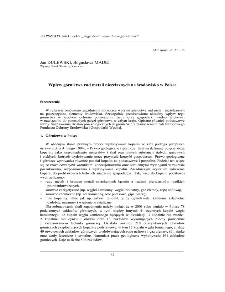 Jan DULEWSKI, Bogusława MADEJ Wpływ górnictwa rud metali