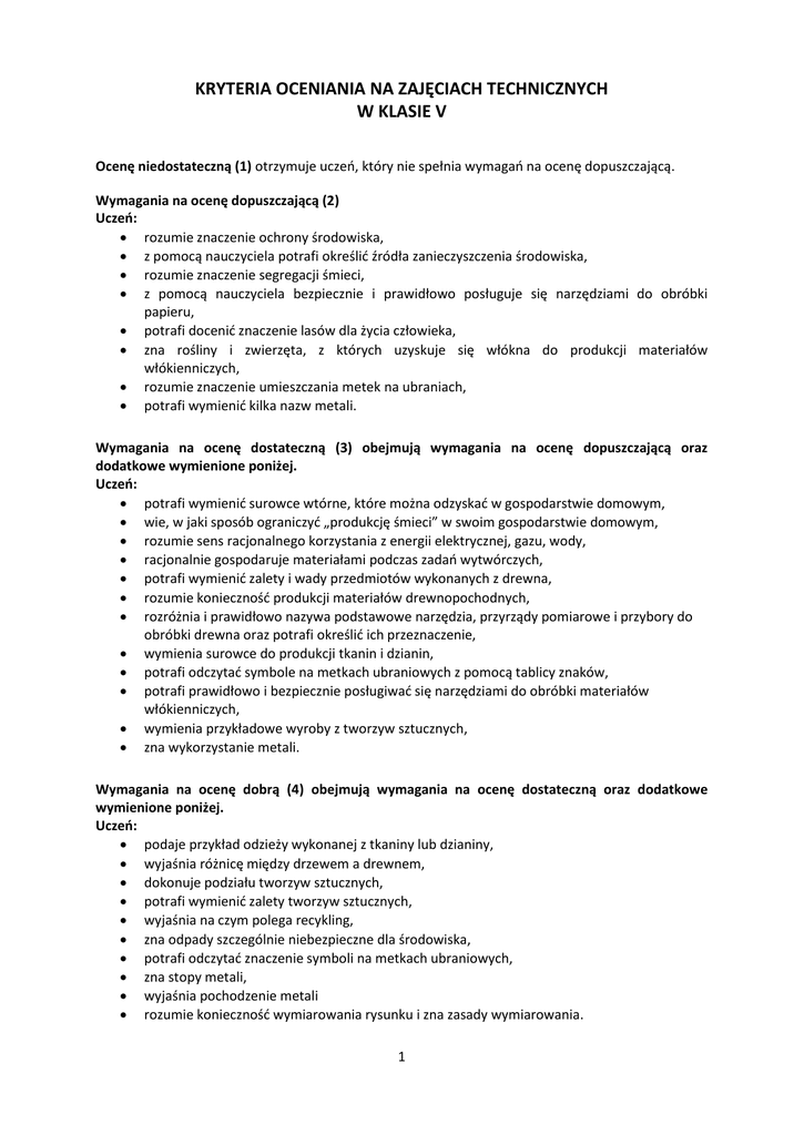 KRYTERIA OCENIANIA NA ZAJĘCIACH TECHNICZNYCH W KLASIE V Ocenę niedostateczną (1) otrzymuje uczeń, który nie spełnia wymagań na ocenę dopuszczającą. Wymagania na ocenę dopuszczającą (2) Uczeń: rozumie znaczenie ochrony środowiska, z pomocą nauczyciela potrafi określić źródła zanieczyszczenia środowiska, rozumie znaczenie segregacji śmieci, z pomocą nauczyciela bezpiecznie i prawidłowo posługuje się narzędziami do obróbki papieru, potrafi docenić znaczenie lasów dla życia człowieka, zna rośliny i zwierzęta, z których uzyskuje się włókna do produkcji materiałów włókienniczych, rozumie znaczenie umieszczania metek na ubraniach, potrafi wymienić kilka nazw metali. Wymagania na ocenę dostateczną (3) obejmują wymagania na ocenę dopuszczającą oraz dodatkowe wymienione poniżej. Uczeń: potrafi wymienić surowce wtórne, które można odzyskać w gospodarstwie domowym, wie, w jaki sposób ograniczyć „produkcję śmieci” w swoim gospodarstwie domowym, rozumie sens racjonalnego korzystania z energii elektrycznej, gazu, wody, racjonalnie gospodaruje materiałami podczas zadań wytwórczych, potrafi wymienić zalety i wady przedmiotów wykonanych z drewna, rozumie konieczność produkcji materiałów drewnopochodnych, rozróżnia i prawidłowo nazywa podstawowe narzędzia, przyrządy pomiarowe i przybory do obróbki drewna oraz potrafi określić ich przeznaczenie, wymienia surowce do produkcji tkanin i dzianin, potrafi odczytać symbole na metkach ubraniowych z pomocą tablicy znaków, potrafi prawidłowo i bezpiecznie posługiwać się narzędziami do obróbki materiałów włókienniczych, wymienia przykładowe wyroby z tworzyw sztucznych, zna wykorzystanie metali. Wymagania na ocenę dobrą (4) obejmują wymagania na ocenę dostateczną oraz dodatkowe wymienione poniżej. Uczeń: podaje przykład odzieży wykonanej z tkaniny lub dzianiny, wyjaśnia różnicę między drzewem a drewnem, dokonuje podziału tworzyw sztucznych, potrafi wymienić zalety tworzyw sztucznych, wyjaśnia na czym polega recykling, zna odpady szczególnie niebezpieczne dla środowiska, potrafi odczytać znaczenie symboli na metkach ubraniowych, zna stopy metali, wyjaśnia pochodzenie metali rozumie konieczność wymiarowania rysunku i zna zasady wymiarowania. 1 Wymagania na ocenę bardzo dobrą (5) obejmują wymagania na ocenę dobrą oraz dodatkowe wymienione poniżej. Uczeń: wyjaśnia potrzebę racjonalnego gospodarowania zasobami leśnymi, potrafi wyjaśnić pojęcie utylizacja, zna zawody związane z lasem i obróbką drewna, zna budowę pnia drewna, potrafi zorganizować stanowisko pracy, zna zalety i wady materiałów włókienniczych pochodzenia naturalnego i sztucznego, potrafi wymienić wady tworzyw sztucznych, potrafi wytłumaczyć zależność między produkcją tworzyw sztucznych a zanieczyszczeniem środowiska, zna właściwości metali. Wymagania na ocenę celującą (6) obejmują wymagania na ocenę bardzo dobrą oraz dodatkowe wymienione poniżej. Uczeń: określa właściwości tkanin i dzianin pochodzenia naturalnego i sztucznego, odróżnia drewno od materiałów drewnopodobnych, potrafi wymienić nazwy materiałów drewnopochodnych, zna podstawowe nazwy włókien sztucznych, wymienia etapy szycia odzieży, potrafi rozróżnić, nazwać i wskazać zastosowanie podstawowych tworzy sztucznych, wykonuje prace wytwórcze charakteryzujące się pomysłowością oraz ekonomicznym wykorzystaniem materiału. 2