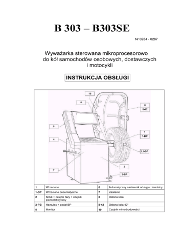 B 303 – B303SE Nr 0284 - 0287 Wyważarka sterowana mikroprocesorowo do kół samochodów osobowych, dostawczych i motocykli INSTRUKCJA OBSŁUGI 1 Wrzeciono 6 Automatyczny nastawnik odstępu i średnicy 1-BP Wrzeciono pneumatyczne 7 Zasilanie 2 Silnik + czujnik fazy + czujnik piezoelektryczny 8 Osłona koła 3-PB Hamulec + pedał BP 8-42 Osłona koła 42" 5 Monitor 10 Czujnik mimośrodowości Spis treści 1. OPIS WYWAŻARKI ............................................................................................................................................3 1.1. PODSTAWOWE WSKAZÓWKI .........................................................................................................................3 STANDARDOWE URZĄDZENIA ZABEZPIECZAJĄCE .....................................................................................3 1.1.1. 1.2. ZAKRES STOSOWANIA .................................................................................................................................3 1.3. WYMIARY ZEWNĘTRZNE........................................................................................................................3 1.4. DANE TECHNICZNE ......................................................................................................................................4 2. PODNOSZENIE I USTAWIANIE............................................................................................................................4 3. URUCHAMIANIE ...............................................................................................................................................5 3.1. MOCOWANIE DO PODŁOŻA ..........................................................................................................................5 3.2. PODŁĄCZENIE ZASILANIA ............................................................................................................................5 3.3. PODŁĄCZENIE SPRĘŻONEGO POWIETRZA (WERSJA SE) ................................................................................5 3.4. DODATKOWE URZĄDZENIA ZABEZPIECZAJĄCE (WERSJA SE) .......................................................................5 3.5. MONTOWANIE UCHWYTU .............................................................................................................................5 3.6. MOCOWANIE I USTAWIANIE OSŁONY ............................................................................................................8 3.7. ELEMENT DYSTANSOWY WD ......................................................................................................................8 4. PULPIT STEROWANIA .......................................................................................................................................8 4.1. PEDAŁ HAMULCA (WERSJA SE) ...................................................................................................................8 4.2. PEDAŁ DO PNEUMATYCZNEGO BLOKOWANIA (WERSJA SE) .........................................................................8 4.3. AUTOMATYCZNY NASTAWNIK ODSTĘPU I ŚREDNICY ....................................................................................9 4.4. AUTOMATYCZNY NASTAWNIK ODSTĘPU (OPCJA) .........................................................................................9 4.5. AUTOMATYCZNE POZYCJONOWANIE KOŁA .................................................................................................9 4.6. WYŚWIETLACZ I PRZYCISKI NA PULPICIE ...................................................................................................10 4.6.1. MENU FUNKCJI ......................................................................................................................................11 5. WPROWADZANIE WYMIARÓW KOŁA...............................................................................................................12 5.1. PRACA 2-OSOBOWA ...................................................................................................................................12 5.2. WPROWADZANIE WYMIARÓW KOŁA...........................................................................................................12 WPROWADZANIE AUTOMATYCZNE.........................................................................................................12 5.2.1. WPROWADZANIE MANUALNE .................................................................................................................14 5.2.2. 5.3. NOWE OBLICZENIE WARTOŚCI NIEWYWAŻENIA .........................................................................................15 5.4. WYNIK POMIARU........................................................................................................................................15 WPROWADZANIE DOKŁADNEJ POZYCJI CIĘŻARKA ..................................................................................15 5.4.1. FUNKCJA SPLIT ......................................................................................................................................16 5.4.2. OPTYMALIZACJA WYWAŻENIA ...............................................................................................................17 5.4.3. PROGRAMY STATYCZNY ORAZ ALU ........................................................................................................18 5.4.4. 5.4.5. AUTOMATYCZNE MINIMALIZOWANIE STATYCZNEGO NIEWYWAŻENIA SZCZĄTKOWEGO........................19 5.5. POMIAR MIMOŚRODOWOŚCI (OPCJA DLA OSŁONY STANDARDOWEJ) ..........................................................19 6. SETUP ............................................................................................................................................................21 6.1. SAMOKONTROLA .......................................................................................................................................21 6.2. SAMOKALIBRACJA ........................................