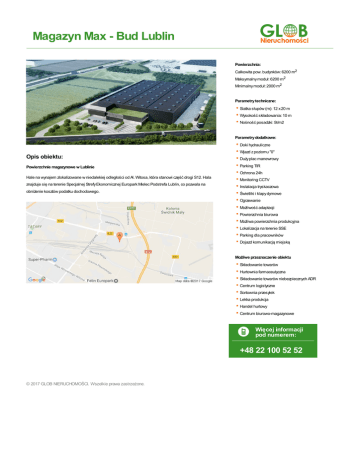 Magazyn Max - Bud Lublin Powierzchnia: Całkowita pow. budynków: 6200 m2 Maksymalny moduł: 6200 m2 Minimalny moduł: 2000 m2 Parametry techniczne: • Siatka słupów (m): 12 x 20 m • Wysokość składowania: 10 m • Nośność posadzki: 5t/m2 Parametry dodatkowe: Opis obiektu: Powierzchnie magazynowe w Lublinie Hale na wynajem zlokalizowane w niedalekiej odległości od Al. Witosa, która stanowi część drogi S12. Hala znajduje się na terenie Specjalnej Strefy Ekonomicznej Europark Mielec Podstrefa Lublin, co pozwala na obniżenie kosztów podatku dochodowego. • Doki hydrauliczne • Wjazd z poziomu "0" • Duży plac manewrowy • Parking TIR • Ochrona 24h • Monitoring CCTV • Instalacja tryskaczowa • Świetliki i klapy dymowe • Ogrzewanie • Możliwość adaptacji • Powierzchnia biurowa • Możliwa powierzchnia produkcyjna • Lokalizacja na terenie SSE • Parking dla pracowników • Dojazd komunikacją miejską Możliwe przeznaczenie obiektu • Składowanie towarów • Hurtownia farmaceutyczna • Składowanie towarów niebezpiecznych ADR • Centrum logistyczne • Sortownia przesyłek • Lekka produkcja • Handel hurtowy • Centrum biurowo-magazynowe Więcej informacji pod numerem: +48 22 100 52 52 © 2017 GLOB NIERUCHOMOŚCI. Wszelkie prawa zastrzeżone.