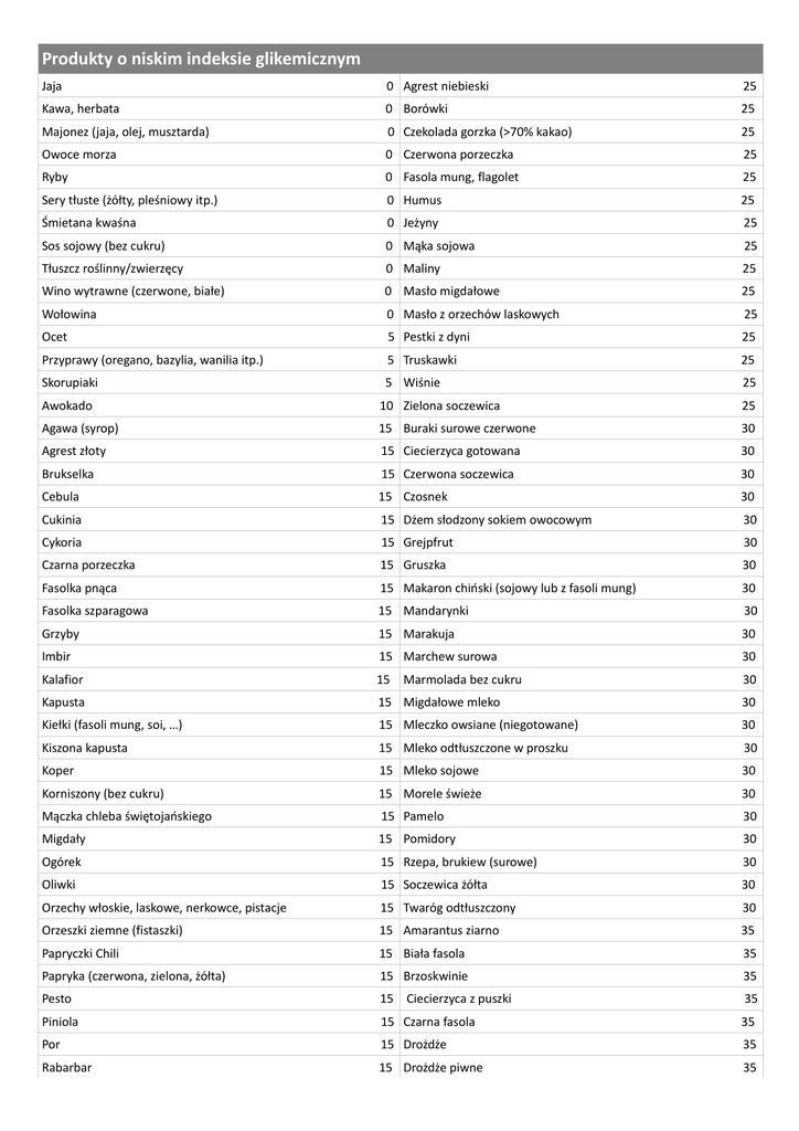 Produkty o niskim indeksie glikemicznym Jaja 0 Agrest niebieski 25 Kawa, herbata 0 Borówki 25 Majonez (jaja, olej, musztarda) 0 Czekolada gorzka (>70% kakao) 25 Owoce morza 0 Czerwona porzeczka 25 Ryby 0 Fasola mung, flagolet 25 Sery tłuste (żółty, pleśniowy itp.) 0 Humus 25 Śmietana kwaśna 0 Jeżyny 25 Sos sojowy (bez cukru) 0 Mąka sojowa 25 Tłuszcz roślinny/zwierzęcy 0 Maliny 25 Wino wytrawne (czerwone, białe) 0 Masło migdałowe 25 Wołowina 0 Masło z orzechów laskowych 25 Ocet 5 Pestki z dyni 25 Przyprawy (oregano, bazylia, wanilia itp.) 5 Truskawki 25 Skorupiaki 5 Wiśnie 25 Awokado 10 Zielona soczewica 25 Agawa (syrop) 15 Buraki surowe czerwone 30 Agrest złoty 15 Ciecierzyca gotowana 30 Brukselka 15 Czerwona soczewica 30 Cebula 15 Czosnek 30 Cukinia 15 Dżem słodzony sokiem owocowym 30 Cykoria 15 Grejpfrut 30 Czarna porzeczka 15 Gruszka 30 Fasolka pnąca 15 Makaron chiński (sojowy lub z fasoli mung) 30 Fasolka szparagowa 15 Mandarynki 30 Grzyby 15 Marakuja 30 Imbir 15 Marchew surowa 30 Kalafior 15 Marmolada bez cukru 30 Kapusta 15 Migdałowe mleko 30 Kiełki (fasoli mung, soi, …) 15 Mleczko owsiane (niegotowane) 30 Kiszona kapusta 15 Mleko odtłuszczone w proszku 30 Koper 15 Mleko sojowe 30 Korniszony (bez cukru) 15 Morele świeże 30 Mączka chleba świętojańskiego 15 Pamelo 30 Migdały 15 Pomidory 30 Ogórek 15 Rzepa, brukiew (surowe) 30 Oliwki 15 Soczewica żółta 30 Orzechy włoskie, laskowe, nerkowce, pistacje 15 Twaróg odtłuszczony 30 Orzeszki ziemne (fistaszki) 15 Amarantus ziarno 35 Papryczki Chili 15 Biała fasola 35 Papryka (czerwona, zielona, żółta) 15 Brzoskwinie 35 Pesto 15 Ciecierzyca z puszki 35 Piniola 15 Czarna fasola 35 Por 15 Drożdże 35 Rabarbar 15 Drożdże piwne 35 Rzodkiew 15 Dziki ryż 35 Sałata 15 Fasola biała - perłowa, borlotti, czarna 35 Seler naciowy 15 Figi świeże 35 Soja 15 Granat 35 Szczaw 15 Groszek zielony 35 Szparagi 15 Jabłka duszone 35 Szpinak 15 Jabłka suszone 35 Tofu 15 Jabłko (świeże) 35 Zarodki (przenne) 15 Jogurt odtłuszczony 35 Acerola 20 Kukurydza antyczna indiańska 35 Karczochy 20 Quinoa (komosa ryżowa) 35 Bakłażan 20 Lody słodzone fruktozą 35 Czekolada gorzka (>80% kakao) 20 Mąka z ciecierzycy 35 Czereśnie 20 Musztarda Dijon 35 Fruktoza 20 Nasiona ( siemie lniane, sezam, mak ) 35 Jogurt sojowy 20 Nektarynki 35 Kakao (bez cukru) 20 Pigwa 35 Pędy bambusa 20 Pomarańcze 35 Sok cytrynowy (niesłodzony) 20 Pomidory suszone 35 Sos z tamaryndy (bez cukru) 20 Przecier pomidorowy 35 Agrest niebieski 20 Seler surowy (korzeń) 35 Borówki 25 Śliwki 35 Sok pomidorowy 35 Sorbet jabłkowy 35 Słonecznik 35 Wasa™ 35 Produkty o średnim indeksie glikemicznym Bób niedojrzały/niegotowany 40 Makaron : typ Capellini 45 Chleb z mąki pp na zaczynie lub drożdżach 40 Płatki śniadaniowe pełne 45 Fasola z puszki 40 Ryż basmati brązowy 45 Figi suszone 40 Sok grejpfrutowy (niesłodzony) 45 Gryka 40 Sok pomarańczowy (świeży, niesłodzony) 45 Kasza gryczana 40 Tosty z chleba z mąki pełnej 45 Laktoza 40 Winogrono (zielone i czerwone) 45 Maca (z mąki pp) 40 Zielony groszek z puszki (bez cukru) 45 Makaron z mąki razowej - al dente 40 Żurawina 45 Marchwiowy sok 40 Bataty - słodkie ziemniaki 50 Masło orzechowe (bez cukru) 40 Chayote - dyniowaty 50 Mleko kokosowe 40 Chleb orkiszowy 50 Morele suszone 40 Ciasto z mąki pp (bez cukru) 50 Otręby (owsiane i pszenne) 40 Couscous ( pełne ziarno) 50 Owies 40 Jabłkowy sok (niesłodzony) 50 Pigwa konserwowa (bez cukru) 40 Kiwi 50 Pumpernikiel (bez cukru, słodu i miodu) 40 Makaron z pszenicy durum 50 Płatki owsiane (niegotowane) 40 Mango 50 Śliwki suszone 40 Muesli (niesłodzone) 50 Spaghetti al. dente (gotowane 5min) 40 Owoce lichee 50 Ananas (świeży) 45 Persymona, kaki 50 Banany niedojrzałe 45 Ryż basmati 50 Chleb pp stostowany 45 Ryż brązowy 50 Chleb żytni (z mąki pp) 45 Sok ananasowy (świeży, niesłodzony) 50 Jęczmień (ziarno) 45 Sok ananasowy (świeży, niesłodzony) 50 kaszka pszenna bulgur 45 Sok jabłkowy (niesłodzony) 50 Kokos 45 Sok żurawinowy (niesłodzony) 50 Mąka z pszenicy egipskiej ( kamut) 45 Surimi (paluszki krabowe) 50 Brzoskwinie z puszki 55 Biszkopt 70 Czerwony ryż 55 Brązowy cukier 70 Ketchup 55 Bułki 70 Maniok 55 Chipsy 70 Musztarda (z cukrem) 55 Chleb ryżowy 70 Nutella® 55 Cukier 70 Papaja 55 Daktyle suszone 70 Sok winogronowy (niesłodzony) 55 Kasza jęczmienna 70 Sok z mango (niesłodzony) 55 Kleik 70 Spaghetti (ugotowane na miękko) 55 Maca (z białej mąki) 70 Sushi 55 Mąka kukurydziana 70 Banany dojrzałe 60 Makaron z białej mąki 70 Jęczmień dmuchany 60 Melasa 70 Kakao słodzone/czekolada (ekspresowe) 60 Napoje (słodzone) 70 Kasza manna 60 Polenta 70 Kasztan 60 Ravioli 70 Lazania (makaron z pszenicy durum) 60 Risotto 70 Lody słodzone cukrem 60 Rogalik 70 Majonez z cukrem 60 Sucharki 70 Melon 60 Tacos 70 Miód 60 Ziemniaki gotowane 70 Mleko tłuste 60 Arbuz 75 Morele z puszki 60 Dynia 75 Owsianka 60 Kabaczek 75 Pizza 60 Bób gotowany 80 Ryż aromatyzowany (jaśminowy…) 60 Marchew gotowana 80 Ryż długoziarnisty 60 Puree 80 Ananas z puszki 65 Biała mąka 85 Buraki gotowane 65 Mleko ryżowe 85 Chleb "razowy" (z białej mąki) 65 Pasternak 85 Chleb pełnoziarnisty 65 Prażona kukurydza 85 Produkty o wysokim indeksie glikemicznym Chleb żytni z białej mąki 65 Płatki kukurydziane 85 Dżem z cukrem 65 Ryż dmuchany 85 Kukurydza 65 Ryż paraboliczny 85 Kuskus 65 Rzepa, brukiew (gotowane) 85 Mąka kasztanowa 65 Seler gotowany (korzeń) 85 Mars®, Snikers®, Nuts®, itp.. 65 Tapioka 85 Muesli (z cukrem, miodem itp.) 65 Chleb z białej mąki 90 Pigwa konserwowa (z cukrem) 65 Mąka ziemniaczana 90 Rodzynki 65 Mąka ryżowa 95 Syrop klonowy 65 Ziemniaki pieczone 95 Tamarynd (słodzony) 65 Ziemniaki zasmażane 95 Ziemniaki w mundurkach 65 Glukoza 100 Amarantus dmuchany 70 Skrobia modyfikowana 100 Bagietka 70 Piwo - maltoza 110 Biały ryż 70