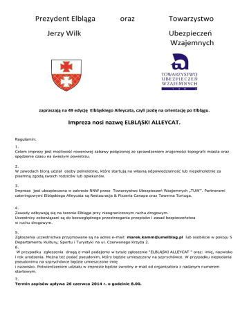 Prezydent Elbląga oraz Jerzy Wilk Towarzystwo Ubezpieczeń Wzajemnych zapraszają na 49 edycję Elbląskiego Alleycata, czyli jazdę na orientację po Elblągu. Impreza nosi nazwę ELBLĄSKI ALLEYCAT. Regulamin: 1. Celem imprezy jest możliwość rowerowej zabawy połączonej ze sprawdzeniem znajomości topografii miasta oraz spędzenie czasu na świeżym powietrzu. 2. W zawodach biorą udział osoby pełnoletnie, które startują na własną odpowiedzialność lub niepełnoletnie za pisemną zgodą swoich rodziców lub opiekunów. 3. Impreza jest ubezpieczona w zakresie NNW przez Towarzystwo Ubezpieczeń Wzajemnych „TUW’’. Partnerami cateringowymi Elbląskiego Alleycata są Restauracja & Pizzeria Canapa oraz Tawerna Tortuga. 4. Zawody odbywają się na terenie Elbląga przy nieograniczonym ruchu drogowym. Uczestnicy zobowiązani są do bezwzględnego przestrzegania przepisów i zasad bezpieczeństwa w ruchu drogowym. 5. Zgłoszenia uczestnictwa przyjmowane są na adres e-mail: [email protected] lub osobiście w pokoju 5 Departamentu Kultury, Sportu i Turystyki na ul. Czerwonego Krzyża 2. 6. W przypadku zgłoszenia drogą e-mail podajemy w tytule zgłoszenia "ELBLĄSKI ALLEYCAT " oraz: imię, nazwisko i rok urodzenia. Można też podać pseudonim, który będzie umieszczony na szprychówce. W przypadku niepodania pseudonimu na szprychówce będzie umieszczone imię i nazwisko. Potwierdzeniem udziału w imprezie będzie zwrotny e-mail od organizatora z nadanym numerem startowym. 7. Termin zapisów upływa 26 czerwca 2014 r. o godzinie 8.00. 8. Po forum zakończeniu zapisów zostanie ogłoszona rowerowym http://www.rowerowe.elblag.pl/oraz lista na startowa na elbląskim stronie http://www.elblag.eu/. 9. Udział w imprezie jest bezpłatny. Każdy z zapisanych i obecnych na starcie uczestników otrzyma mapę Elbląga z zaznaczonymi punktami kontrolnymi i pamiątkową szprychówkę. Sponsorami Elbląskiego Alleycata są : – Towarzystwo Ubezpieczeń Wzajemnych ,,TUW”, Biuro Regionalne w Elblągu, ul. Królewiecka 108 - Restauracja & Pizzeria Canapa w Elblągu, ul. Broniewskiego 51 - Tawerna Tortuga w Elblągu, ul. Bulwar Zygmunta Augusta 1 – Firma Cukiernicza ,,Wolność’’ w Elblągu – Urząd Miejski w Elblągu, Na mecie zawodów wśród obecnych uczestników zostaną rozlosowane za pomocą szprychówek nagrody główne w postaci: Gadżetów firmowych Towarzystwa Ubezpieczeń Wzajemnych ,,TUW’’ Pamiątek miejskich ,,777 lat Elbląga’’ Książek Stowarzyszenia Łączy Nas Kanał Elbląski Lokalnej Grupy Działania w Elblągu Losowanie nagród odbędzie się wśród zawodników obecnych na mecie o godzinie 20.30. 10. Kolejność zdobywania punktów kontrolnych jest dowolna (scorelauf). Podstawową zasadą jest znalezienie WSZYSTKICH punktów kontrolnych i ich opisanie na karcie. Start na trasę 1 lipca 2014 r. o godzinie 18.30 z Placu Słowiańskiego. Uczestnicy startują na wyraźny sygnał organizatora! Zwycięzcą Alleycata zostanie ta osoba, która poprawnie opisze wszystkie punkty kontrolne i najszybciej przejedzie trasę wyścigu, a kartę kontrolną wręczy sędziemu do ręki na mecie w lokalu Tawerna Tortuga ul. Bulwar Zygmunta Augusta 1. Kolejne miejsca będą przydzielane według zasady podanej powyżej, czyli ilość poprawnych odpowiedzi i czas przejazdu. Pomiar czasu jest dokonywany przez organizatora zegarkiem ręcznym. Proszę pamiętać o posiadaniu długopisu. Długość trasy Alleycata to około 20 km. Z uwagi na brak możliwości wprowadzenia rowerów do lokalu proszę pamiętać o posiadaniu zapięć do rowerów. 11. Nieznajomość niniejszego regulaminu nie stanowi podstawy do złożenia protestu, ani nie zwalnia od obowiązku jego przestrzegania. 12. Organizatorem imprezy jest Prezydent Miasta Elbląg we współpracy z Towarzystwem Ubezpieczeń Wzajemnych ,,TUW’’. 13. Wszelkie wątpliwości, skargi, wnioski i zażalenia rozstrzyga ostatecznie organizator w dniu imprezy. 14. Organizator zastrzega sobie prawo do odwołania imprezy bez podawania przyczyn.