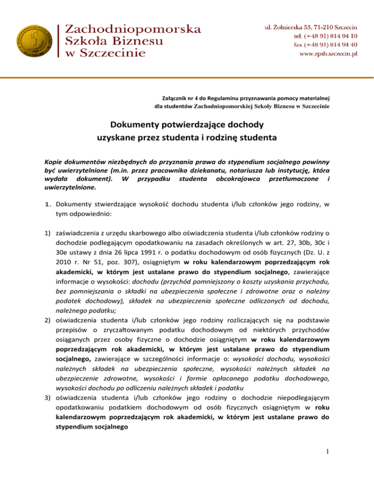 Załącznik nr 4 do Regulaminu przyznawania pomocy materialnej dla studentów Zachodniopomorskiej Szkoły Biznesu w Szczecinie Dokumenty potwierdzające dochody uzyskane przez studenta i rodzinę studenta Kopie dokumentów niezbędnych do przyznania prawa do stypendium socjalnego powinny być uwierzytelnione (m.in. przez pracownika dziekanatu, notariusza lub instytucję, która wydała dokument). W przypadku studenta obcokrajowca przetłumaczone i uwierzytelnione. 1. Dokumenty stwierdzające wysokość dochodu studenta i/lub członków jego rodziny, w tym odpowiednio: 1) zaświadczenia z urzędu skarbowego albo oświadczenia studenta i/lub członków rodziny o dochodzie podlegającym opodatkowaniu na zasadach określonych w art. 27, 30b, 30c i 30e ustawy z dnia 26 lipca 1991 r. o podatku dochodowym od osób fizycznych (Dz. U. z 2010 r. Nr 51, poz. 307), osiągniętym w roku kalendarzowym poprzedzającym rok akademicki, w którym jest ustalane prawo do stypendium socjalnego, zawierające informacje o wysokości: dochodu (przychód pomniejszony o koszty uzyskania przychodu, bez pomniejszania o składki na ubezpieczenia społeczne i zdrowotne oraz o należny podatek dochodowy), składek na ubezpieczenia społeczne odliczonych od dochodu, należnego podatku; 2) oświadczenia studenta i/lub członków jego rodziny rozliczających się na podstawie przepisów o zryczałtowanym podatku dochodowym od niektórych przychodów osiąganych przez osoby fizyczne o dochodzie osiągniętym w roku kalendarzowym poprzedzającym rok akademicki, w którym jest ustalane prawo do stypendium socjalnego, zawierające w szczególności informacje o: wysokości dochodu, wysokości należnych składek na ubezpieczenia społeczne, wysokości należnych składek na ubezpieczenie zdrowotne, wysokości i formie opłacanego podatku dochodowego, wysokości dochodu po odliczeniu należnych składek i podatku 3) oświadczenia studenta i/lub członków jego rodziny o dochodzie niepodlegającym opodatkowaniu podatkiem dochodowym od osób fizycznych osiągniętym w roku kalendarzowym poprzedzającym rok akademicki, w którym jest ustalane prawo do stypendium socjalnego 1 4) zaświadczenia lub oświadczenia studenta i/lub członków jego rodziny zawierające informacje o wysokości składek na ubezpieczenie zdrowotne w roku kalendarzowym poprzedzającym rok akademicki, w którym jest ustalane prawo do stypendium socjalnego 5) oświadczenie studenta w sprawie sytuacji materialnej studenta i jego rodziny 6) zaświadczenie właściwego organu gminy, nakaz płatniczy albo oświadczenie o wielkości gospodarstwa rolnego wyrażonej w hektarach fizycznych i przeliczeniowych ogólnej powierzchni, w roku kalendarzowym poprzedzającym rok akademicki, w którym jest ustalane prawo do stypendium socjalnego 7) kopia umowy dzierżawy – w przypadku oddania części lub całości znajdującego się w posiadaniu rodziny gospodarstwa rolnego w dzierżawę, na podstawie umowy zawartej stosownie do przepisów ustawy z dnia 20 grudnia 1990 r. o ubezpieczeniu społecznym rolników (Dz. U. Nr 7, poz. 24 z późn. zm.), albo oddania gospodarstwa rolnego w dzierżawę w związku z pobieraniem renty określonej w przepisach o wspieraniu rozwoju obszarów wiejskich ze środków pochodzących z Sekcji Gwarancji Europejskiego Funduszu Orientacji i Gwarancji Rolnej, wraz z adnotacją na umowie dzierżawy o wpisie do ewidencji gruntów i budynków lub odrębnym zaświadczeniem o wpisie do ewidencji gruntów i budynków; 8) kopia umowy zawartej w formie aktu notarialnego, w przypadku wniesienia gospodarstwa rolnego do użytkowania przez rolniczą spółdzielnię produkcyjną; 9) przekazy lub przelewy pieniężne dokumentujące wysokość zapłaconych alimentów, jeżeli członkowie rodziny są zobowiązani wyrokiem sądu, ugodą sądową lub ugodą zawartą przed mediatorem do ich płacenia na rzecz osoby spoza rodziny; 10) kopia odpisu podlegającego wykonaniu orzeczenia sądu zasądzającego alimenty na rzecz osób w rodzinie lub poza rodziną lub kopia odpisu protokołu posiedzenia zawierającego treść ugody sądowej, lub kopia odpisu zatwierdzonej przez sąd ugody zawartej przed mediatorem zobowiązujących do alimentów na rzecz osób w rodzinie lub poza rodziną; 11) w przypadku gdy osoba uprawniona nie otrzymała alimentów albo otrzymała je w wysokości niższej od ustalonej w wyroku sądu, ugodzie sądowej lub ugodzie zawartej przed mediatorem: - zaświadczenie organu prowadzącego postępowanie egzekucyjne o całkowitej lub częściowej bezskuteczności egzekucji alimentów, a także o wysokości wyegzekwowanych alimentów, lub - informację właściwego sądu lub właściwej instytucji o podjęciu przez osobę uprawnioną czynności związanych z wykonaniem tytułu wykonawczego za granicą albo o niepodjęciu tych czynności, w szczególności w związku z brakiem podstawy prawnej do ich podjęcia lub brakiem możliwości wskazania przez osobę uprawnioną miejsca zamieszkania dłużnika alimentacyjnego za granicą, jeżeli dłużnik zamieszkuje za granicą; 12) w przypadku utraty dochodu przez studenta i/lub członków jego rodziny – dokument określający datę utraty dochodu oraz miesięczną wysokość utraconego dochodu, do 2 wniosku należy dołączyć wówczas dokument potwierdzający utratę dochodu np. świadectwo pracy, decyzję w sprawie utraty prawa do renty, zasiłku dla bezrobotnych, decyzję o wyrejestrowaniu z ewidencji działalności gospodarczej oraz dokument potwierdzający wysokość utraconego dochodu, np. PIT 11/8, zaświadczenie wystawione przez płatnika dochodu); 13) w przypadku uzyskania dochodu przez studenta i/lub członków jego rodziny: a) dokument określający wysokość dochodu uzyskanego przez studenta i/lub członka jego rodziny oraz liczbę miesięcy, w których dochód był osiągany – w przypadku uzyskania dochodu w roku kalendarzowym poprzedzającym rok akademicki, w którym jest ustalane prawo do s