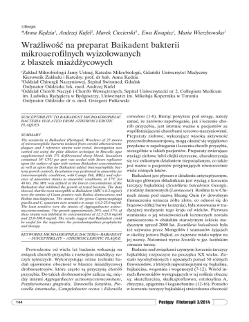 Borgis *Anna Kędzia1, Andrzej Kufel2, Marek Ciecierski3 , Ewa Kwapisz1, Maria Wierzbowska1 Wrażliwość na preparat Baikadent bakterii mikroaerofilnych wyizolowanych z blaszek miażdżycowych Zakład Mikrobiologii Jamy Ustnej, Katedra Mikrobiologii, Gdański Uniwersytet Medyczny Kierownik Zakładu i Katedry: prof. dr hab. Anna Kędzia 2 Oddział Chirurgii Naczyniowej, Szpital Swissmed, Gdańsk Ordynator Oddziału: lek. med. Andrzej Kufel 3 Oddział Chorób Naczyń i Chorób Wewnętrznych, Szpital Uniwersytecki nr 2, Collegium Medicum im. Ludwika Rydygiera w Bydgoszczy, Uniwersytet im. Mikołaja Kopernika w Toruniu Ordynator Oddziału: dr n. med. Grzegorz Pulkowski 1 SUSCEPTIBILITY TO BAIKADENT MICROAEROPHILIC BACTERIA ISOLATED FROM ATHEROSCLEROTIC PLAQUES SUMMARY The sensitivity to Baikadent (Herbapol, Wrocław) of 23 strains of microaerophilic bacteria isolated from carotid atherosclerotic plaques and 5 reference strains were tested. Investigation was carried out using the plate dilution technique in Brucella agar supplemented with 5% defibrynated sheep blood. Inoculum contained 105 CFU per spot was seeded with Steers replicator upon the surface of agar with various Baikadent concentrations as well as upon that no Baikadent added (microaerophilic bacteria growth control). Incubation was performed in anaerobic jar (microaerophilic conditions, with Campy Pak, BBL) and reference of anaerobes strains in anaerobic conditions, at 37°C for 48 hrs. The MIC was defined as the lowest concentrations of the Baikadent that inhibited the growth of tested bacteria. The data showed, that the most susceptible to Baikadent (MIC ≤ 6.2 mg/ml) were the strains of Gram-positive rods Rothia dentocariosa and Rothia mucilaginosa. The strains of the genus Capnocytophaga gracilis and C. sputorum were sensitive in range ≤ 6.2-25.0 mg/ml. The least sensitive were the strains of Aggregatibacter actinomycetemcomitans. The growth approximately 29% and 57% of these strains was inhibited by concentrations of 12.5-25.0 mg/ml and 25.0-100.0 mg/ml. The results suggest that Baikadent could be useful for the supportive the periodontopathies prophylactic and therapy. KEY WORDS: MICROAEROPHILIC BACTERIA – BAIKADENT – SUSCEPTIBILITY – ATHEROSCLEROTIC PLAQUE Prowadzone od wielu lat badania wskazują na związek chorób przyzębia z rozwojem miażdżycy naczyń tętniczych. Wykorzystując różne techniki badań ujawniono obecność w blaszce miażdżycowej drobnoustrojów, które często są przyczyną chorób przyzębia. Do takich drobnoustrojów zalicza się, między innymi Aggregatibacter actinomycetemcomitans, Porphyromonas gingivalis, Tannerella forsythia, Prevotella intermedia, Campylobacter rectus i Eikenella 144 corrodens (1-6). Biorąc powyższe pod uwagę, należy uznać, że zarówno zapobieganie, jak i leczenie chorób przyzębia, jest istotnie ważne u pacjentów ze współistniejącymi chorobami sercowo-naczyniowymi. Preparaty ziołowe, wykazujące wysoką aktywność przeciwdrobnoustrojową, mogą okazać się wyjątkowo przydatne w zapobieganiu i leczeniu chorób przyzębia, szczególnie u takich pacjentów. Preparaty zwierające wyciągi ziołowe lub/i olejki eteryczne, charakteryzują się też znikomym działaniem niepożądanym, co także jest ważne u pacjentów przyjmujących równocześnie wiele różnych leków. Baikadent jest płynem o działaniu antyseptycznym, którego głównym składnikiem jest wyciąg z korzenia tarczycy bajkalskiej (Scutellaria baicalensis Georgi), z rodziny Jasnowatych (Lamiaceae). Roślina ta w Chinach znana pod nazwą Huang Quin (w dowolnym tłumaczeniu oznacza żółte złoto, co odnosi się do brązowo-żółtej barwy korzenia), była stosowana w tradycyjnej medycynie tego kraju od wieków. Pierwsza wzmianka o jej właściwościach leczniczych została zamieszczona w chińskim starożytnym tekście medycznym sprzed 2000 lat. Scutellaria baicalensis była też używana przez Mongołów i szamanów żyjących w okolicy jeziora Bajkał, co zapewne miało wpływ na jej nazwę. Natomiast wyraz Scutella w jęz. łacińskim oznacza tarczę. Badania nad związkami czynnymi korzenia tarczycy bajkalskiej rozpoczęto na początku XX wieku. Zostało wyodrębnionych i opisanych ponad 50 różnych flawonoidów, z których najważniejszymi są: bajkalina, bajkaleina, wogonina i wogonozyd (7-12). Wśród innych flawonoidów występujących w tej roślinie obecne są: skutellareina, skulkaptoflawon, ortoksylina A, chryzyna, apigenina i koganebanina (12-16). Ponadto w korzeniu tarczycy bajkalskiej stwierdzono obecność Postępy Fitoterapii 3/2014 Wrażliwość na preparat Baikadent bakterii mikroaerofilnych wyizolowanych z blaszek miażdżycowych C-glikozydów flawinowych, flawanonów (tj. dihydrobajkaleina, dihydrooroksylina, kartamidyna) oraz chalkonów. Związki występujące w Scutellaria baicalensis wykazują różne właściwości farmakologiczne. Udokumentowano działanie przeciwutleniające, przeciwzapalne i przeciwalergiczne związane z flawonoidami (14, 17, 18). Badania wskazują, że za właściwości przeciwutleniające odpowiedzialne są przede wszystkim bajkaleina i bajkalina, ponieważ zawierają one grupy hydroksylowe i karbonylowe, z którymi wiążą się wolne rodniki (13, 19, 20). W badaniach in vitro wykazano przeciwutleniającą aktywność bajkaleiny w kardiomiocytach oraz jej ochronne działanie na narażone na niedotlenienie komórki mięśnia sercowego (21). Przeprowadzone przez Gao i wsp. (22) doświadczenia na szczurach wskazują, że flawonoid bajkaleina hamuje peroksydację lipidów w mikrosomach wątroby. Ponadto udowodniono, że wyodrębniona z tarczycy bajkalskiej ganhuangeninina posiada wyższą aktywność przeciwutleniajacą niż α-tokoferol (23). Przeciwzapalne działanie rośliny wiąże się także z aktywnością flawonoidów, w tym bajkaleiny i wogoniny. Wykazano doświadczalnie, że bajkaleina, zależnie od dawki, hamuje syntezę leukotri