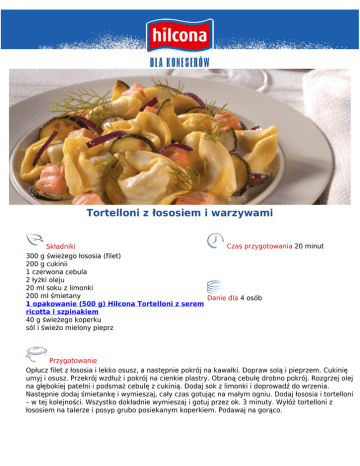 Tortelloni z łososiem i warzywami Czas przygotowania 20 minut Składniki 300 g świeżego łososia (filet) 200 g cukinii 1 czerwona cebula 2 łyżki oleju 20 ml soku z limonki 200 ml śmietany Danie dla 4 osób 1 opakowanie (500 g) Hilcona Tortelloni z serem ricotta i szpinakiem 40 g świeżego koperku sól i świeżo mielony pieprz Przygotowanie Opłucz filet z łososia i lekko osusz, a następnie pokrój na kawałki. Dopraw solą i pieprzem. Cukinię umyj i osusz. Przekrój wzdłuż i pokrój na cienkie plastry. Obraną cebulę drobno pokrój. Rozgrzej olej na głębokiej patelni i podsmaż cebulę z cukinią. Dodaj sok z limonki i doprowadź do wrzenia. Następnie dodaj śmietankę i wymieszaj, cały czas gotując na małym ogniu. Dodaj łososia i tortelloni – w tej kolejności. Wszystko dokładnie wymieszaj i gotuj przez ok. 3 minuty. Wyłóż tortelloni z łososiem na talerze i posyp grubo posiekanym koperkiem. Podawaj na gorąco.