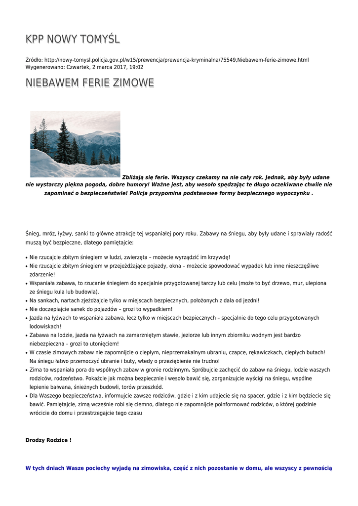 KPP NOWY TOMYŚL Źródło: http://nowy-tomysl.policja.gov.pl/w15/prewencja/prewencja-kryminalna/75549,Niebawem-ferie-zimowe.html Wygenerowano: Czwartek, 2 marca 2017, 19:02 NIEBAWEM FERIE ZIMOWE Zbliżają się ferie. Wszyscy czekamy na nie cały rok. Jednak, aby były udane nie wystarczy piękna pogoda, dobre humory! Ważne jest, aby wesoło spędzając te długo oczekiwane chwile nie zapominać o bezpieczeństwie! Policja przypomina podstawowe formy bezpiecznego wypoczynku . Śnieg, mróz, łyżwy, sanki to główne atrakcje tej wspaniałej pory roku. Zabawy na śniegu, aby były udane i sprawiały radość muszą być bezpieczne, dlatego pamiętajcie: ● Nie rzucajcie zbitym śniegiem w ludzi, zwierzęta – możecie wyrządzić im krzywdę! ● Nie rzucajcie zbitym śniegiem w przejeżdżające pojazdy, okna – możecie spowodować wypadek lub inne nieszczęśliwe zdarzenie! ● Wspaniała zabawa, to rzucanie śniegiem do specjalnie przygotowanej tarczy lub celu (może to być drzewo, mur, ulepiona ze śniegu kula lub budowla). ● Na sankach, nartach zjeżdżajcie tylko w miejscach bezpiecznych, położonych z dala od jezdni! ● Nie doczepiajcie sanek do pojazdów – grozi to wypadkiem! ● Jazda na łyżwach to wspaniała zabawa, lecz tylko w miejscach bezpiecznych – specjalnie do tego celu przygotowanych lodowiskach! ● Zabawa na lodzie, jazda na łyżwach na zamarzniętym stawie, jeziorze lub innym zbiorniku wodnym jest bardzo niebezpieczna – grozi to utonięciem! ● W czasie zimowych zabaw nie zapomnijcie o ciepłym, nieprzemakalnym ubraniu, czapce, rękawiczkach, ciepłych butach! Na śniegu łatwo przemoczyć ubranie i buty, wtedy o przeziębienie nie trudno! ● Zima to wspaniała pora do wspólnych zabaw w gronie rodzinnym. Spróbujcie zachęcić do zabaw na śniegu, lodzie waszych rodziców, rodzeństwo. Pokażcie jak można bezpiecznie i wesoło bawić się, zorganizujcie wyścigi na śniegu, wspólne lepienie bałwana, śnieżnych budowli, torów przeszkód. ● Dla Waszego bezpieczeństwa, informujcie zawsze rodziców, gdzie i z kim udajecie się na spacer, gdzie i z kim będziecie się bawić. Pamiętajcie, zimą wcześnie robi się ciemno, dlatego nie zapomnijcie poinformować rodziców, o której godzinie wrócicie do domu i przestrzegajcie tego czasu Drodzy Rodzice ! W tych dniach Wasze pociechy wyjadą na zimowiska, część z nich pozostanie w domu, ale wszyscy z pewnością będą doskonale bawić się korzystając z zimowej aury. Nie zapomnijcie o ich bezpieczeństwie, przypominajcie o jego zasadach, bądźcie wzorem do naśladowania. Zimowe spacery i wycieczki wykorzystajcie jako okazje do bliższego kontaktu z dzieckiem, a przy okazji zaobserwowanych sytuacji wskazujcie sposoby bezpiecznych zachowań, unikania zagrożeń oraz radzenia sobie w sytuacjach trudnych. GDZIE, W CO I Z KIM BAWI¡ SIÊ NASZE DZIECI Gdy spadnie śnieg, chwyci mróz miejsc do zabaw na powietrzu nie brakuje. Na górkach, lodowiskach robi się tłoczno. Jazda na łyżwach, sankach, rzucanie śnieżkami to wspaniała zabawa. Jednak czy zawsze bezpieczna? Corocznie podczas ferii zimowych dochodzi do utonięć, wypadków podczas doczepiania się sankami do pojazdów lub zjeżdżania na sankach w pobliżu jezdni. Równie często zdarzają się u dzieci uszkodzenia ciała spowodowane uderzeniem zbitym, zanieczyszczonym śniegiem. Uczulajmy nasze dzieci na to, aby nie tylko w domu bawiły się bezpiecznie. Zamarznięty staw, kruchy lód, to nie jedyne zagrożenia. Dni wolne od nauki, brak nadzoru dorosłych często sprzyjają pierwszym kontaktom z alkoholem i narkotykami. Niezwykle ważne jest, aby dzieci informowały o tym, gdzie będą się bawić, jaka to będzie zabawa, w czyim towarzystwie. Pozwoli nam to przewidzieć pewne zagrożenia i w porę im zapobiec. Pamiętajmy, zimą wcześnie robi się ciemno, dlatego ustalmy wspólnie godzinę powrotu dzieci do domu i spowodujmy, aby nasze dzieci były widoczne na drodze i wyposażmy je w elementy odblaskowe. Bezpieczne ferie w miejscu zamieszkania Bardzo często mamy do czynienia z sytuacją, gdy dzieci spędzają zimowy wypoczynek w miejscu zamieszkania i pozostają przez kilka lub kilkanaście godzin bez opieki pracujących rodziców. Dlatego: · nauczmy nasze pociechy, aby pod żadnym pozorem nie wpuszczały obcych ludzi do domu; · dziecko powinno mieć kontakt telefoniczny z rodzicami i informować ich o każdym istniejącym zagrożeniu; · na placach zabaw, w parkach czy skwerach dzieci powinny bawić się w grupie - najlepiej pod okiem dorosłej osoby. Należy „uczulić” dziecko, że nie wolno mu rozmawiać z obcymi, ani oddalać się w ich towarzystwie. · wytłumaczmy naszej latorośli, aby unikała niebezpiecznych miejsc – pokryte lodem rzeki czy jeziorka mogą być bardzo zdradliwe, a zabawa może zakończyć się utratą zdrowia czy życia; · warto również przypomnieć najmłodszym podstawowe zasady bezpieczeństwa podczas poruszania się zimą po drogach; · widząc ślizgające się dzieci w pobliżu ulicy należy im zwrócić uwagę i nie tylko wtedy, gdy wśród nich jest nasze dziecko. W tej sytuacji obojętność i brak reakcji osoby dorosłej mogą doprowadzić do tragedii. · rodzice nastolatków, które udają się na wypoczynek w grupie młodzieży powinni dokładnie wiedzieć gdzie i z kim wybiera się młoda osoba. Starajmy się poznać współuczestników wyjazdu i utrzymujmy z synem lub córką stały kontakt telefoniczny. Wyjeżdżasz na ferie zabezpiecz mieszkanie · Nie opowiadaj wszystkim wkoło, że planujesz dłuższy wyjazd. · Na automatycznej sekretarce telefonu nie zostawiaj wiadomości typu „wyjechaliśmy z miasta, wracamy wtedy i wtedy”. · Klucze do mieszkania przekaż krewnemu lub zaufanemu sąsiadowi, poproś by zbierał ulotki reklamowe spod Twoich drzwi, wieczorem zaś zapalił światło i otworzył okno. Nie zostawiaj kluczy pod wycieraczką! · Cenne przedmioty, dzieła sztuki