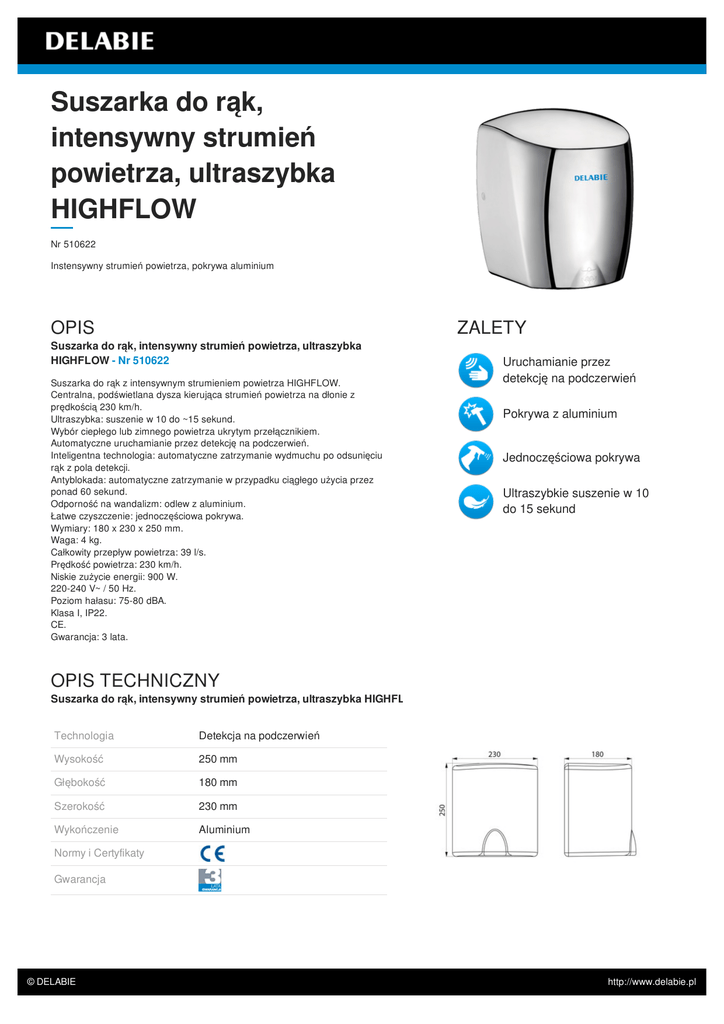 Suszarka do rąk, intensywny strumień powietrza, ultraszybka HIGHFLOW Nr 510622 Instensywny strumień powietrza, pokrywa aluminium OPIS ZALETY Suszarka do rąk, intensywny strumień powietrza, ultraszybka HIGHFLOW - Nr 510622 Suszarka do rąk z intensywnym strumieniem powietrza HIGHFLOW. Centralna, podświetlana dysza kierująca strumień powietrza na dłonie z prędkością 230 km/h. Ultraszybka: suszenie w 10 do ~15 sekund. Wybór ciepłego lub zimnego powietrza ukrytym przełącznikiem. Automatyczne uruchamianie przez detekcję na podczerwień. Inteligentna technologia: automatyczne zatrzymanie wydmuchu po odsunięciu rąk z pola detekcji. Antyblokada: automatyczne zatrzymanie w przypadku ciągłego użycia przez ponad 60 sekund. Odporność na wandalizm: odlew z aluminium. Łatwe czyszczenie: jednoczęściowa pokrywa. Wymiary: 180 x 230 x 250 mm. Waga: 4 kg. Całkowity przepływ powietrza: 39 l/s. Prędkość powietrza: 230 km/h. Niskie zużycie energii: 900 W. 220-240 V~ / 50 Hz. Poziom hałasu: 75-80 dBA. Klasa I, IP22. CE. Gwarancja: 3 lata. Uruchamianie przez detekcję na podczerwień Pokrywa z aluminium Jednoczęściowa pokrywa Ultraszybkie suszenie w 10 do 15 sekund OPIS TECHNICZNY Suszarka do rąk, intensywny strumień powietrza, ultraszybka HIGHFLOW - Nr 510622 Technologia Detekcja na podczerwień Wysokość 250 mm Głębokość 180 mm Szerokość 230 mm Wykończenie Aluminium Normy i Certyfikaty Gwarancja © DELABIE http://www.delabie.pl