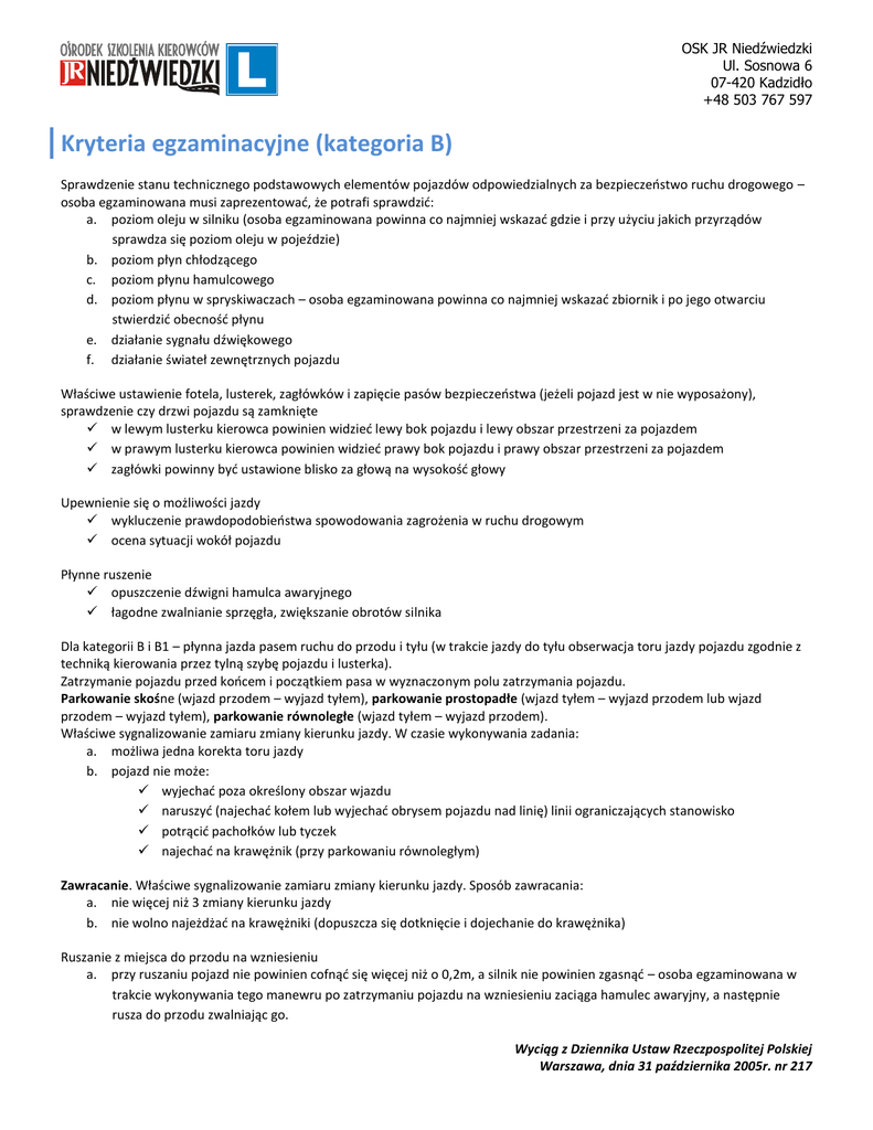 OSK JR Niedźwiedzki Ul. Sosnowa 6 07-420 Kadzidło +48 503 767 597 Kryteria egzaminacyjne (kategoria B) Sprawdzenie stanu technicznego podstawowych elementów pojazdów odpowiedzialnych za bezpieczeostwo ruchu drogowego – osoba egzaminowana musi zaprezentowad, że potrafi sprawdzid: a. poziom oleju w silniku (osoba egzaminowana powinna co najmniej wskazad gdzie i przy użyciu jakich przyrządów sprawdza się poziom oleju w pojeździe) b. poziom płyn chłodzącego c. poziom płynu hamulcowego d. poziom płynu w spryskiwaczach – osoba egzaminowana powinna co najmniej wskazad zbiornik i po jego otwarciu stwierdzid obecnośd płynu e. działanie sygnału dźwiękowego f. działanie świateł zewnętrznych pojazdu Właściwe ustawienie fotela, lusterek, zagłówków i zapięcie pasów bezpieczeostwa (jeżeli pojazd jest w nie wyposażony), sprawdzenie czy drzwi pojazdu są zamknięte w lewym lusterku kierowca powinien widzied lewy bok pojazdu i lewy obszar przestrzeni za pojazdem w prawym lusterku kierowca powinien widzied prawy bok pojazdu i prawy obszar przestrzeni za pojazdem zagłówki powinny byd ustawione blisko za głową na wysokośd głowy Upewnienie się o możliwości jazdy wykluczenie prawdopodobieostwa spowodowania zagrożenia w ruchu drogowym ocena sytuacji wokół pojazdu Płynne ruszenie opuszczenie dźwigni hamulca awaryjnego łagodne zwalnianie sprzęgła, zwiększanie obrotów silnika Dla kategorii B i B1 – płynna jazda pasem ruchu do przodu i tyłu (w trakcie jazdy do tyłu obserwacja toru jazdy pojazdu zgodnie z techniką kierowania przez tylną szybę pojazdu i lusterka). Zatrzymanie pojazdu przed koocem i początkiem pasa w wyznaczonym polu zatrzymania pojazdu. Parkowanie skośne (wjazd przodem – wyjazd tyłem), parkowanie prostopadłe (wjazd tyłem – wyjazd przodem lub wjazd przodem – wyjazd tyłem), parkowanie równoległe (wjazd tyłem – wyjazd przodem). Właściwe sygnalizowanie zamiaru zmiany kierunku jazdy. W czasie wykonywania zadania: a. możliwa jedna korekta toru jazdy b. pojazd nie może: wyjechad poza określony obszar wjazdu naruszyd (najechad kołem lub wyjechad obrysem pojazdu nad linię) linii ograniczających stanowisko potrącid pachołków lub tyczek najechad na krawężnik (przy parkowaniu równoległym) Zawracanie. Właściwe sygnalizowanie zamiaru zmiany kierunku jazdy. Sposób zawracania: a. nie więcej niż 3 zmiany kierunku jazdy b. nie wolno najeżdżad na krawężniki (dopuszcza się dotknięcie i dojechanie do krawężnika) Ruszanie z miejsca do przodu na wzniesieniu a. przy ruszaniu pojazd nie powinien cofnąd się więcej niż o 0,2m, a silnik nie powinien zgasnąd – osoba egzaminowana w trakcie wykonywania tego manewru po zatrzymaniu pojazdu na wzniesieniu zaciąga hamulec awaryjny, a następnie rusza do przodu zwalniając go. Wyciąg z Dziennika Ustaw Rzeczpospolitej Polskiej Warszawa, dnia 31 października 2005r. nr 217 OSK JR Niedźwiedzki Ul. Sosnowa 6 07-420 Kadzidło +48 503 767 597 Zadania egzaminacyjne (kategoria B) 1. Wjazd na drogę z obiektu przydrożnego. 2. Jazda drogami dwukierunkowymi jedno- i dwujezdniowymi: a. o różnej liczbie wyznaczonych i niewyznaczonych pasów ruchu b. posiadającymi odcinki proste i łuki, wzniesienia i spadki, obniżone i podwyższone dopuszczalne prędkości 3. Jazda drogami jednokierunkowymi o różnej liczbie wyznaczonych i niewyznaczonych pasów ruchu. 4. Przejazd przez skrzyżowania: a. równorzędne (trzy- i czterowylotowe) b. oznakowane znakami ustalającymi pierwszeostwo przejazdu (znak A7, B20, D1 oraz w połączeniu z tabliczkami T6a i c) c. z sygnalizacją świetlną d. na których ruch odbywa się wokół wyspy * e. dwupoziomowe (wjazd i zjazd) 5. Przejazd przez przejście dla pieszych. 6. W przypadku egzaminu dla kategorii B i B1 prawa jazdy wykonanie manewrów: a. parkowanie prostopadłe lub skośne – wjazd przodem, wyjazd tyłem (możliwa jedna korekta toru jazdy) miejsce do parkowania wyznacza egzaminator, wskazując je osobie egzaminowanej po zaparkowaniu musi byd możliwośd opuszczenia pojazdu przez kierowcę i pasażera z obydwu stron pojazdu, a pojazd musi byd zaparkowany w sposób zgodny z przepisami ruchu drogowego parkowanie odbywa się z zachowaniem zasad ruchu drogowego b. parkowanie równoległe pomiędzy dwoma pojazdami (manewr jest wykonywany, jeżeli jest możliwe wyznaczenie miejsca do parkowania – możliwa jedna korekta toru jazdy) – wjazd tyłem, wyjazd przodem miejsce do parkowania wyznacza egzaminator, wskazując je osobie egzaminowanej długośd miejsca do parkowania pomiędzy pojazdami powinna stanowid około 2-krotności długości pojazdu egzaminacyjnego w trakcie wykonywania manewru możliwa jest jedna korekta toru jazdy po zaparkowaniu pojazd nie może stwarzad zagrożenia dla bezpieczeostwa ruchu drogowego w przypadku kiedy pojazd parkuje równolegle do krawężnika, w trakcie wykonywania manewru nie może najechad na krawężnik c. zawracanie na drodze jednojezdniowej – dwukierunkowej – możliwośd wykonania manewru przy wykorzystaniu infrastruktury drogowej (bramy, wjazdy, podjazdy, zatoczki.) – zawracanie musi odbyd się przy użyciu biegu wstecznego miejsce do zawracania wyznacza egzaminator ** ** ** 7. Przejazd przez torowisko tramwajowe i kolejowe oraz obok przystanku tramwajowego i utobusowego. 8. Wykonanie manewrów a. wyprzedzania, omijania, wymijania, zmiany pasa ruchu i kierunku jazdy w lewo, prawo oraz zawracania na skrzyżowaniu 9. Hamowanie od prędkości co najmniej 50km/h do zatrzymania w wyznaczonym miejscu (manewr może byd wykonany na placu manewrowym ośrodka egzaminowania). 10. Hamowanie wykonywane w sytuacjach awaryjnych (nieobowiązkowe) manewr może byd wykonany na placu manewrowym ośrodka egzaminowania Wyciąg z Dziennika Ustaw Rzeczpospolitej Polskiej Warszawa, dnia 31 października 2005r. nr 217 * dotyczy miast posiadających przejazd kolejowy lub skrzyżowanie dwupoziomowe położone w odległośc