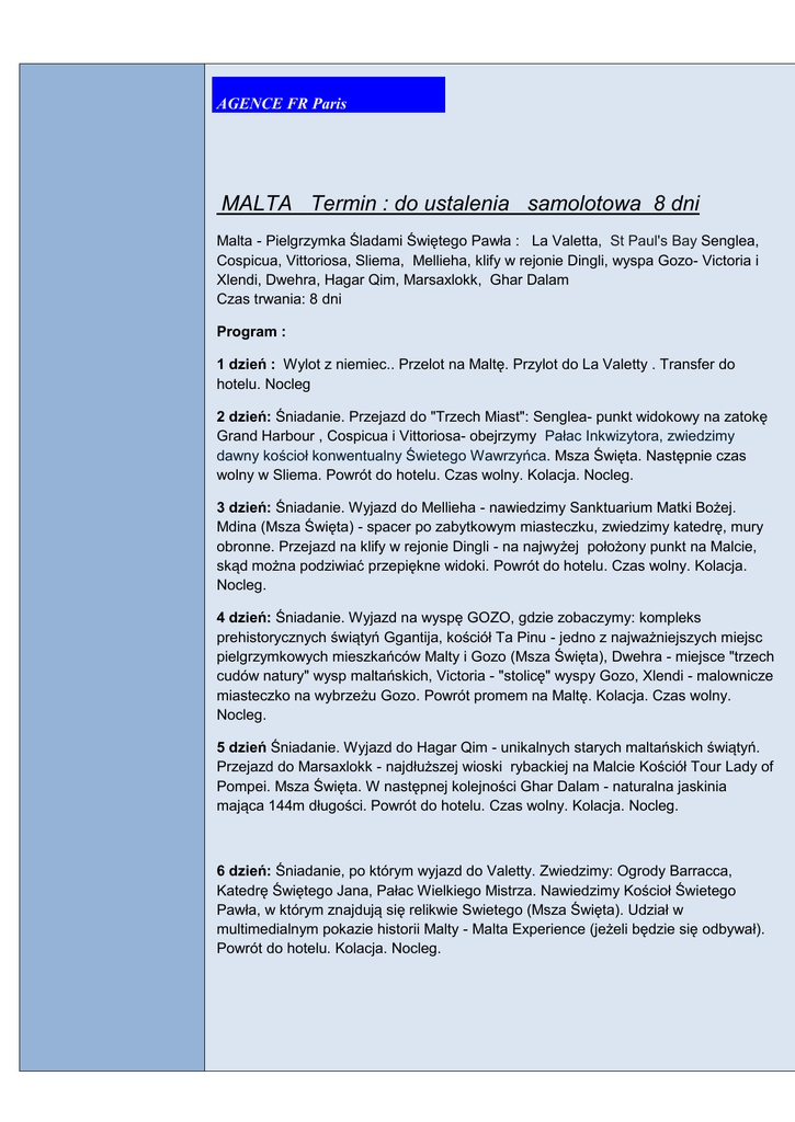 AGENCE FR Paris MALTA Termin : do ustalenia samolotowa 8 dni Malta - Pielgrzymka Śladami Świętego Pawła : La Valetta, St Paul's Bay Senglea, Cospicua, Vittoriosa, Sliema, Mellieha, klify w rejonie Dingli, wyspa Gozo- Victoria i Xlendi, Dwehra, Hagar Qim, Marsaxlokk, Ghar Dalam Czas trwania: 8 dni Program : 1 dzień : Wylot z niemiec.. Przelot na Maltę. Przylot do La Valetty . Transfer do hotelu. Nocleg 2 dzień: Śniadanie. Przejazd do "Trzech Miast": Senglea- punkt widokowy na zatokę Grand Harbour , Cospicua i Vittoriosa- obejrzymy Pałac Inkwizytora, zwiedzimy dawny kościoł konwentualny Świetego Wawrzyńca. Msza Święta. Następnie czas wolny w Sliema. Powrót do hotelu. Czas wolny. Kolacja. Nocleg. 3 dzień: Śniadanie. Wyjazd do Mellieha - nawiedzimy Sanktuarium Matki Bożej. Mdina (Msza Święta) - spacer po zabytkowym miasteczku, zwiedzimy katedrę, mury obronne. Przejazd na klify w rejonie Dingli - na najwyżej położony punkt na Malcie, skąd można podziwiać przepiękne widoki. Powrót do hotelu. Czas wolny. Kolacja. Nocleg. 4 dzień: Śniadanie. Wyjazd na wyspę GOZO, gdzie zobaczymy: kompleks prehistorycznych świątyń Ggantija, kościół Ta Pinu - jedno z najważniejszych miejsc pielgrzymkowych mieszkańców Malty i Gozo (Msza Święta), Dwehra - miejsce "trzech cudów natury" wysp maltańskich, Victoria - "stolicę" wyspy Gozo, Xlendi - malownicze miasteczko na wybrzeżu Gozo. Powrót promem na Maltę. Kolacja. Czas wolny. Nocleg. 5 dzień Śniadanie. Wyjazd do Hagar Qim - unikalnych starych maltańskich świątyń. Przejazd do Marsaxlokk - najdłuższej wioski rybackiej na Malcie Kościół Tour Lady of Pompei. Msza Święta. W następnej kolejności Ghar Dalam - naturalna jaskinia mająca 144m długości. Powrót do hotelu. Czas wolny. Kolacja. Nocleg. 6 dzień: Śniadanie, po którym wyjazd do Valetty. Zwiedzimy: Ogrody Barracca, Katedrę Świętego Jana, Pałac Wielkiego Mistrza. Nawiedzimy Kościoł Świetego Pawła, w którym znajdują się relikwie Swietego (Msza Święta). Udział w multimedialnym pokazie historii Malty - Malta Experience (jeżeli będzie się odbywał). Powrót do hotelu. Kolacja. Nocleg. 7 dzień: Śniadanie. Msza Święta. Dzień wypoczynku do dyspozycji pielgrzymów. Możliwość pobytu na plaży i kąpieli w morzu. Obiadokolacja i nocleg. 8 dzień: Śniadanie. Transfer na lotnisko. Wylot z Malty,. Zakończenie pielgrzymki. Ubezpieczenie: koszty leczenia za granica 20 000,00 EUR , NNW 20 000,00 PLN Zestawy słuchawkowe, identyfikatory ze smyczą, chusty i śpiewniki pielgrzymkowe , w cenie wyjazdu. Statek i prom na Wyspę Gozo, wliczony w cenę. Pielgrzymka 8dniowa w tym, 7 noclegów, 7 śniadań, 7 kolacji. Noclegi w hotelu ****, pokoje 2osobowe lub 3-osobowe. Wszystkie pokoje wyposażane w łazienkę, toaletę, telewizor, telefon, ręczniki i suszarkę. Śniadania (w formie bufetu), kolacje 3-daniowe + woda + pieczywo, pozostałe napoje płatne dodatkowo. Cena: 0,00 EUR Dopłata do pokoju jednoosobowego : 0,00 EUR Bilety wstępów : zależnie od wybranych muzeów, płatne u pilota na miejscu. Dodatkowe rejsy, nie wliczone w cenę, dla chętnych : Błękitna Grota 0,00 EUR, Lazurowe Okno 0,00 EUR, W cenie jedno miejsce gratis np. dla Kaplana. Tel. Peter Jesssuek 0172 7419570
