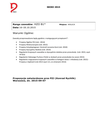 SKOKI 2015 Ranga zawodów: HZO B1* Miejsce: WOLICA Data:16-18.10.2015 Warunki Ogólne: Zawody przeprowadzone będą zgodnie z następującymi przepisami*: Przepisy Ogólne PZJ (rok:: 2014) Przepisy Weterynaryjne (rok: 2015) Przepisy Antydopingowe i Kontroli Leczenia Koni (rok: 2010) Przepisy Dyscypliny Skoków (rok: 2014) Regulamin krajowych zawodów w dyscyplinie skoków przez przeszkody (rok: 2015; wyd. 10.9/a) Regulamin Halowego Pucharu Polski w skokach przez przeszkody (na sezon 2015) Regulamin rozgrywania krajowych zawodów w kategorii dzieci i młodzieży (rok: 2015) Przepisy o Sędziach (rok 2013 wyd. 6.5, ze zmianami 2014) Propozycje zatwierdzone prze PZJ (Konrad Rychlik) Warszawa, dn. 2015-09-07 SKOKI 2015 I. INFORMACJE OGÓLNE 1. Zawody: 1.1 Zawody Ogólnopolskie: Ranga zawodów: 1* 2* 3* ZO-B CSN ZODiM-B Zawody halowe: T Kategoria: Seniorzy Młodzi Jeźdźcy Kuce i Małe Konie 1.2 Mistrzostwa Polski: Kategoria: Seniorzy Kuce T Młodzi Jeźdźcy 1.3 Puchar Polski: T N Halowy T N Kategoria: Seniorzy Młodzi Jeźdźcy Kuce i Małe Konie Kuce Juniorzy Juniorzy Młodsi N Juniorzy Juniorzy Juniorzy Młodsi Juniorzy Młodsi Data : 16-18.10.2015 Miejsce: Wolica Uczestnicy: 2. Organizator Nazwa: Klub Jeździecki Wolica Adres: Wolica 1 g Kod pocztowy: 62-872 Godziesze Telefon: 62-76-12-564 Email : [email protected] Internet: Fax : 62-76-12-564 SKOKI 2015 3. Komitet Organizacyjny Przewodniczący: Andrzej Kuświk Dyrektor Zawodów: Biuro Zawodów: Szef Stajni: Krystyna Kuświk Jerzy Skowronski 4. Dane kontaktowe na miejscu zawodów: Adres: Wolica 1 g ,62-872 Godziesze Tel.: 62-76-12-564 Telefon kom.: 605552137 II. OSOBY OFICJALNE (zgodnie z Przepisami o Sędziach wyd. 5, art.14 p.3) 1. Komisja Sędziowska: Przewodniczący: Tadeusz Szymoniak Sędzia PZJ: Robert Bartkowiak Członkowie: Katarzyna Meger 2. Delegat Techniczny: Asystent Delegata Technicznego 3. Gospodarz Toru: Krzysztof Kierzek Asystent Gospodarza Toru : Wiesław Laskowski 4. Szef Komisarzy: Małgorzata Krawczyk 5. Komisarz:Weronika Filipiak 6. Delegat weterynaryjny PZJ: 7. Lekarz weterynarii zawodów: Michał Stanisławiak 8. Komisja Odwoławcza: III WARUNKI TECHNICZNE Otwarcie stajni data 15.10.2015 godzina 12.00 Zebranie techniczne Przegląd Weterynaryjny Plac konkursowy/hala: podłoże: kwarcowe z włókniną wymiary:21x 70 Rozprężalnia: podłoże: piasek wymiary:20x40 Producent łyżek bezpieczeństwa (PZJ - Przepisy Dyscypliny B – Art 210): GALA inż. Włodzimierz Uchwat SKOKI 2015 IV. WARUNKI UCZESTNICTWA 1.Uczestnictwo Zgodnie z Art. 18 p. 1-5 i Art. 29 p.1-2 Przepisów Ogólnych PZJ oraz Art. 1 p. 2 Regulaminu Dyscypliny Skoków: 2. Zgłoszenia: Termin zgłoszeń wstępnych:..02.10.2015 Termin zgłoszeń ostatecznych:09.10.2015 Zgłoszenia prosimy wysyłać na adres: Wolica 1 g ,62-872 Godziesze Fax :62-76-12-564 Email: [email protected] Zgłoszenia ważne tylko z dołaczonym dowodem wpłaty na konto (150 zł od konia zaliczkowo) Konto KJ Wolica KB Kalisz 29 2030 0045 11100000 0133 4400 Zgłoszenia wyłącznie na drukach PZJ (w załączeniu) 3. Warunki finansowe: Boksy o wymiarach 9 m2 - opłata za boks:300 zł Wpisowe: 160 zł - dla koni startujących w MRi ŚR 200 zł - dla koni startujących w DR Opłata za program badań antydopingowych 15 zł od konia Pasza i siano własne: T N / na koszt KO: T Nx Podłączenie samochodu do prądu:200 zł Istnieje możliwość zakupu siana i słomy -10 zł balot 4. Zakwaterowanie i wyżywienie: na koszt własny: T N na koszt KO: T N Pokoje nad domem: - pokój z łazienką: 50 zł/osobę/dobę - pokój bez łazienki (łazienka na korytarzu): 40 zł/osobę/dobę Pokoje przy hali: - pokój 1 osobowy z łazienką: 120 zł/dobę - pokój 2 osobowy z łazienką: 170 zł/dobę - pokój 3 osobowy z łazienką: 230 zł/dobę Pokoje o standardzie hotelowym: - pokój 1 osobowy: 160 zł/dobę - pokój 2 osobowy: 200 zł/dobę SKOKI 2015 5. Kary za brak dokumentów – według stawek PZJ. 6. Za protesty i odwołania obowiązuje kaucja w wys.: 300 PLN 7. Dokonanie zmiany w zapisach do konkursu (po wywieszeniu list startowych) za zgodą sędziego głównego: 40 PLN 8. Wymagana dokumentacja dla koni aktualne badania i szczepienia ochronne 9. Organizator nie ponosi odpowiedzialności za kradzieże, wypadki oraz inne szkody mogące mieć miejsce podczas zawodów i transportu V. ZAGADNIENIA WETERYNARYJNE Lp. Funkcja Imię i nazwisko telefon 1. Powiatowy lekarz wet. Joanna Kokot-Ciszewska 62.7572659 3. Lekarz wet. zawodów Michał Stanisławiak 602231314 Szczepienia ochronne przeciwko grypie koni. Obowiązuje następujący schemat szczepień: a. szczepienie podstawowe: pierwsze szczepienie – w dniu rozpoczęcia szczepień drugie szczepienie – nie wcześniej niż 21-go dnia i nie później niż 92 dnia od pierwszego szczepienia. b. szczepienie przypominające: co 6 miesięcy od ostatniego szczepienia (jest dopuszczalny 21 dniowy okres karencji); żadne szczepienie przypominające nie może się odbyć później niż na 7 dni przed przybyciem na zawody. VI. NAGRODY (zgodnie z Regulaminem Rozgrywania Zawodów Krajowych w dyscyplinie skoków przez przeszkody Art.6) PULA NAGRÓD Konkurs Konkurs Konkurs Konkurs Konkurs Konkurs Konkurs Konkurs Konkurs nr nr nr nr nr nr nr nr nr Razem: 1: 2: 3: 4: 5: 6: 7: 8: 9: 1000 PLN 1500 PLN 2000 PLN 1000 PLN 1500 PLN 2500PLN 1000PLN 3500PLN 6000PLN 20000.00 PLN SKOKI 2015 VII. PROGRAM ZAWODÓW Dzień I Dzień:piątek Data:16.10.15 KONKURS Nr. 1, (przewidywana godz. rozpoczęcia: 13.00) Runda:MR Konkurs :N(120) ZWYKŁY Art.:238.2.1 Pula nagród:1000PLN Podział puli nagród I-250 PLN ,II -200 PLN ,III-150 PLN ,IV-100 PLN ,V -80 PLN ,VI- 60 PLN ,VII - 50 PLN ,VIII-40 PLN : 25 % -70 PLN (do 8 miejsca włącznie + do 25% startujących) KONKURS Nr. 2, Runda:ŚR Konkurs : C (130 CM ) ZWYKŁY Art.:238.2.1 Pula nagród: 1500PLN Podział puli nagród: I- 450 PLN ,II- 300 PLN ,III-225 PLN ,IV-150 PLN ,V-100 PLN ,VI-75 PLN ,VII -50 PLN ,VIII-25 PLN ,:25 % -125 PLN (do 8 m