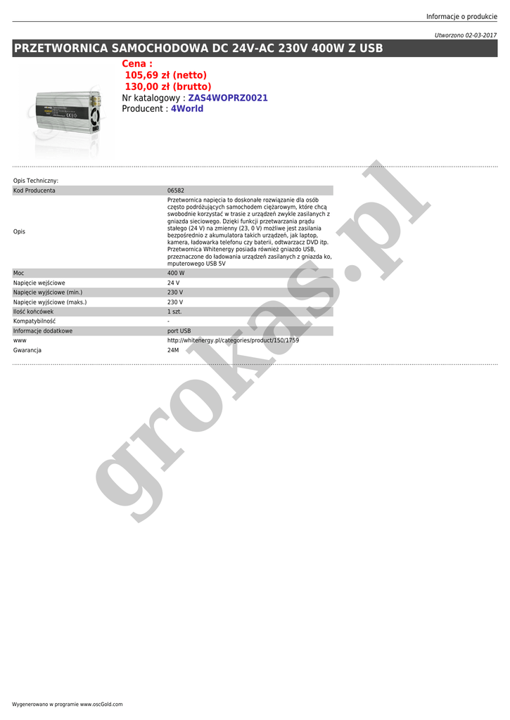 Informacje o produkcie Utworzono 02-03-2017 PRZETWORNICA SAMOCHODOWA DC 24V-AC 230V 400W Z USB Cena : 105,69 zł (netto) 130,00 zł (brutto) Nr katalogowy : ZAS4WOPRZ0021 Producent : 4World Opis Techniczny: 06582 Opis Przetwornica napięcia to doskonałe rozwiązanie dla osób często podróżujących samochodem ciężarowym, które chcą swobodnie korzystać w trasie z urządzeń zwykle zasilanych z gniazda sieciowego. Dzięki funkcji przetwarzania prądu stałego (24 V) na zmienny (23, 0 V) możliwe jest zasilania bezpośrednio z akumulatora takich urządzeń, jak laptop, kamera, ładowarka telefonu czy baterii, odtwarzacz DVD itp. Przetwornica Whitenergy posiada również gniazdo USB, przeznaczone do ładowania urządzeń zasilanych z gniazda ko, mputerowego USB 5V Moc 400 W Napięcie wejściowe 24 V Napięcie wyjściowe (min.) 230 V Napięcie wyjściowe (maks.) 230 V Ilość końcówek 1 szt. Kompatybilność - Informacje dodatkowe port USB www http://whitenergy.pl/categories/product/150/1759 Gwarancja 24M gr ok as .p l Kod Producenta Wygenerowano w programie www.oscGold.com