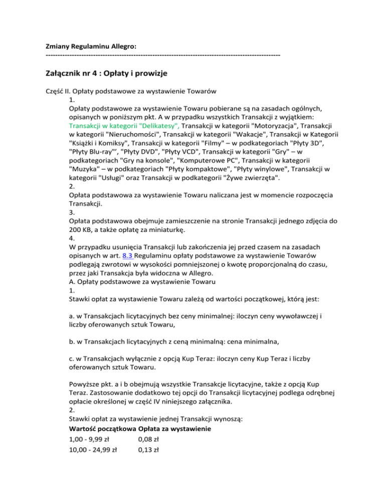 Zmiany Regulaminu Allegro: --------------------------------------------------------------------------------------------------- Załącznik nr 4 : Opłaty i prowizje Część II. Opłaty podstawowe za wystawienie Towarów 1. Opłaty podstawowe za wystawienie Towaru pobierane są na zasadach ogólnych, opisanych w poniższym pkt. A w przypadku wszystkich Transakcji z wyjątkiem: Transakcji w kategorii "Delikatesy", Transakcji w kategorii "Motoryzacja", Transakcji w kategorii "Nieruchomości", Transakcji w kategorii "Wakacje", Transakcji w Kategorii "Książki i Komiksy", Transakcji w kategorii "Filmy" – w podkategoriach "Płyty 3D", "Płyty Blu-ray"’, "Płyty DVD", "Płyty VCD", Transakcji w kategorii "Gry" – w podkategoriach "Gry na konsole", "Komputerowe PC", Transakcji w kategorii "Muzyka" – w podkategoriach "Płyty kompaktowe", "Płyty winylowe", Transakcji w kategorii "Usługi" oraz Transakcji w podkategorii "Żywe zwierzęta". 2. Opłata podstawowa za wystawienie Towaru naliczana jest w momencie rozpoczęcia Transakcji. 3. Opłata podstawowa obejmuje zamieszczenie na stronie Transakcji jednego zdjęcia do 200 KB, a także opłatę za miniaturkę. 4. W przypadku usunięcia Transakcji lub zakończenia jej przed czasem na zasadach opisanych w art. 8.3 Regulaminu opłaty podstawowe za wystawienie Towarów podlegają zwrotowi w wysokości pomniejszonej o kwotę proporcjonalną do czasu, przez jaki Transakcja była widoczna w Allegro. A. Opłaty podstawowe za wystawienie Towaru 1. Stawki opłat za wystawienie Towaru zależą od wartości początkowej, którą jest: a. w Transakcjach licytacyjnych bez ceny minimalnej: iloczyn ceny wywoławczej i liczby oferowanych sztuk Towaru, b. w Transakcjach licytacyjnych z ceną minimalną: cena minimalna, c. w Transakcjach wyłącznie z opcją Kup Teraz: iloczyn ceny Kup Teraz i liczby oferowanych sztuk Towaru. Powyższe pkt. a i b obejmują wszystkie Transakcje licytacyjne, także z opcją Kup Teraz. Zastosowanie dodatkowo tej opcji do Transakcji licytacyjnej podlega odrębnej opłacie określonej w część IV niniejszego załącznika. 2. Stawki opłat za wystawienie jednej Transakcji wynoszą: Wartość początkowa Opłata za wystawienie 1,00 - 9,99 zł 0,08 zł 10,00 - 24,99 zł 0,13 zł 25,00 - 49,99 zł 50,00 - 249,99 zł 250 zł i więcej 0,25 zł 0,50 zł 1,00 zł 3. W przypadku podwyższenia w trakcie trwania Transakcji ceny minimalnej lub ceny Kup Teraz bądź liczby sprzedawanych sztuk Towarów opłata ulega odpowiedniemu podwyższeniu. 4. W przypadku obniżenia w trakcie trwania Transakcji ceny Kup Teraz bądź liczby sprzedawanych sztuk Towaru obniżenie opłaty i zwrot różnicy kosztów następuje wyłącznie w sytuacji, gdy obniżenie nastąpiło przed upływem 12 godzin od rozpoczęcia Transakcji. B. Opłaty podstawowe za wystawienie maszyny rolniczej, maszyny budowlanej, łodzi, przyczepy, naczepy, wózka widłowego lub pojazdu innego niż nowy motocykl bądź nowy quad w kategorii "Motoryzacja" 1. Opłata ma charakter ryczałtowy, tzn. jest stała niezależnie od wartości wystawionego pojazdu czy ustalonych cen. 2. Stawki opłat za wystawienie jednej Transakcji wynoszą: Opłata za Kategoria wystawienie "Samochody" oraz "Maszyny rolnicze" 25,00 zł "Motocykle i quady" (dotyczy wyłącznie motocykli i quadów używanych)", "Inne pojazdy i łodzie", "Przyczepy, naczepy" oraz 15,00 zł "Wózki widłowe" "Maszyny budowlane" z wyjątkiem wózków widłowych 30,00 zł C. Opłaty podstawowe za wystawienie Towaru w kategorii "Nieruchomości" Opłata za wystawienie Towaru w kategorii "Nieruchomości" ma charakter ryczałtowy, tzn. jest stała niezależnie od wartości wystawionego Towaru czy ustalonych cen i wynosi 20,00 zł za wyjątkiem kategorii „Pokoje do wynajęcia”, „Gotowe domy bez działki” oraz „Garaże i miejsca postojowe”, w których opłata wynosi 5,00 zł oraz kategorii „Projekty domów”, w której opłata wynosi 3,00 zł. D. Opłaty podstawowe za wystawienie Towaru w kategorii "Wakacje" Opłata za wystawienie Towaru w kategorii "Wakacje" ma charakter ryczałtowy, tzn. jest stała niezależnie od wartości wystawionego Towaru czy ustalonych cen i wynosi 15,00 zł. E. Opłaty podstawowe za wystawienie Towaru w kategoriach "Książki i Komiksy", Transakcji w kategorii "Filmy" – w podkategoriach "Płyty 3D", "Płyty Blu-ray"’, "Płyty DVD", "Płyty VCD", Transakcji w kategorii "Gry" – w podkategoriach "Gry na konsole", "Komputerowe PC", Transakcji w kategorii "Muzyka" – w podkategoriach "Płyty kompaktowe", "Płyty winylowe". Stawki opłat za wystawienie Towaru w kategoriach "Książki i Komiksy", Transakcji w kategorii "Filmy" – w podkategoriach "Płyty 3D", "Płyty Blu-ray"’, "Płyty DVD", "Płyty VCD", Transakcji w kategorii "Gry" – w podkategoriach "Gry na konsole", "Komputerowe PC", Transakcji w kategorii "Muzyka" – w podkategoriach "Płyty kompaktowe", "Płyty winylowe" wynoszą: Wartość początkowa Opłata za wystawienie 1,00 - 9,99 zł 0,05 zł 10,00 - 24,99 zł 0,08 zł 25,00 - 49,99 zł 0,10 zł 50,00 - 249,99 zł 0,15 zł 250 zł i więcej 0,20 zł F. Opłaty podstawowe za wystawienie Towaru w kategoriach "Usługi"* Opłata za wystawienie Towaru w kategoriach "Usługi" ma charakter ryczałtowy, tzn. jest stała niezależnie od wartości wystawionego Towaru czy ustalonych cen i wynosi 9,00 zł. *Przez kategorie „Usługi” rozumie się: a. Wszystkie podkategorie o nazwie „Usługi” w ramach kategorii „Antyki i Sztuka”; „Biżuteria i Zegarki”; „Delikatesy”; „Dziecko”; „Filmy”; „Fotografia”; „Gry”; „Instrumenty”; „Kolekcje”; „Komputery”; „Konsole i automaty”; „Książki i Komiksy”; „Motoryzacja”; „Muzyka”; „Odzież, Obuwie, Dodatki”; „Przemysł”; „RTV i AGD”; „Sport i Turystyka”; „Sprzęt estradowy, studyjny i DJ-ski”; „Telefony i Akcesoria”; „Uroda”; „Zdrowie”; b. Wszystkie podkategorie o 